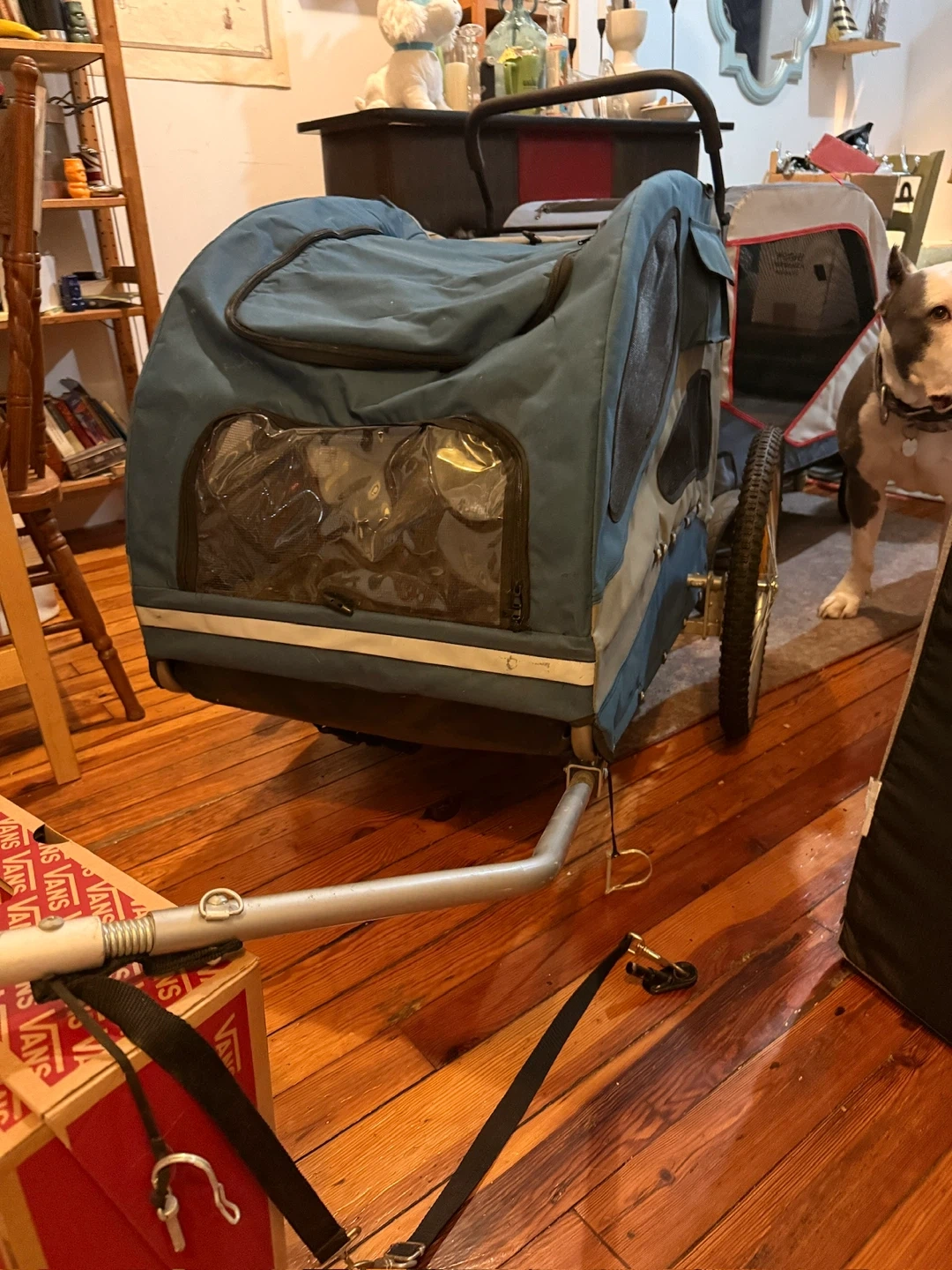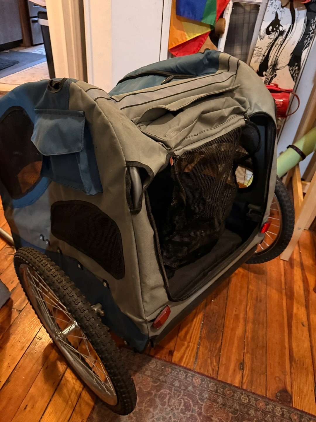 This pet trailer easily connects to a bicycle for pulling your furry friend. It features mesh windows for ventilation and visibility. Durable fabric construction.