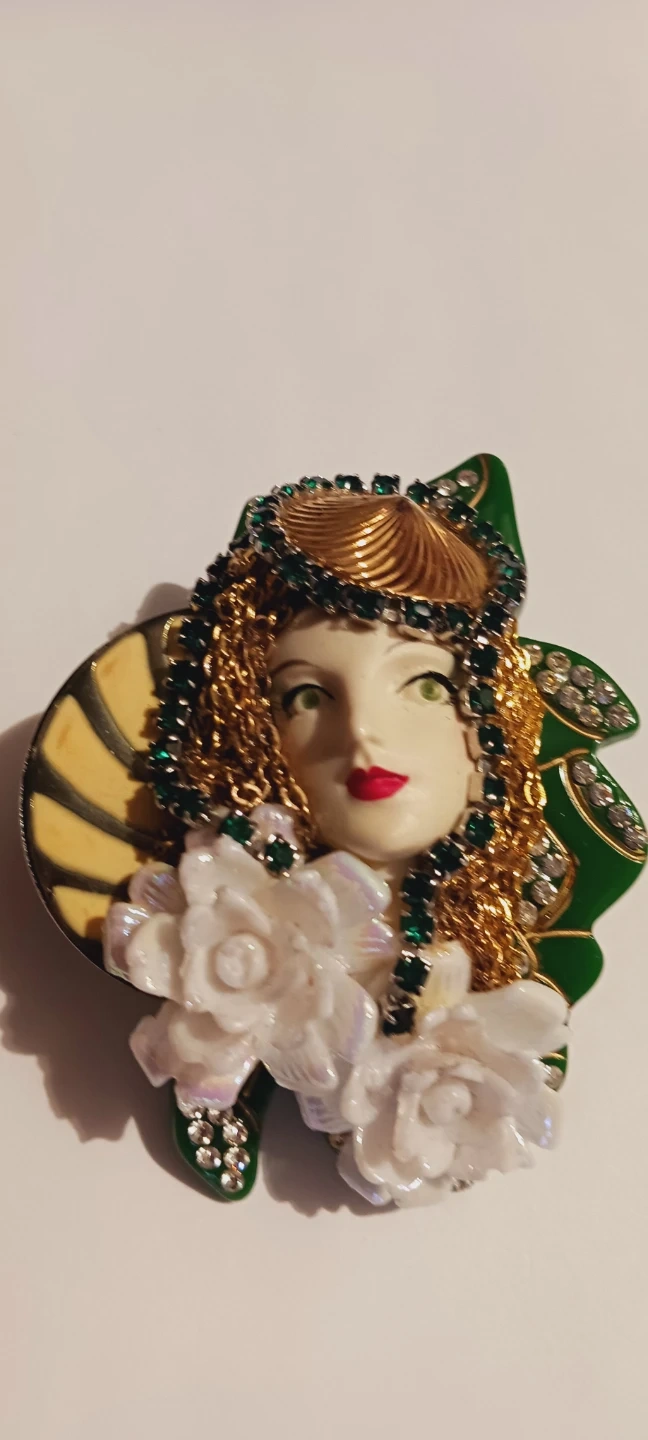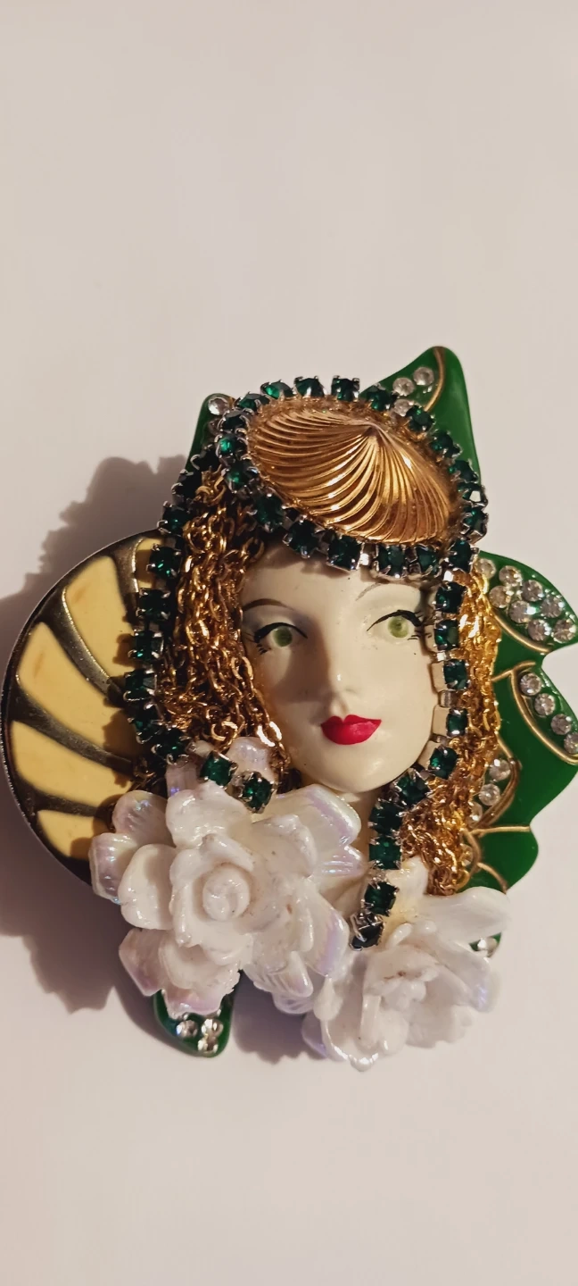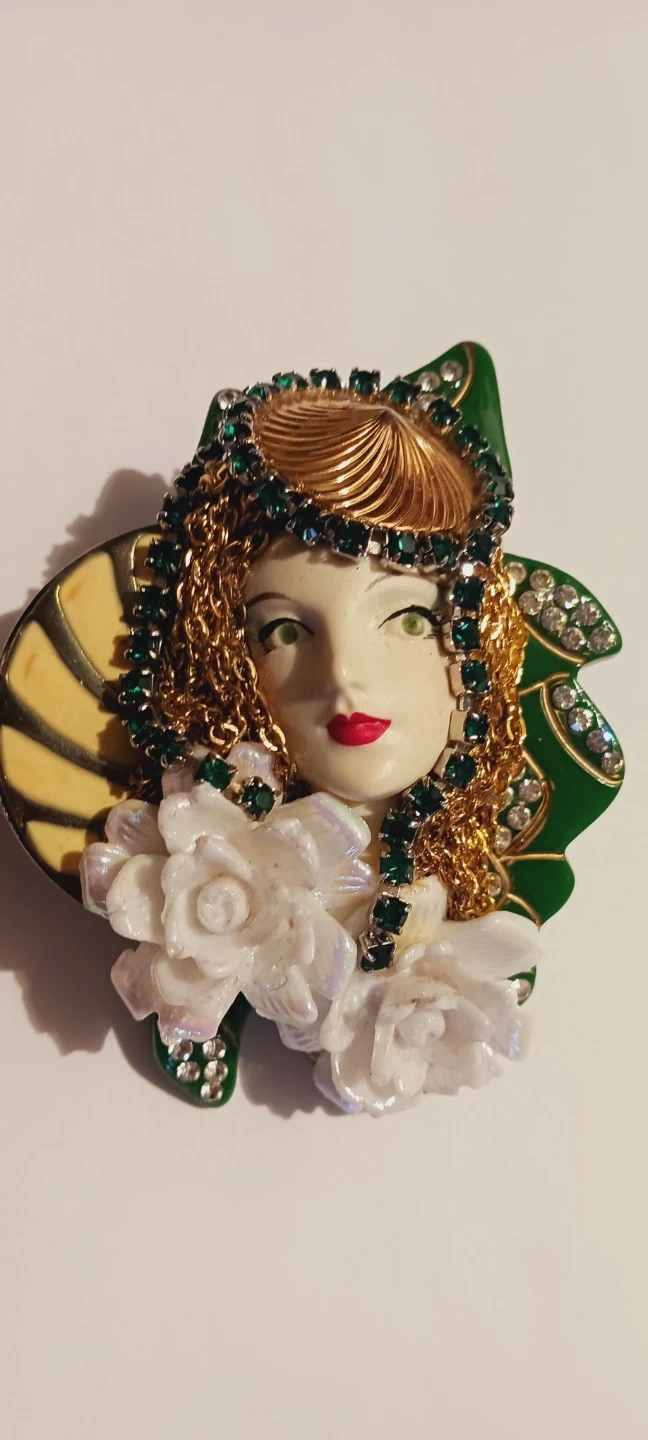 This vintage brooch features an Art Nouveau style woman's face adorned with gold chains and green rhinestones. It is signed on the back. It has white flowers and green leaf accents. This piece adds a unique touch to any outfit! Excellent condition. 3.5"×2.5". ALL MY PRICES ARE NEGOTIABLE !!