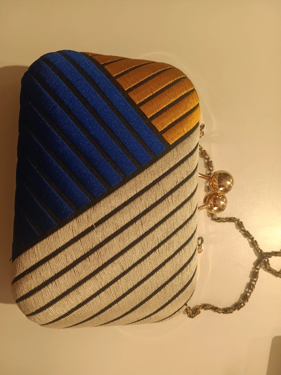 Selling a stylish Khaddi clutch. It features a unique design with blue, gold, and cream stripes. Perfect for adding a touch of elegance to any outfit!