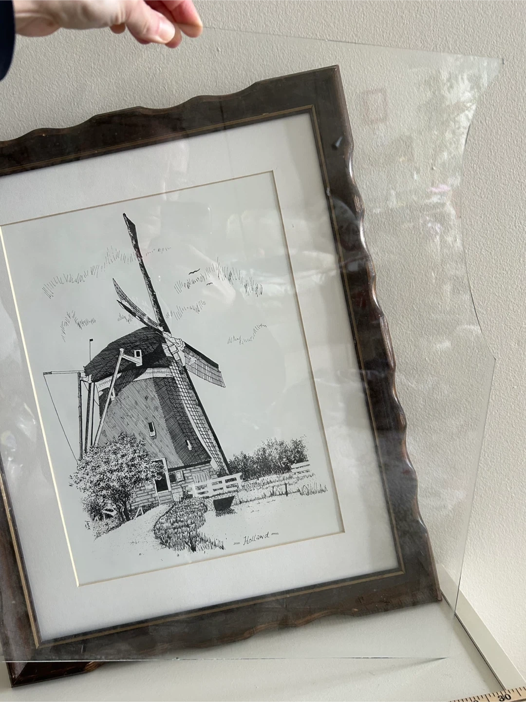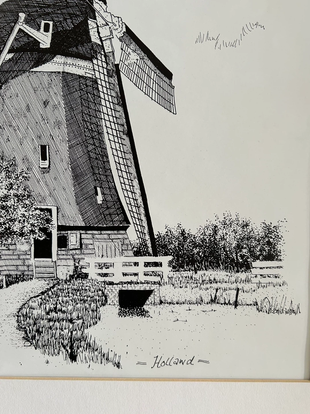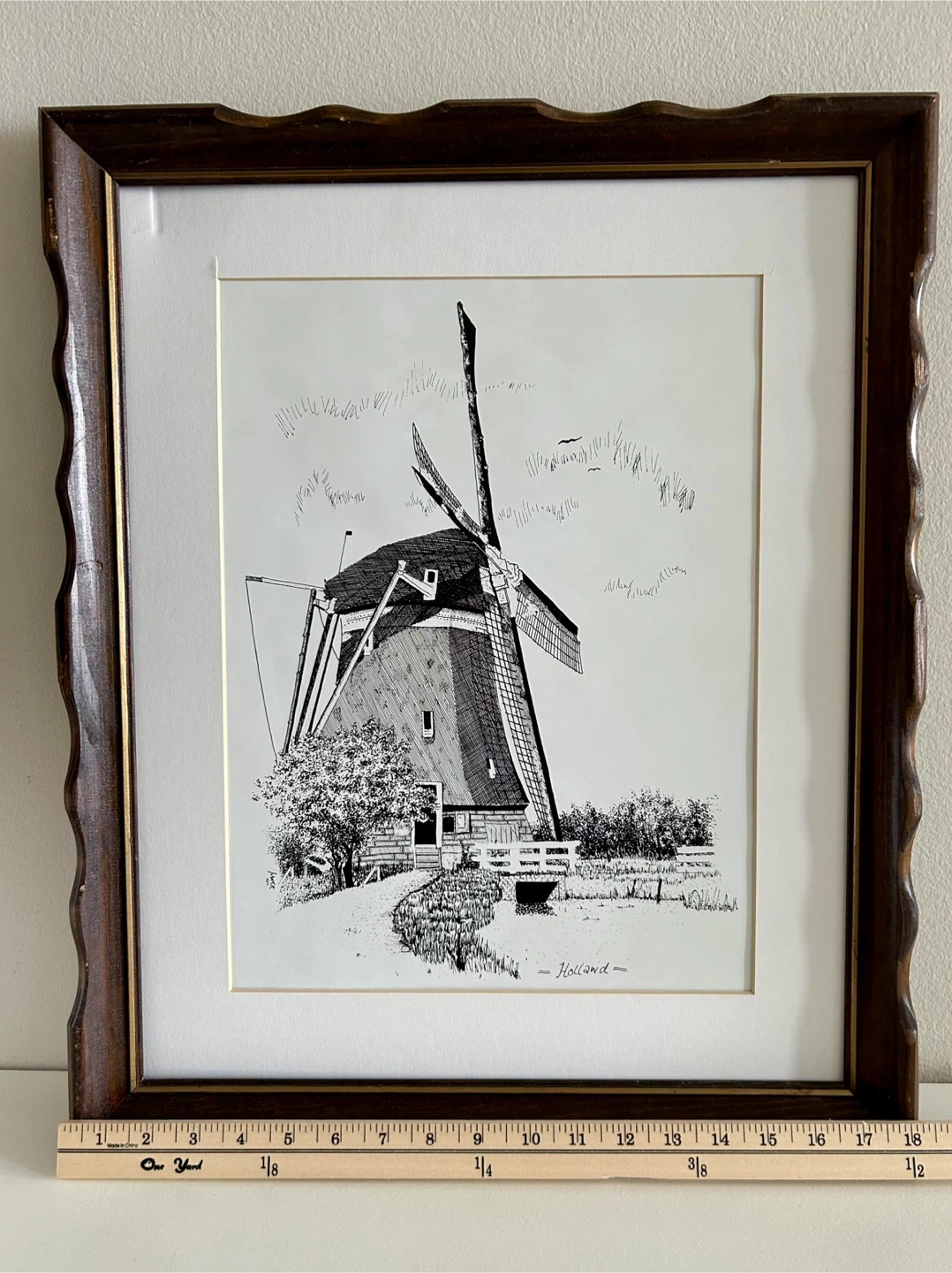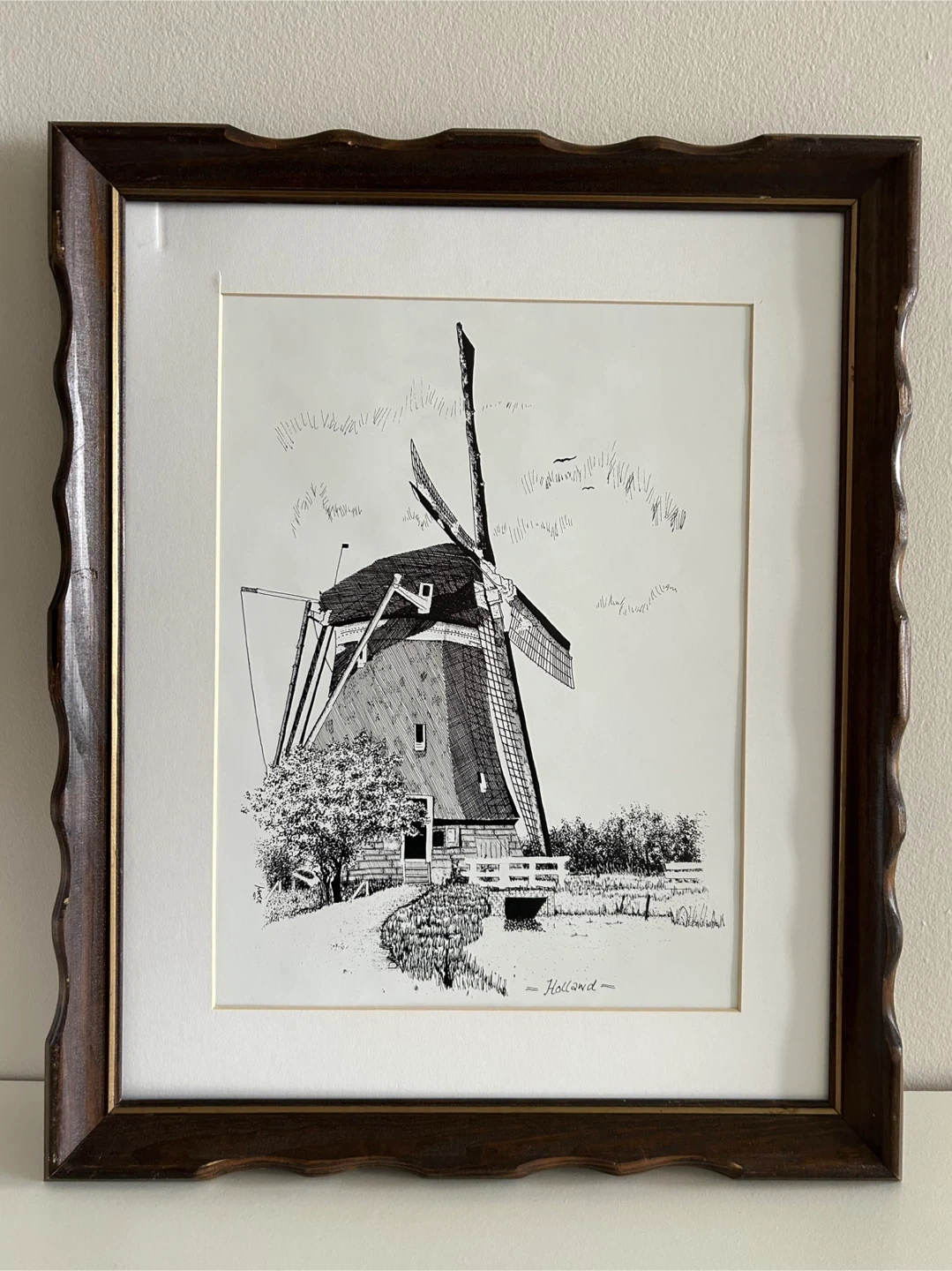 Framed ink drawing print featuring a windmill scene. The artwork is signed or titled "Holland". Wooden frame included. The glass from the frame broke so I took it out. I still have the glass if you want it but it is broken.