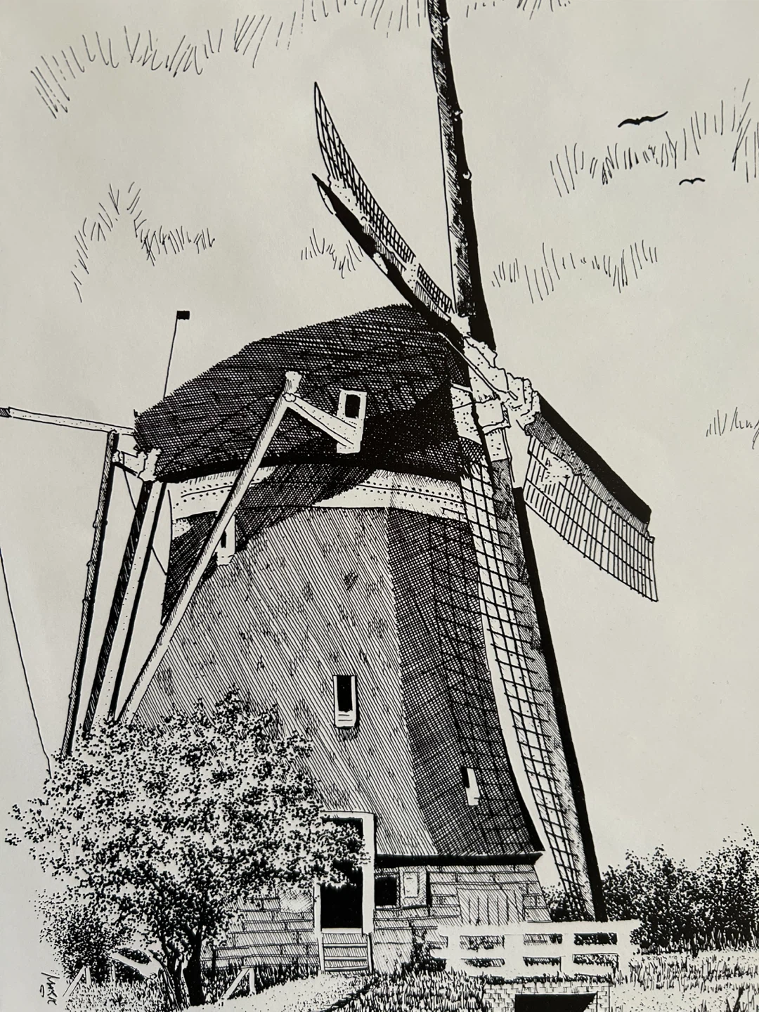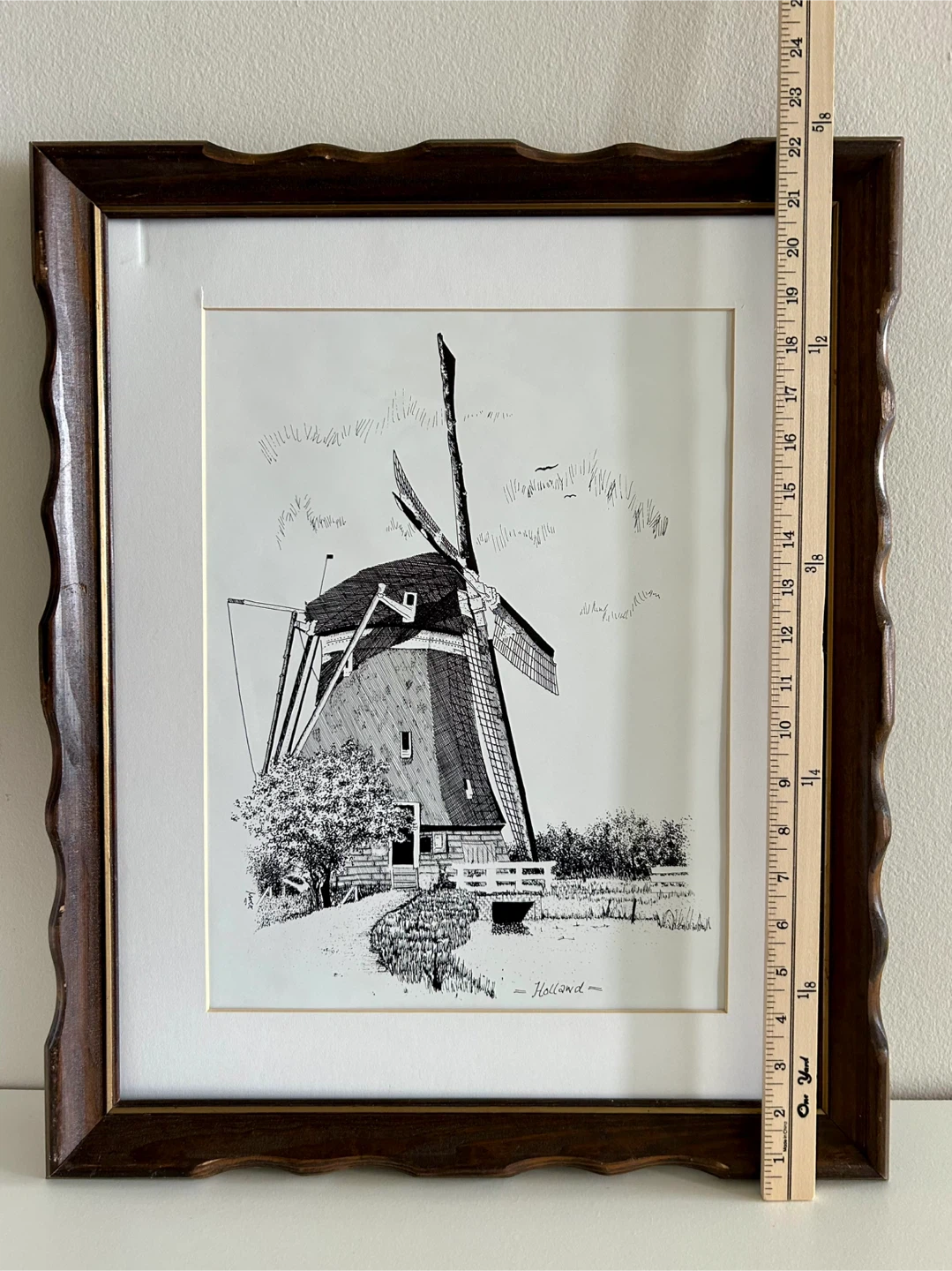 Framed ink drawing print featuring a windmill scene. The artwork is signed or titled "Holland". Wooden frame included. The glass from the frame broke so I took it out. I still have the glass if you want it but it is broken.