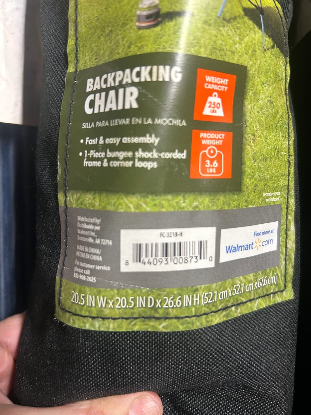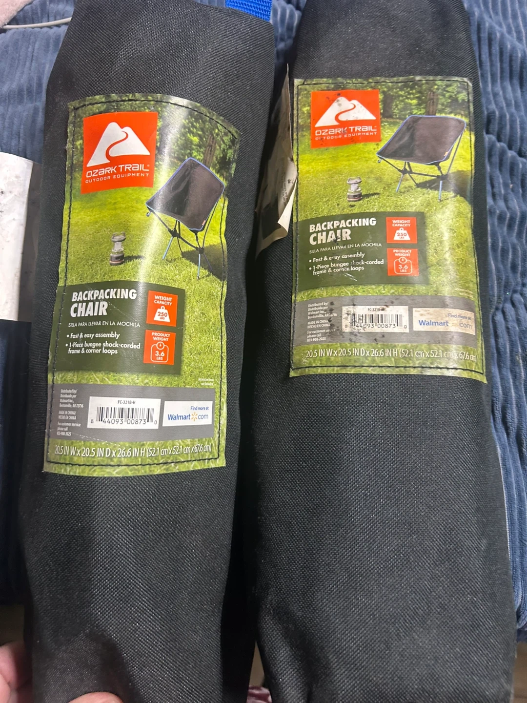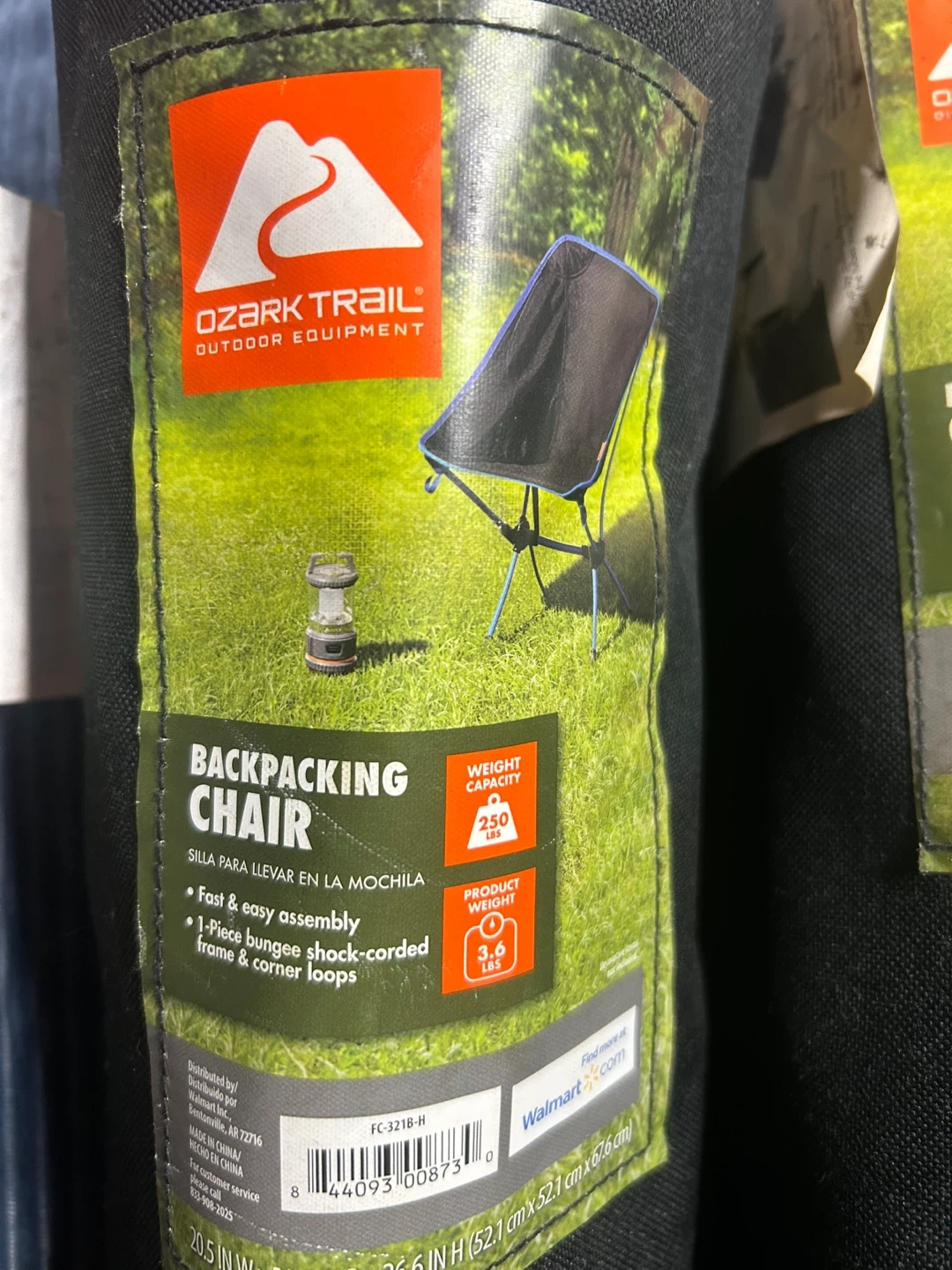 10Get ready for your next outdoor adventure with this Ozark Trail Backpacking Chair! It's designed for fast and easy assembly, featuring a 1-piece bungee shock-corded frame and corner loops. This chair is lightweight and portable, making it perfect for backpacking trips. It supports a weight capacity of 250 lbs and weighs only 3.6 lbs. Dimensions are 20.5 in W x 20.5 in D x 26.6 in H (52.1 cm x 52.1 cm x 67.6 cm)