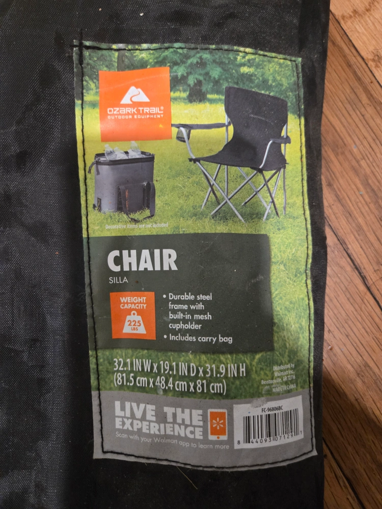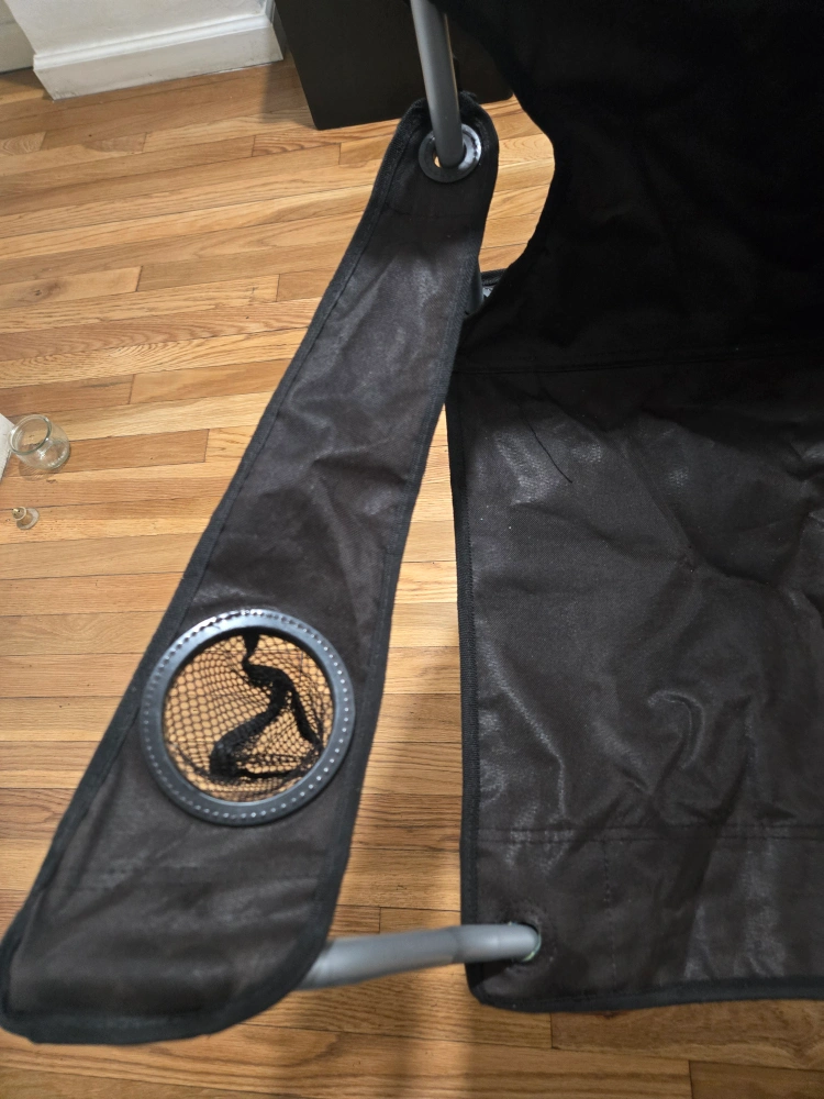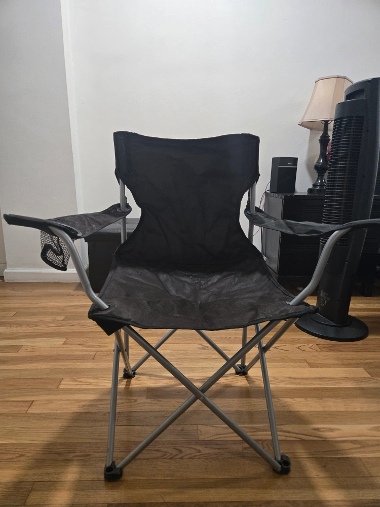 144A folding chair with a mesh cup holder. Great for relaxing on a warm summer day with a cold drink. Includes a carry bag.