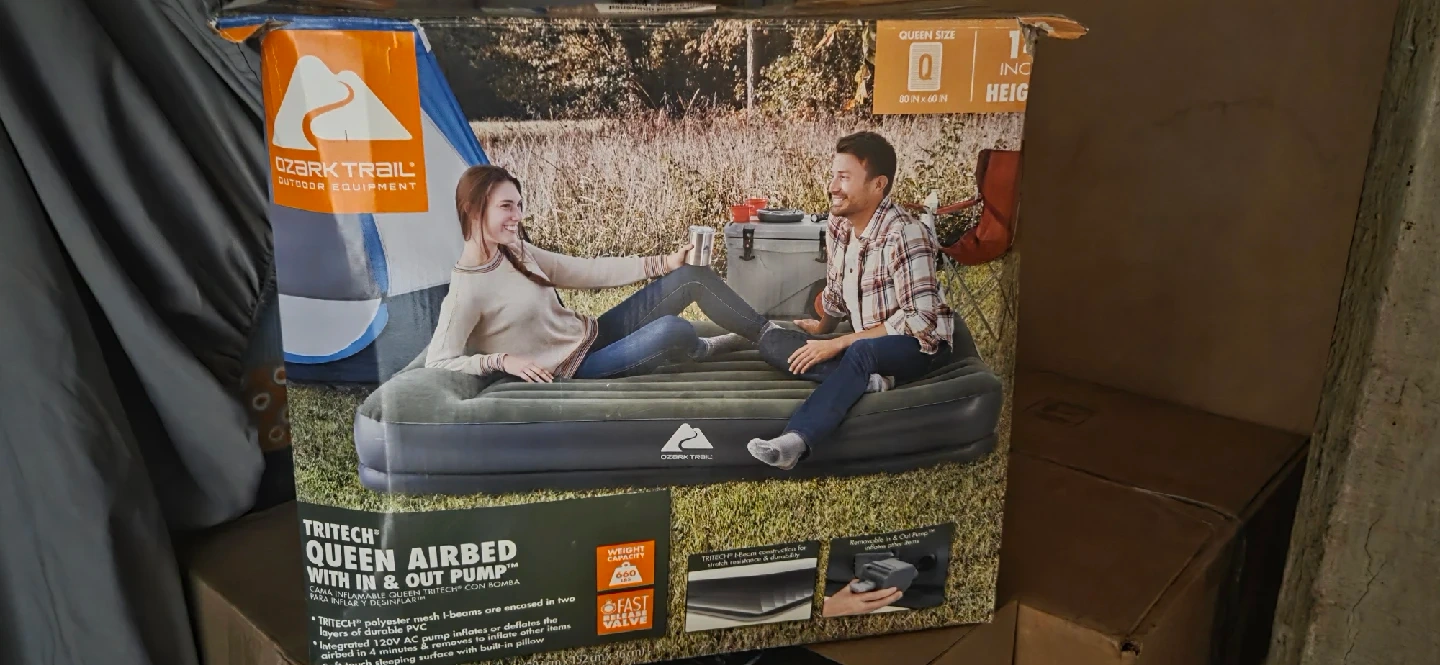72Selling a brand new Ozark Trail Queen Airbed with built-in pump! It's still in the original box and has never been used. - Features a TriTech polyester mesh with two layers of durable PVC - Integrated 120V AC pump inflates and deflates in 4 minutes - Comfortable sleeping surface with a built-in pillow - Supports up to 660 lbs - Queen size: 80 in x 60 in x 18 in height