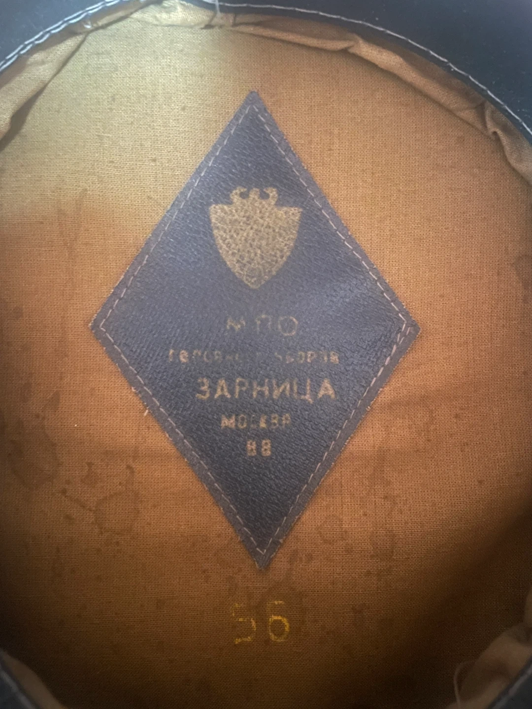 This is a military-style hat with red and brown accents. It features gold braiding and a star emblem. The interior tag reads 'ZARNITSA MOSKVA 88' indicating its origin and manufacturing year. Hat size is 56.