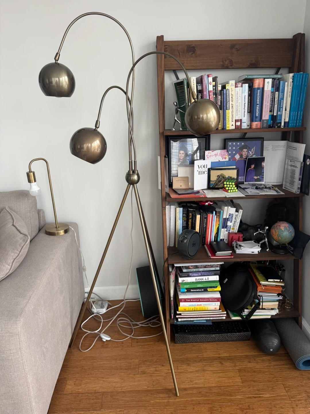 This arc floor lamp features three adjustable globe-shaped shades. It's made of metal with a brass finish and has a tripod base. The lamp provides ambient lighting and a touch of modern style to any room.