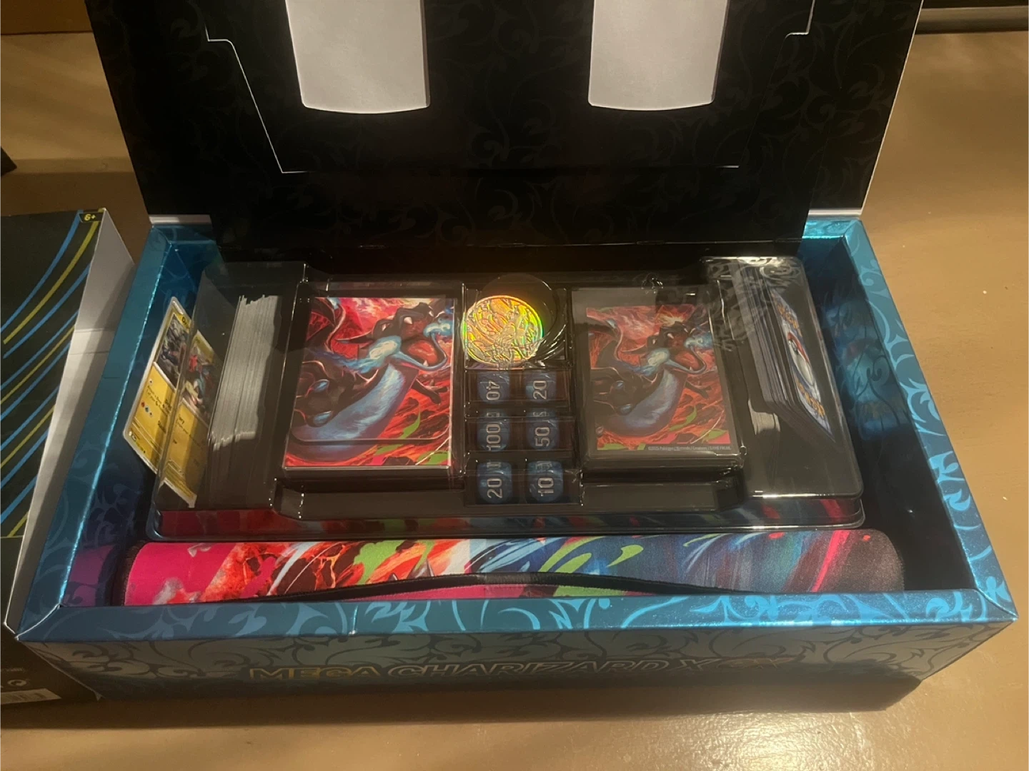 This Pokemon Trading Card Game box features Mega Charizard EX. It includes card sleeves, dice, and a coin. Contents are sealed and ready for play! Doesn’t include the booster packs! Just the commun and uncommon cards!
