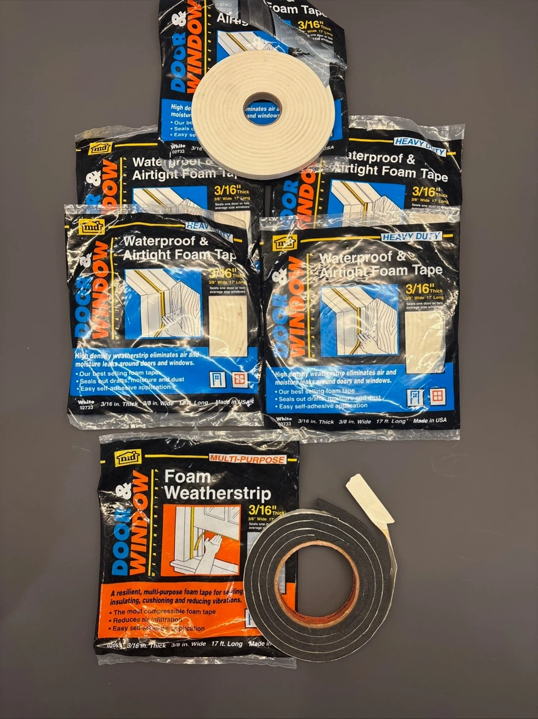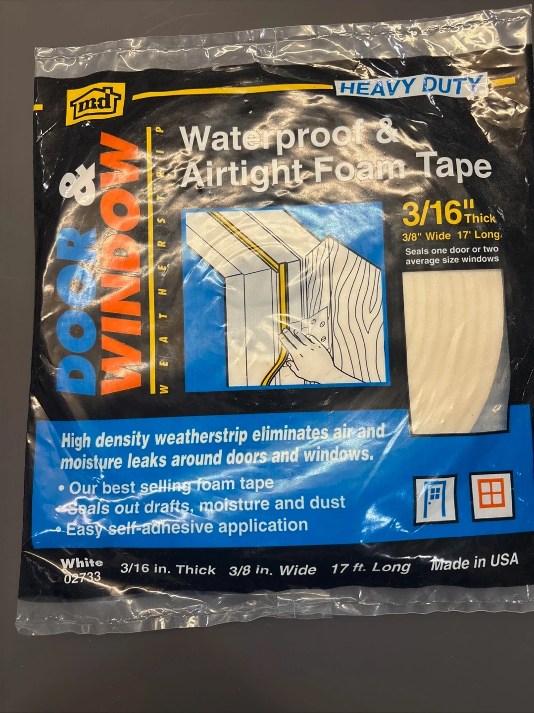 High density weatherstrip eliminates air and moisture leaks around doors and windows. It's made of foam tape and features easy self-adhesive application. The tape is 3/16 inch thick, 3/8 inch wide, and 17 ft. long. Seals out drafts, moisture, and dust!