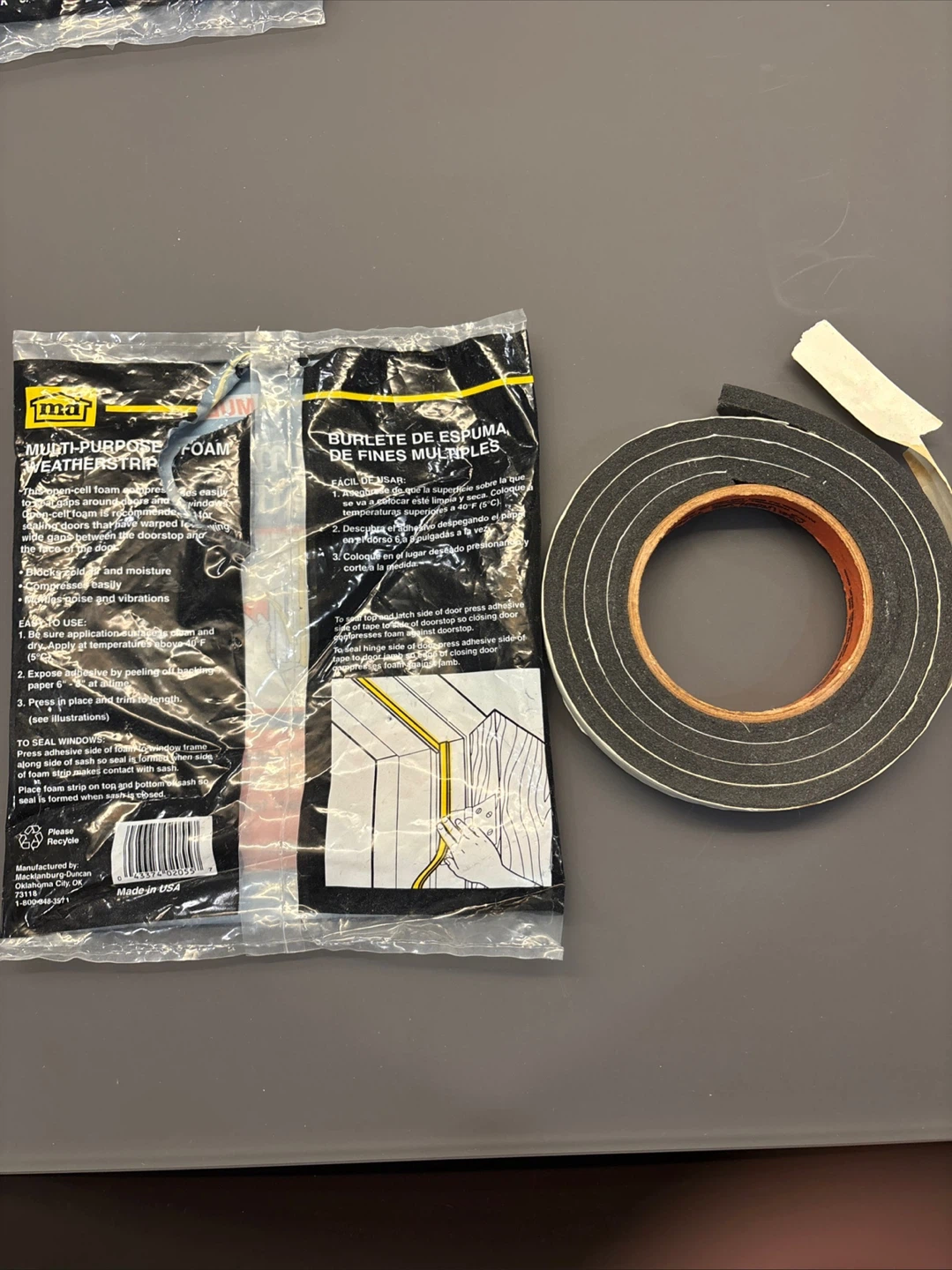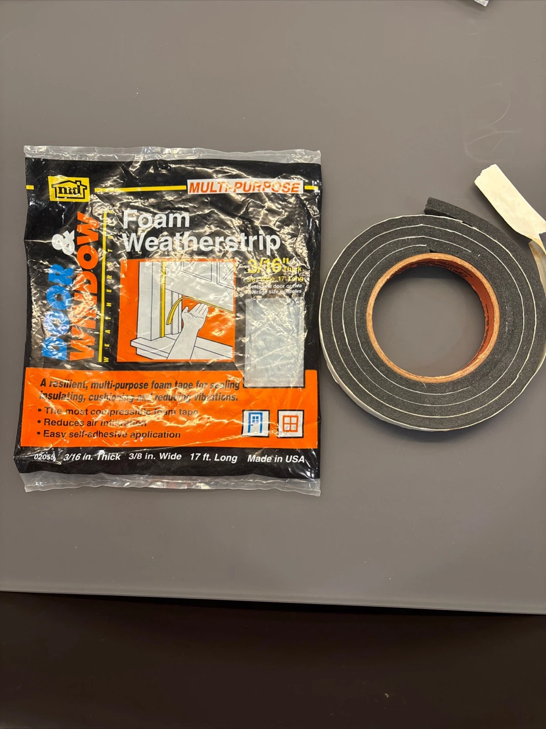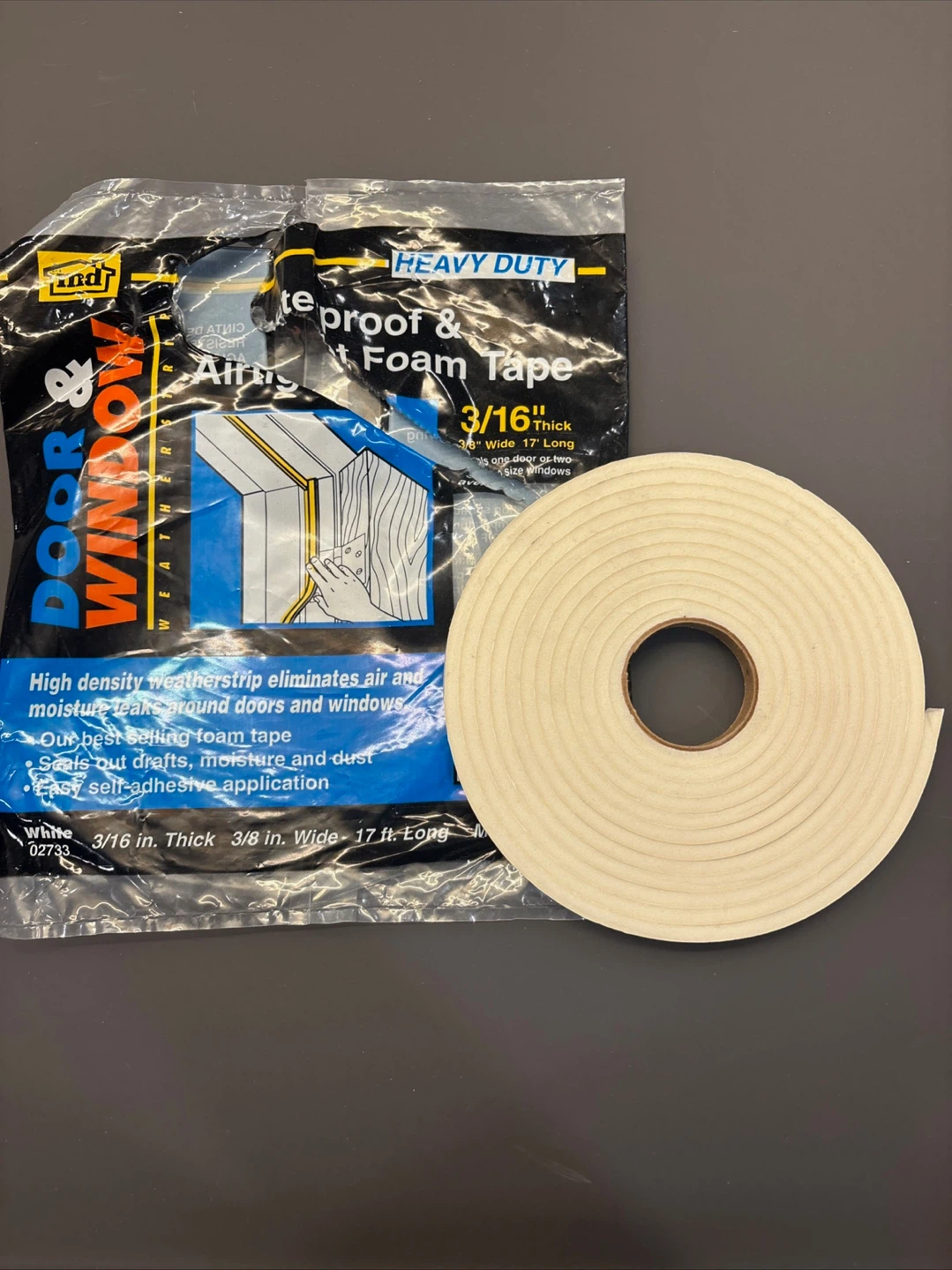 High density weatherstrip eliminates air and moisture leaks around doors and windows. It's made of foam tape and features easy self-adhesive application. The tape is 3/16 inch thick, 3/8 inch wide, and 17 ft. long. Seals out drafts, moisture, and dust!