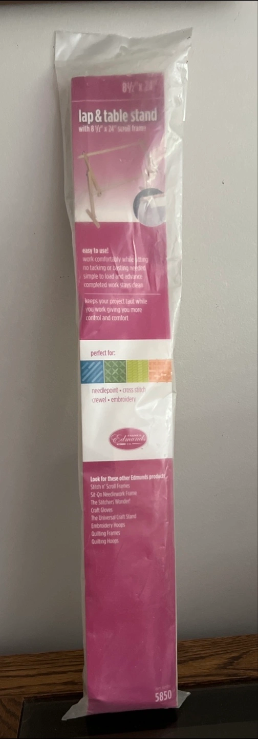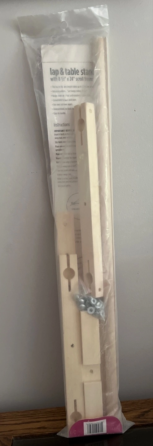 I'm selling an Edmunds lap and table stand that comes with an 8 1/2" x 24" scroll frame. It's easy to use and supports any width, letting you do your stitching, tacking, or basting without needing any extra tools. The completed work stays clean and your project stays taut, giving you more control and comfort Open box New
