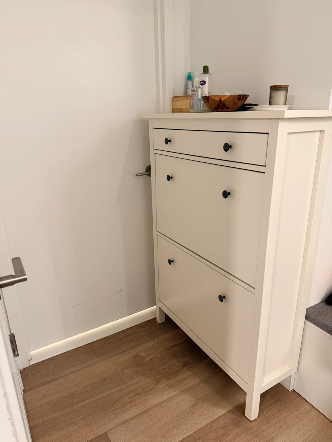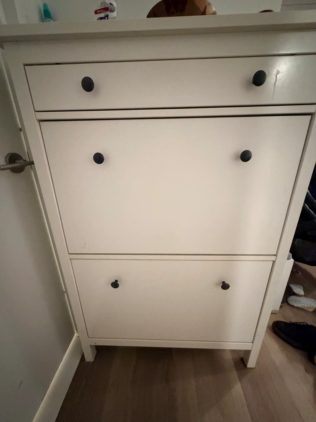 Selling a white IKEA Hemnes shoe cabinet. It’s in great condition and perfect for keeping your entryway organized! Has two compartments for shoes and a small drawer up top for other items