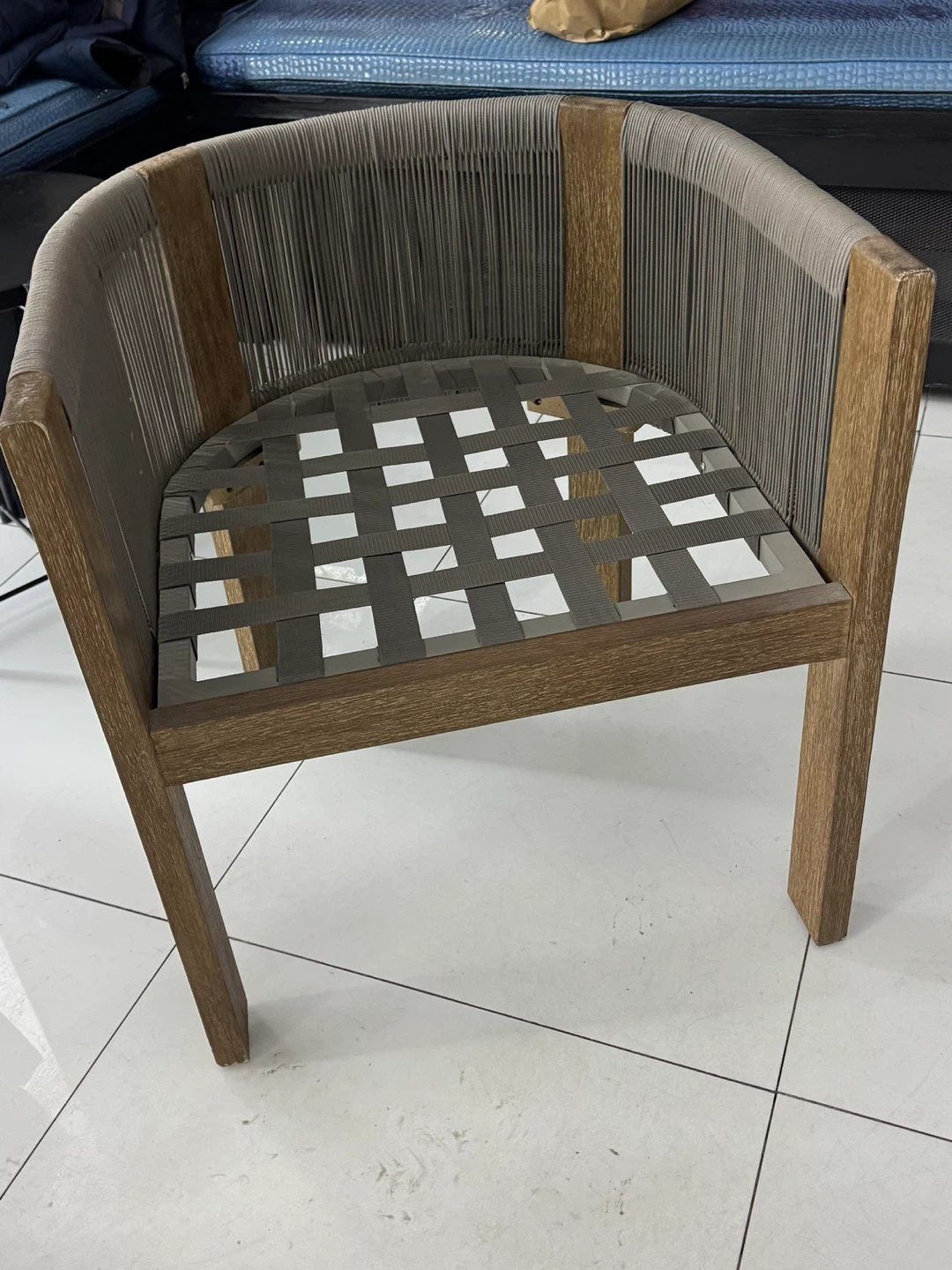 Wooden armchair featuring a woven rope seat and backrest. The frame is made of natural wood with a grey rope detail. It's a modern accent chair for any indoor or outdoor living space.