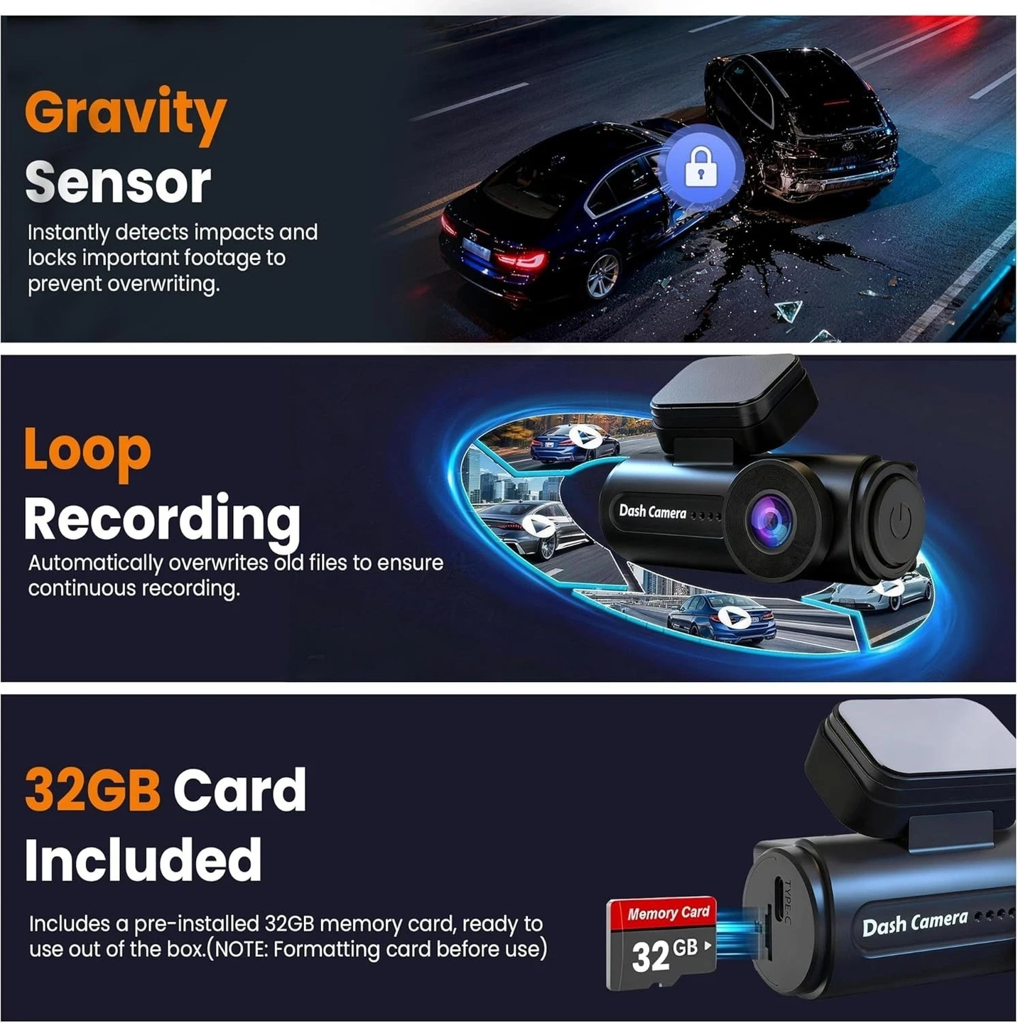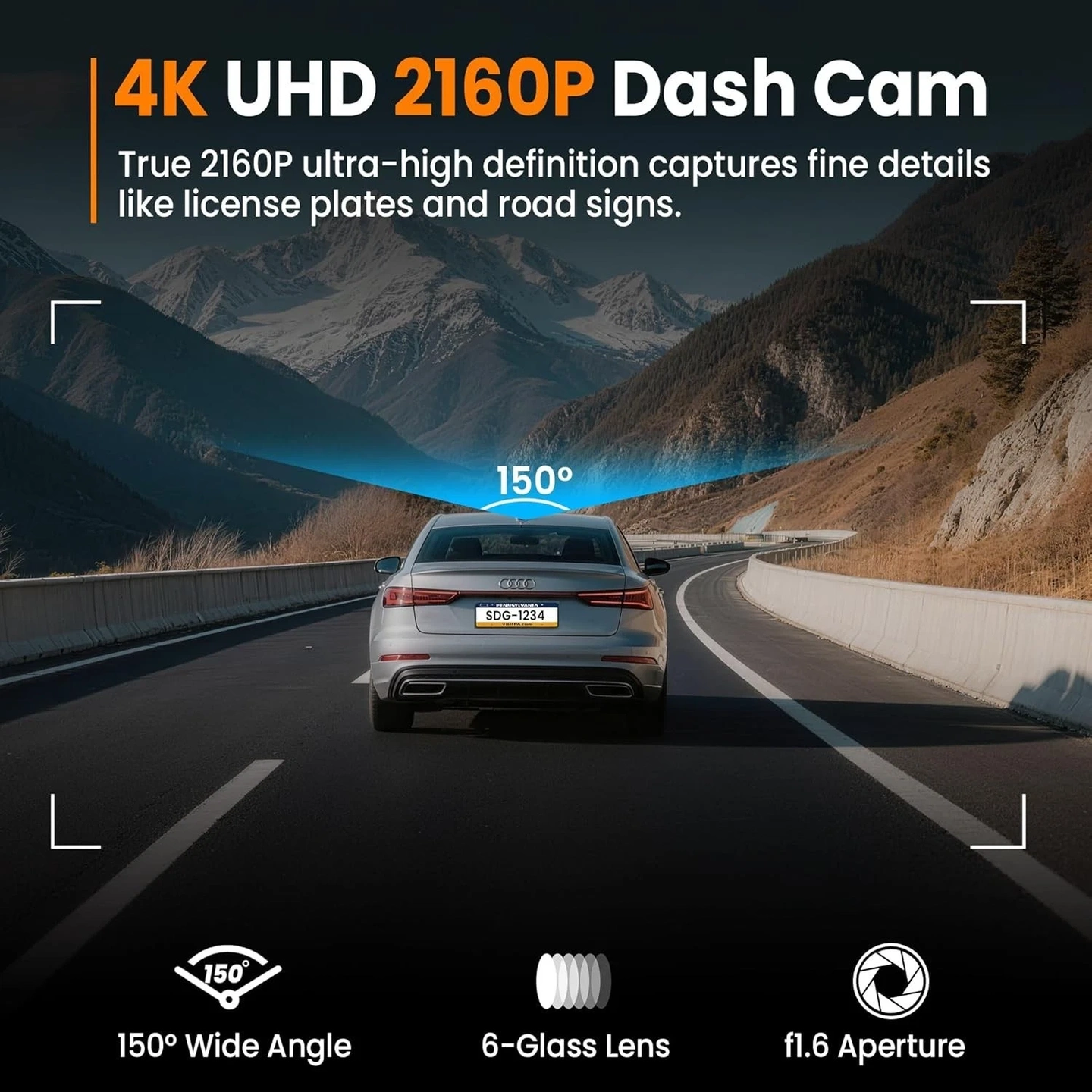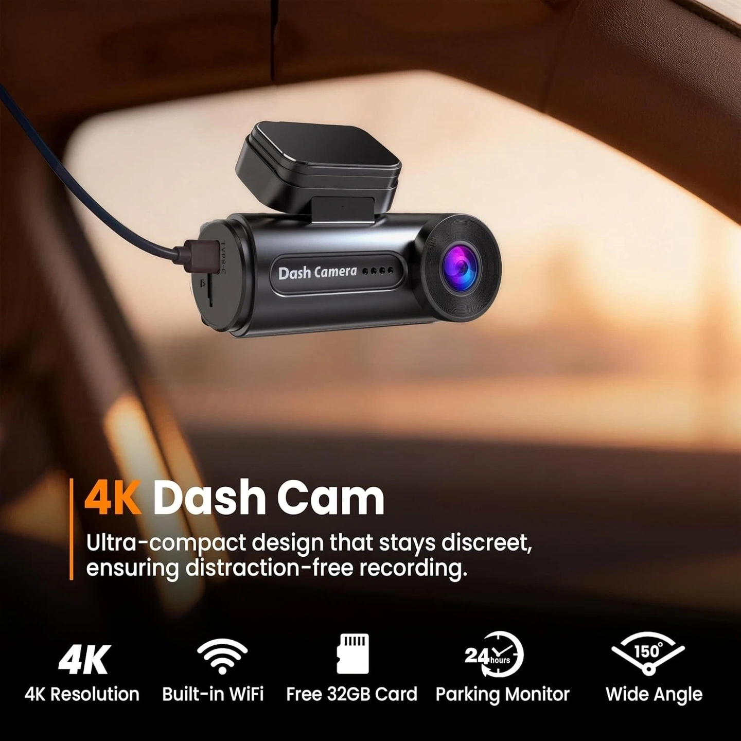 4K Dash Cam for cars with built-in WiFi. Includes 32GB card and installation tool. Features 4 cameras, 4000p video resolution, WDR, and a 150-degree field of view. Universal compatibility.