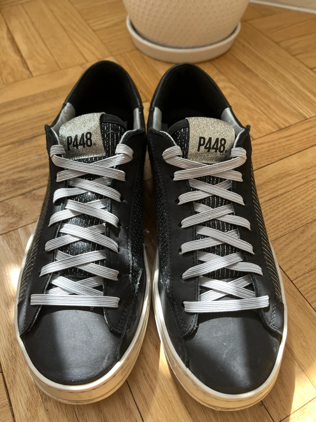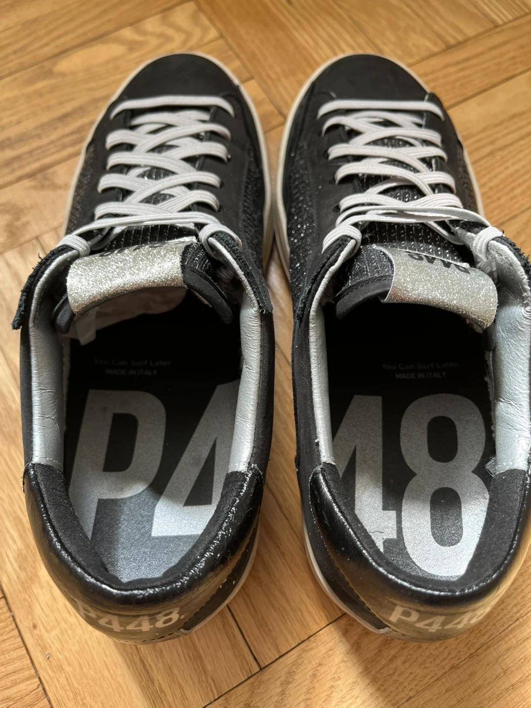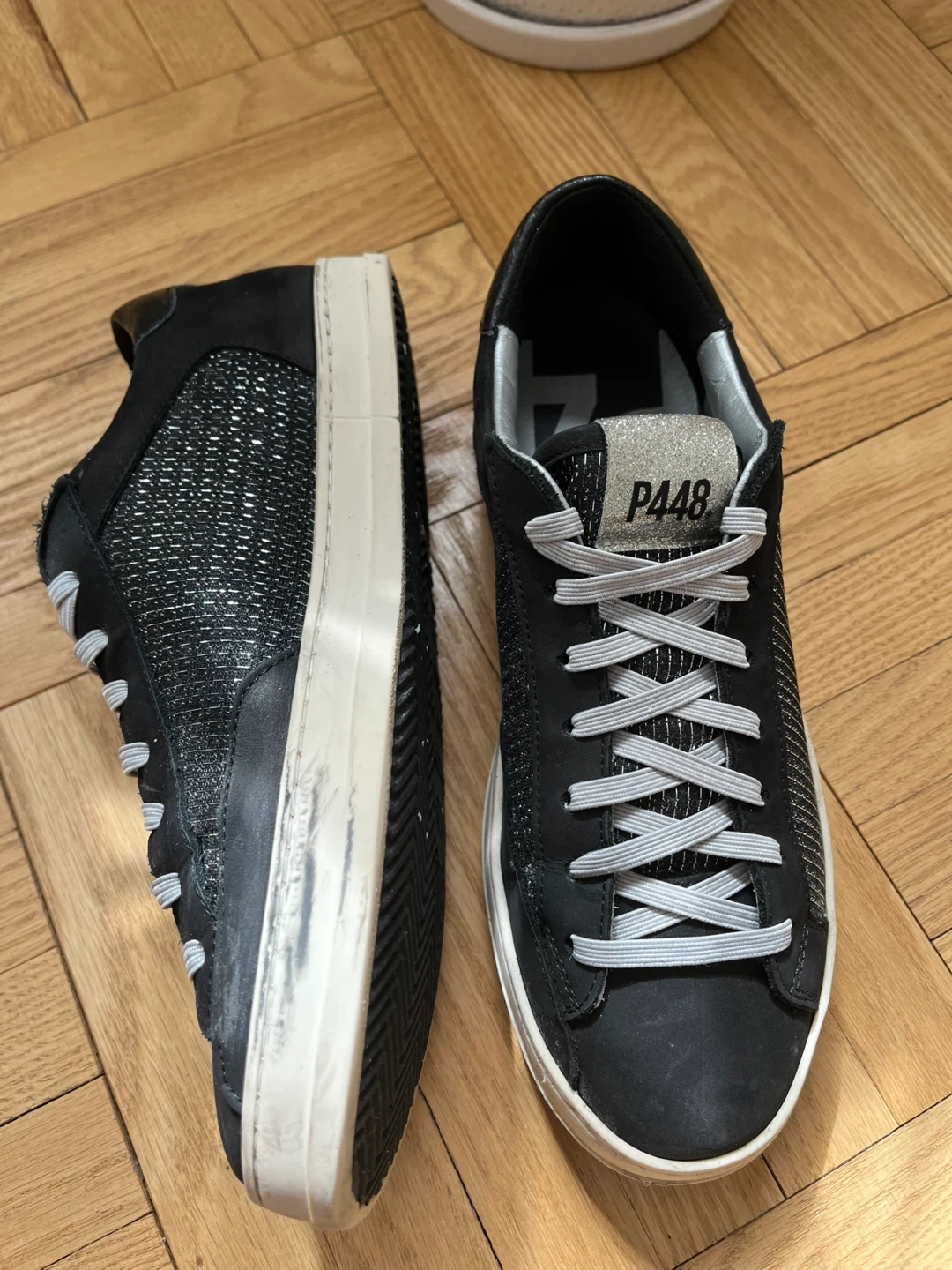 Step out in style with these P448 women’s sneakers. Featuring a sleek navy blue and silver sparkling design, these shoes offer both comfort and fashion. Perfect for any casual outing.
