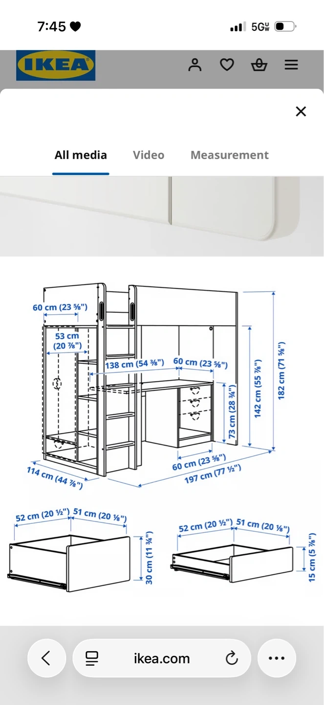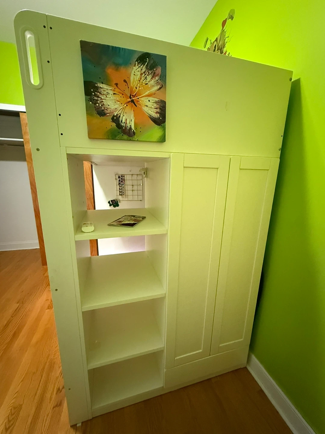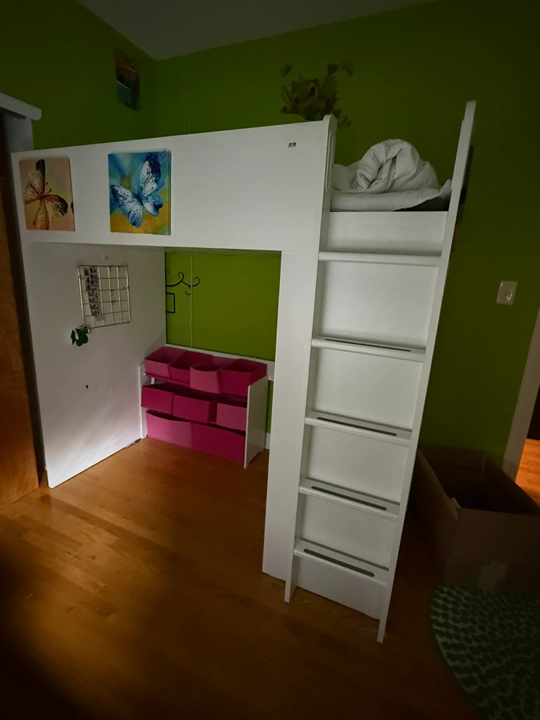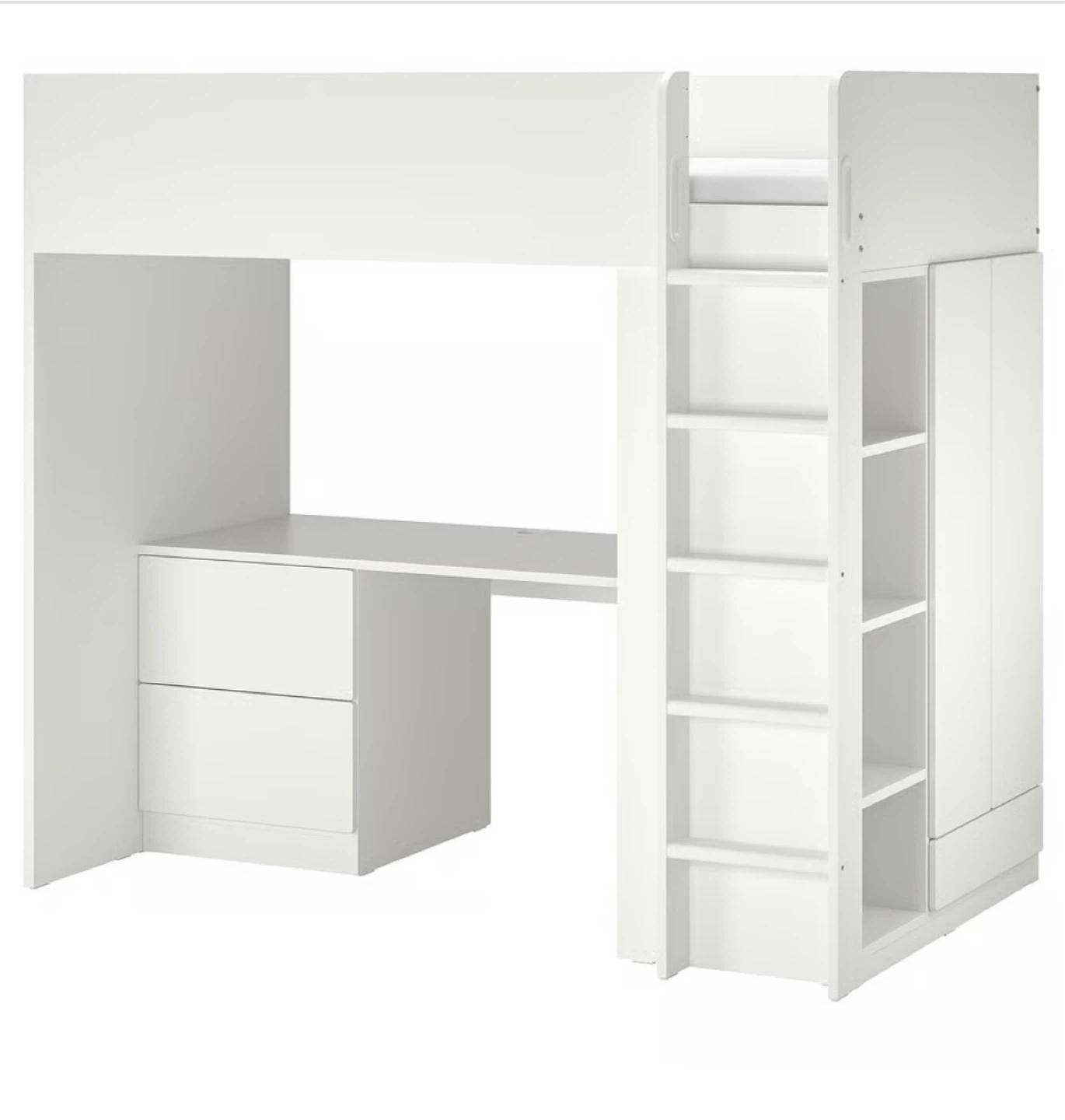 White loft bed featuring a built-in desk and storage drawers. Includes shelves and a cabinet for ample space. Perfect for optimizing a child's room! Desk is new and still in packaging.