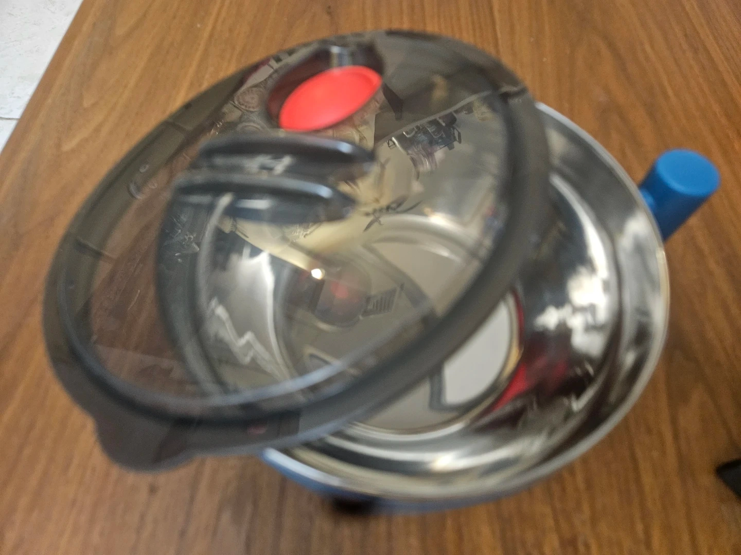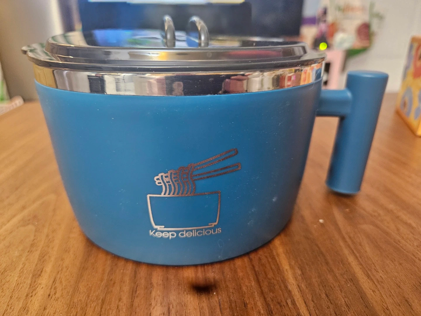 This insulated bowl keeps food warm. It's made of stainless steel with a blue outer shell and a clear lid. Includes a handle for easy carrying.