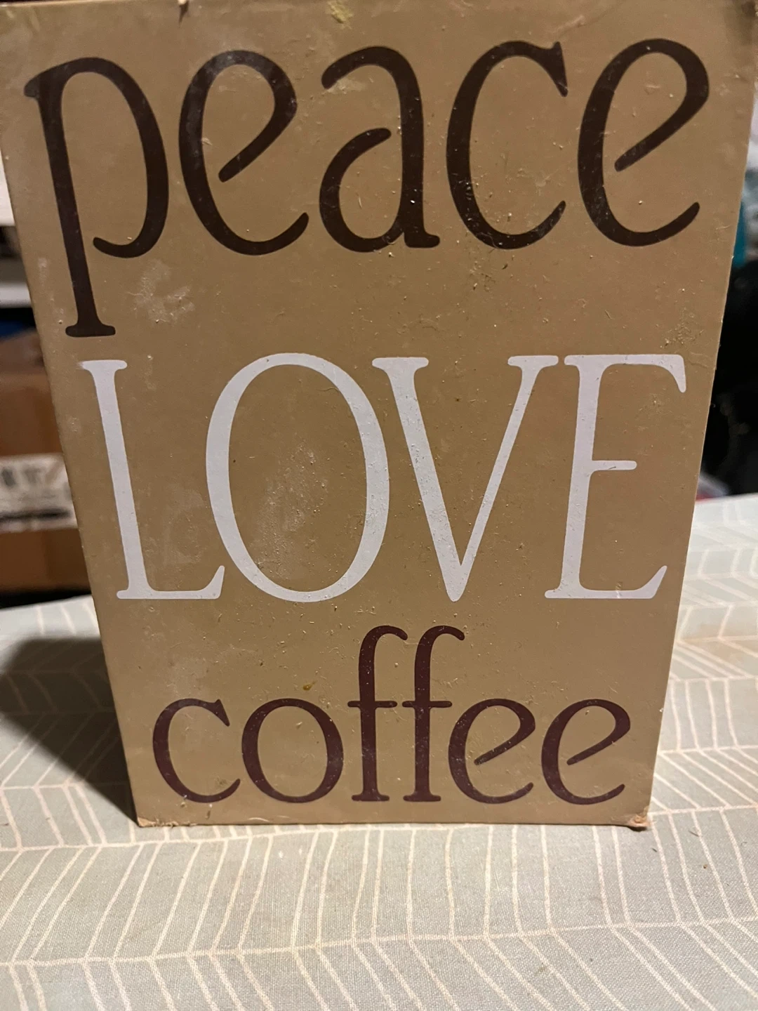 Wooden sign with 'peace love coffee' text. Brown and white lettering on a tan background. It's a decorative piece for coffee lovers!