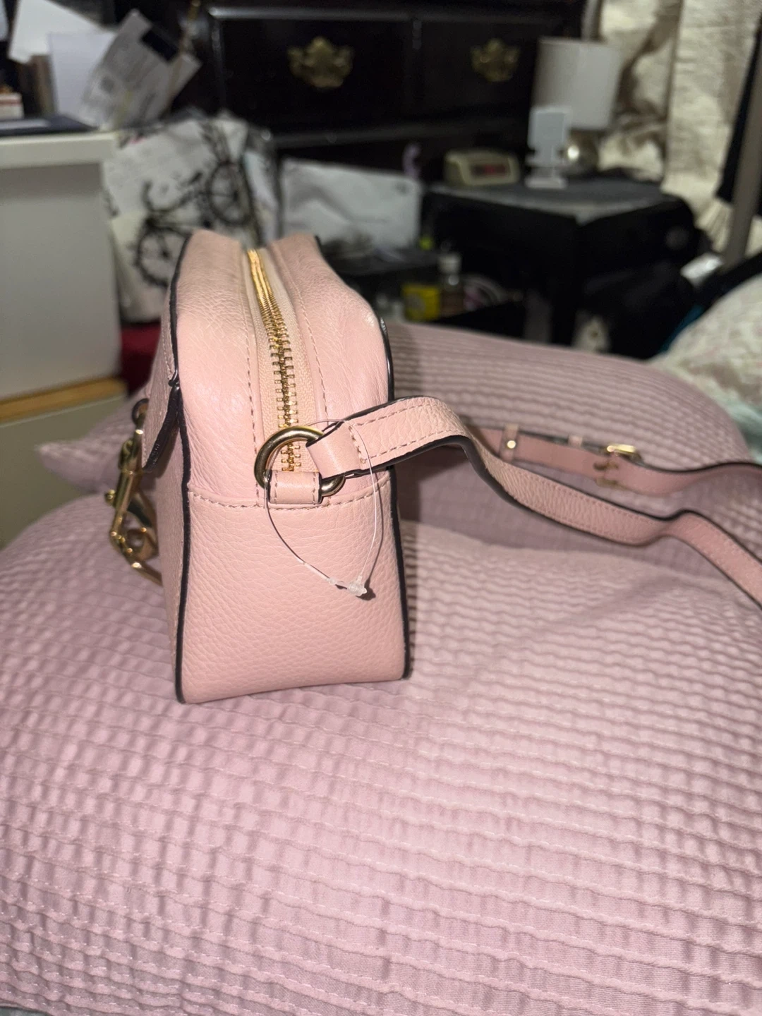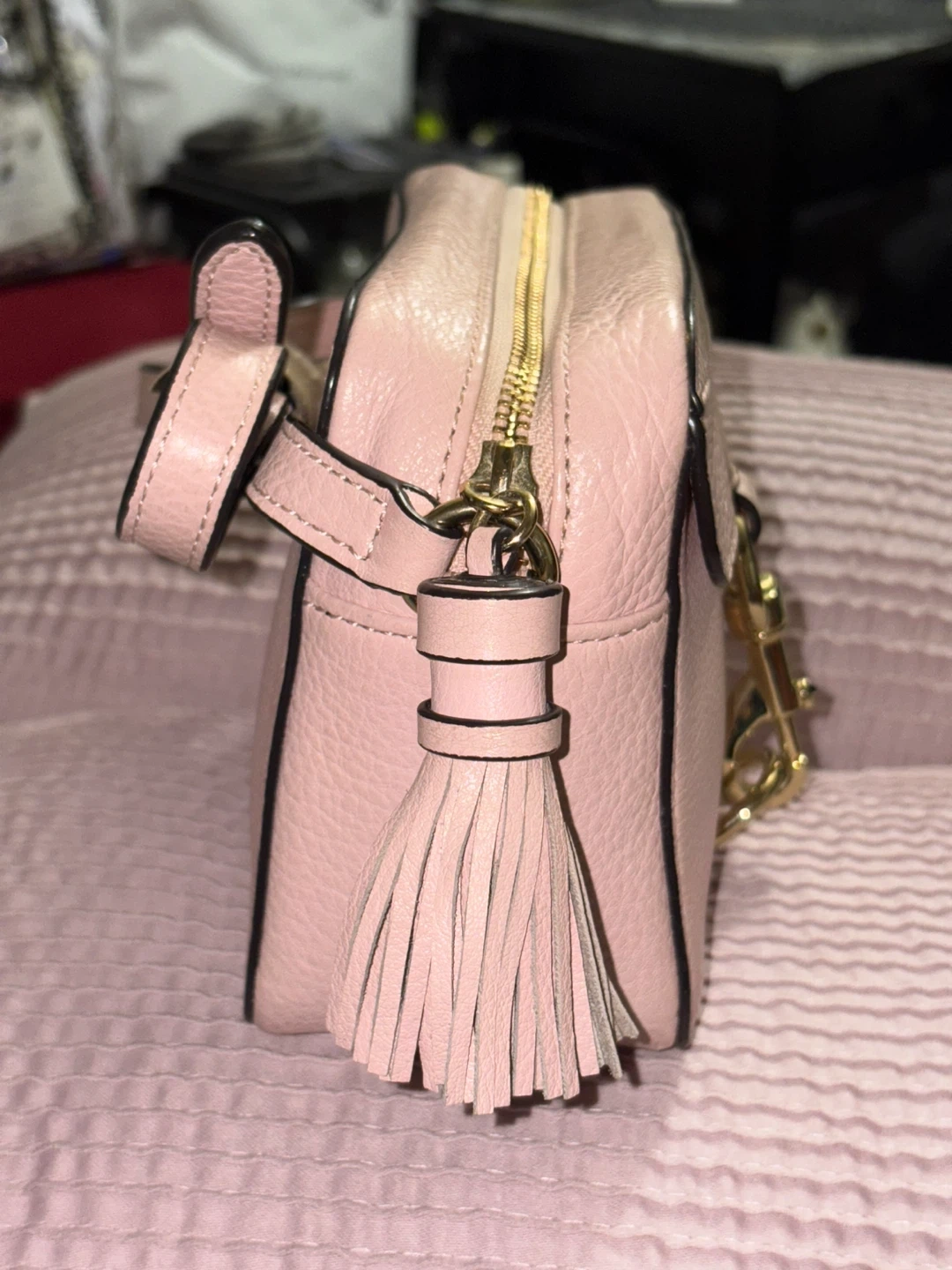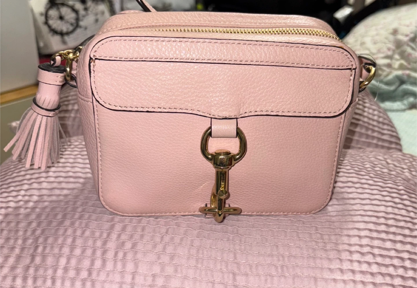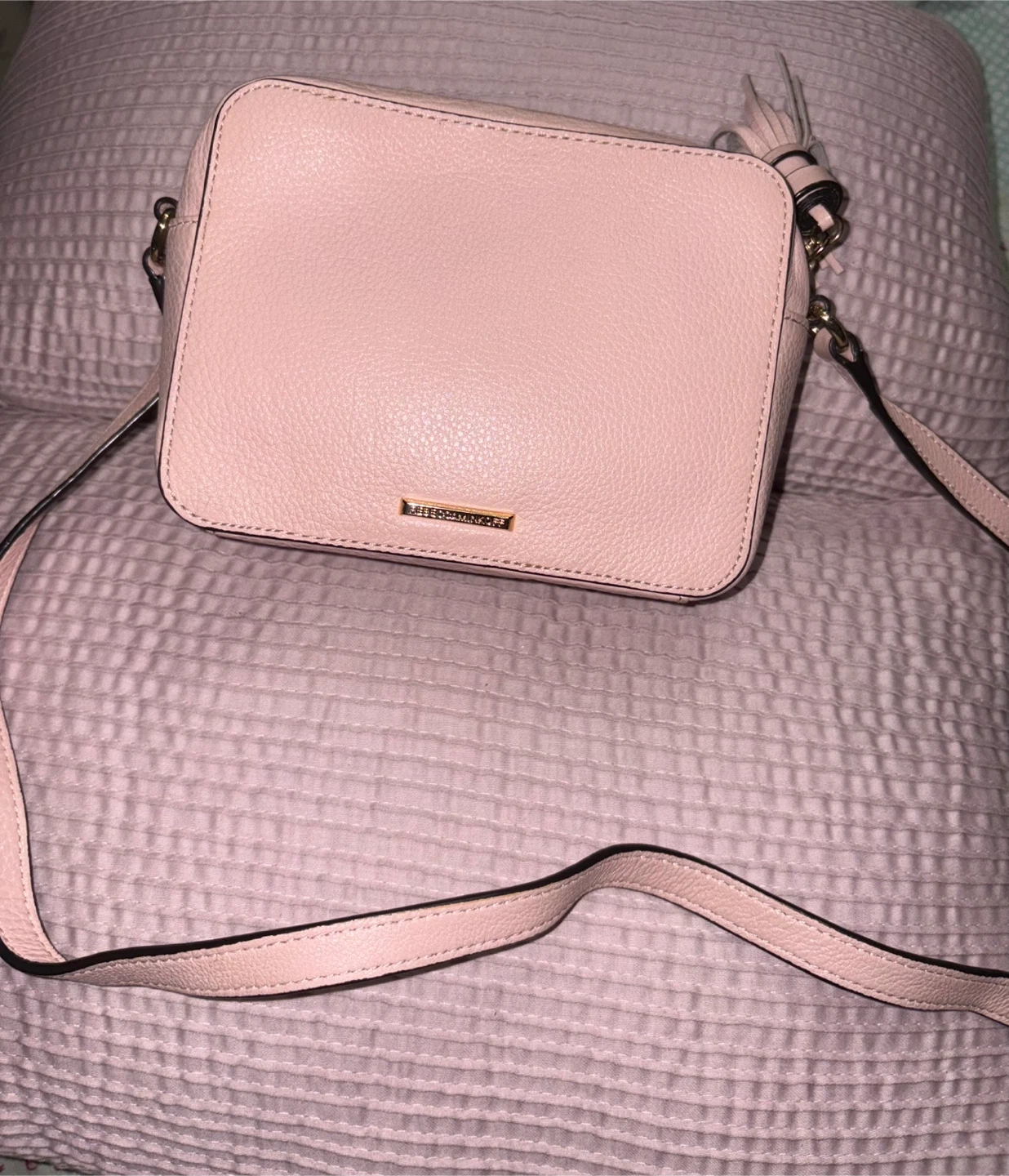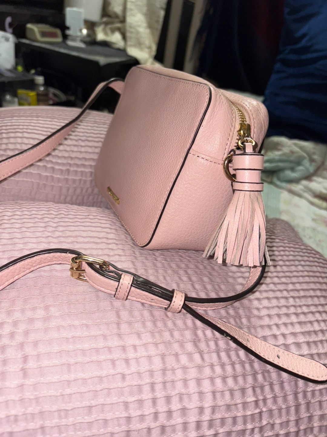 This is a pink leather camera bag from Rebecca Minkoff. It features a tassel detail and gold hardware. Bag's dimensions are approximately 7" W x 5" H x 3" D.