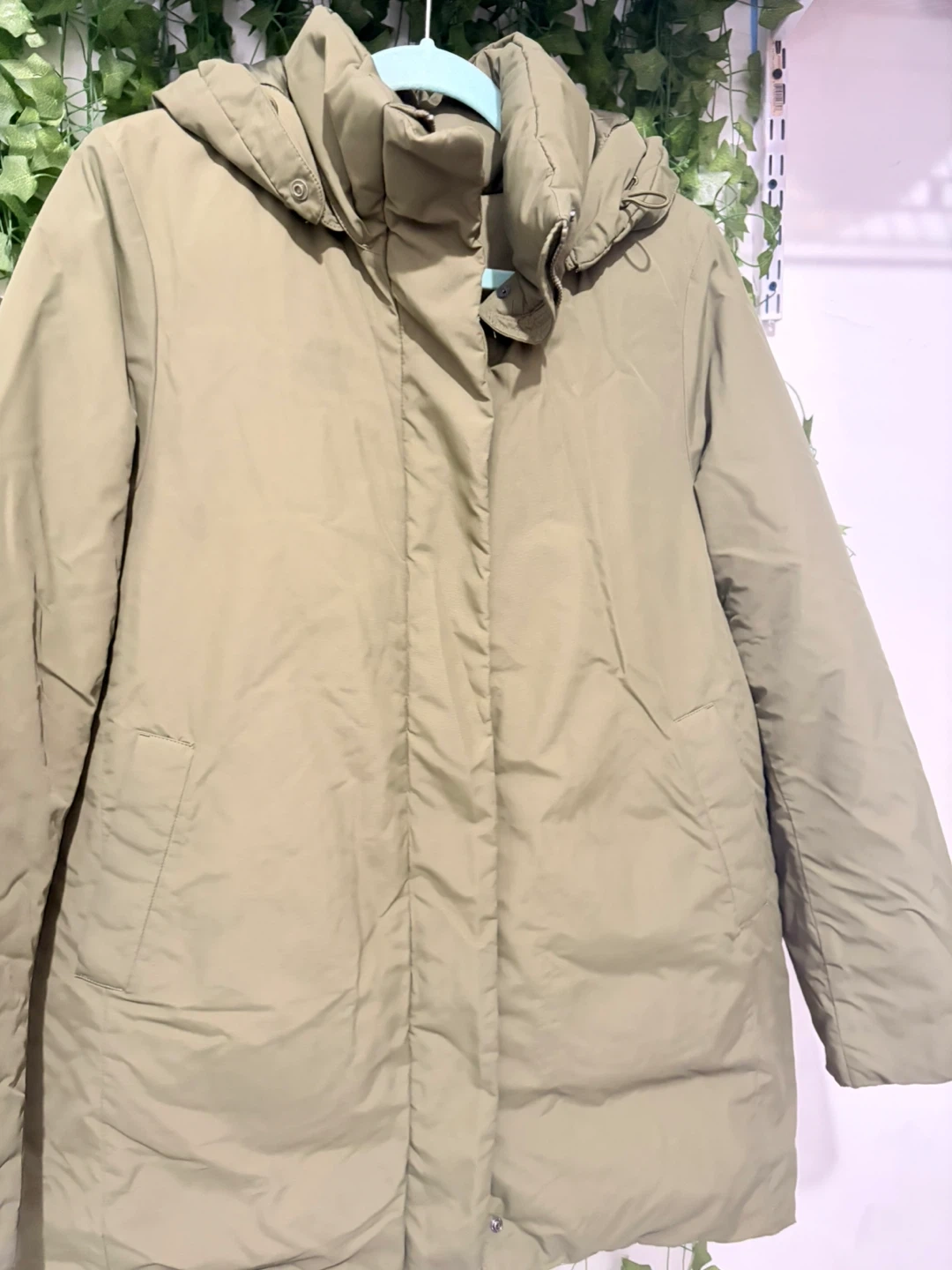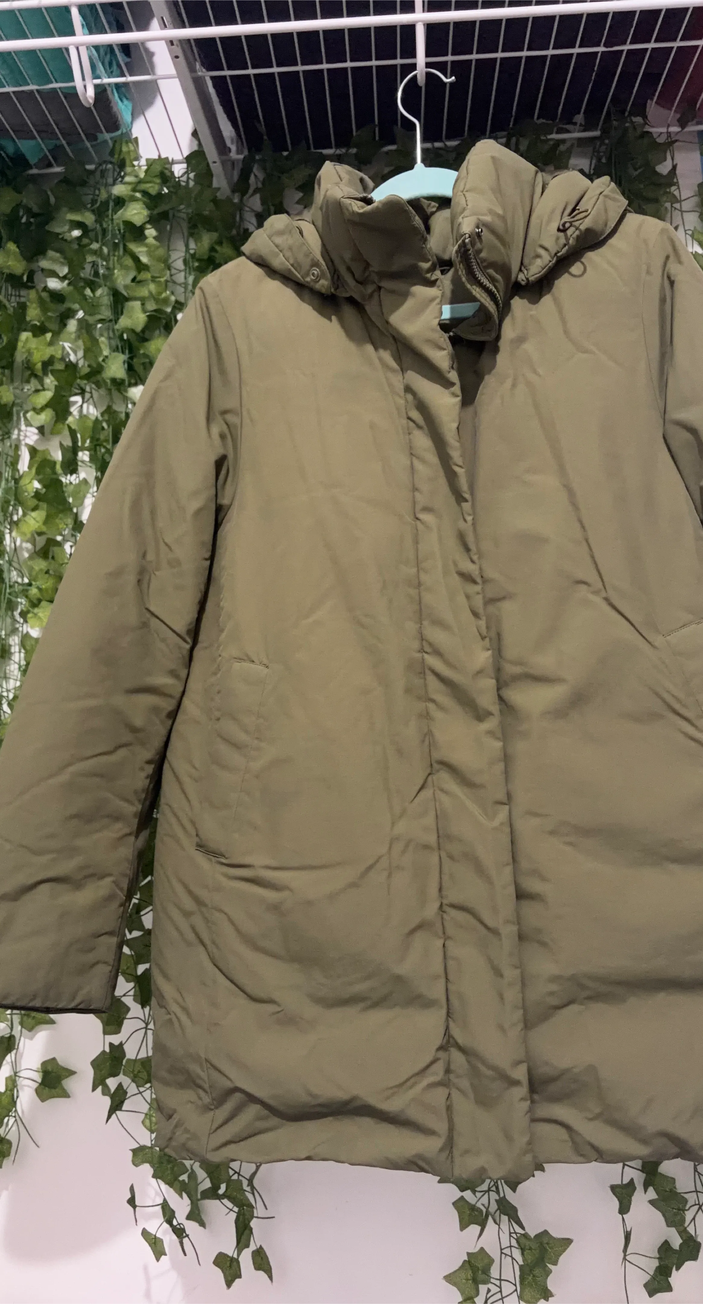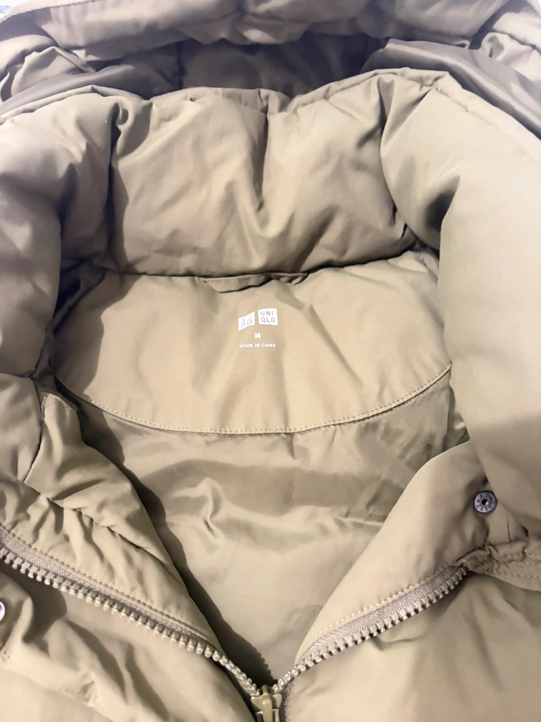 This is a UNIQLO puffer coat in a size medium. It's a versatile olive green color and features a full zip front with a hood. It's designed for warmth and comfort.