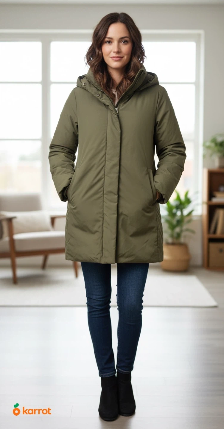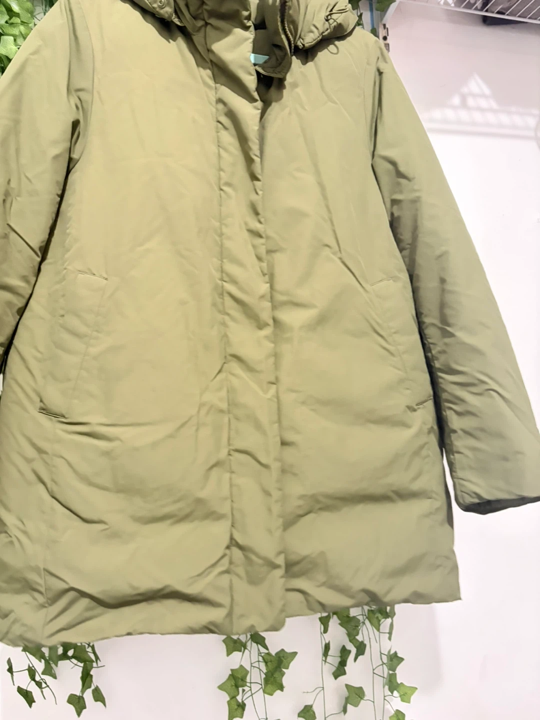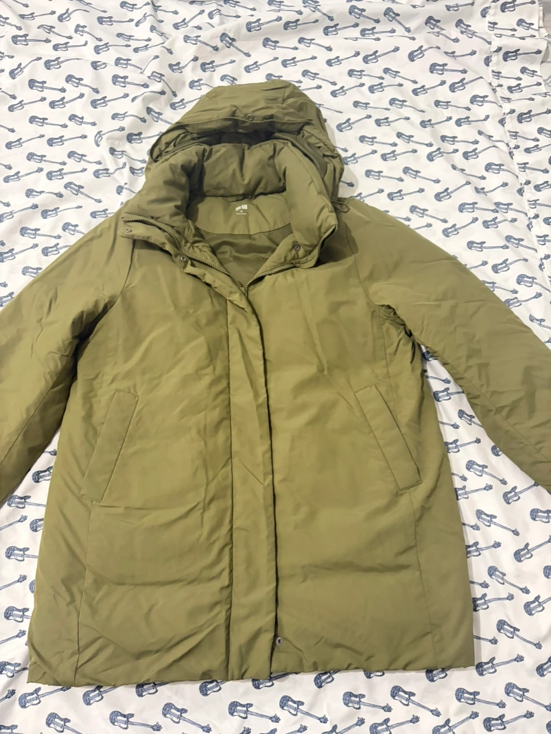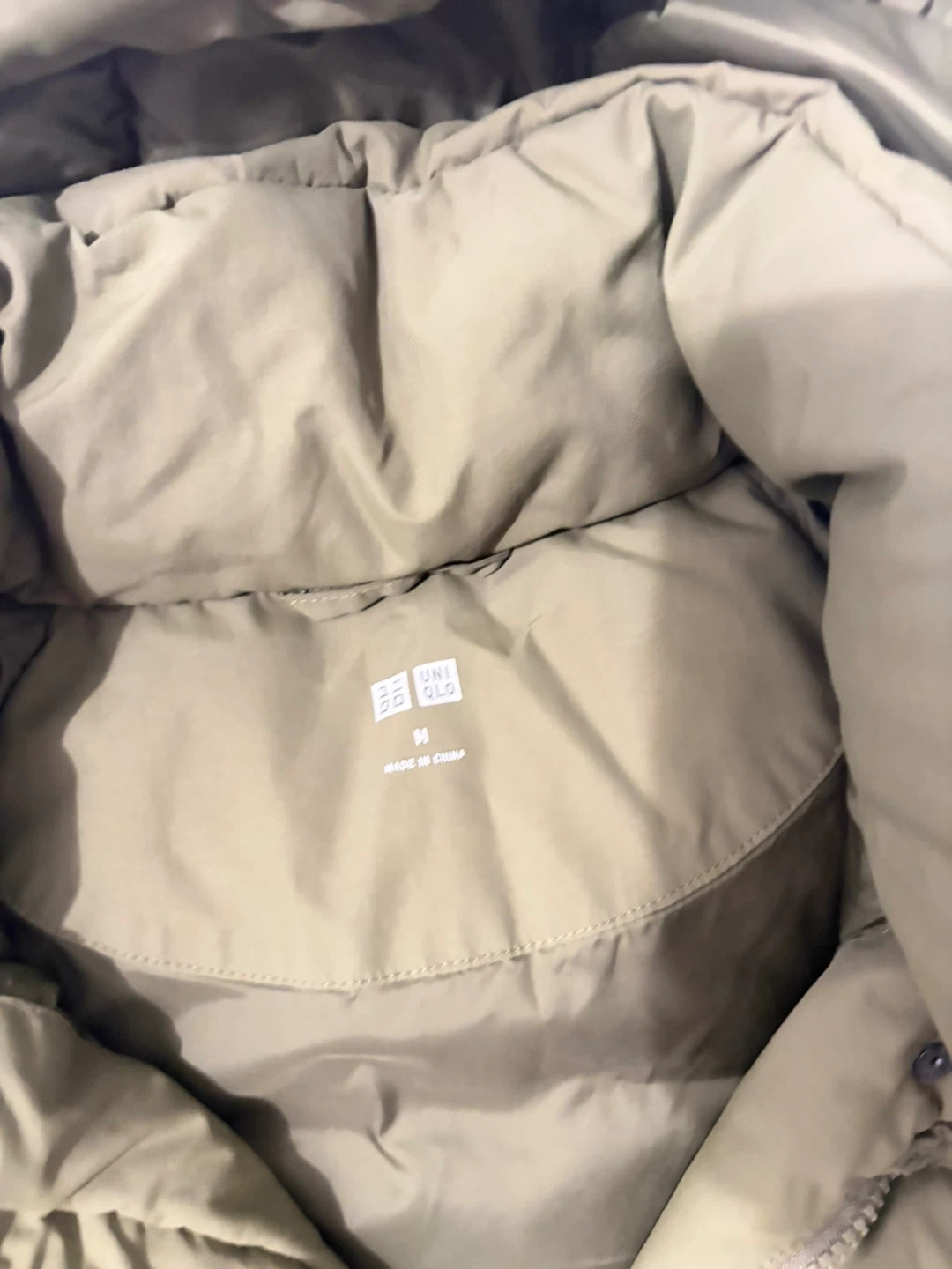 This is a UNIQLO puffer coat in a size medium. It's a versatile olive green color and features a full zip front with a hood. It's designed for warmth and comfort.