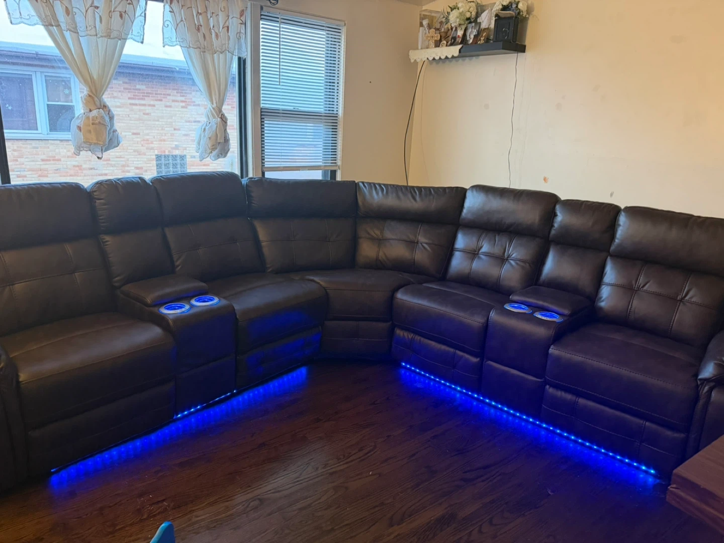 This is a dark brown sectional sofa with built-in cup holders and blue LED accent lighting. It's made of a leather-like material and offers multiple seating positions. The sofa provides a comfortable place to relax with ambient lighting features.
