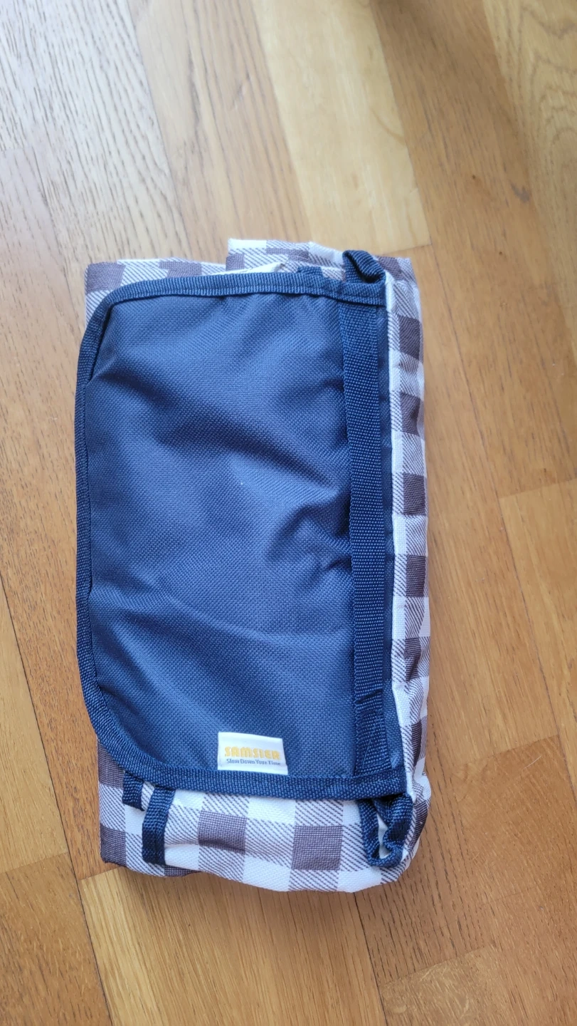 Waterproof and sandproof picnic blanket with a navy blue and plaid design. It's made of durable material. This blanket is easy to fold and carry for outdoor use!