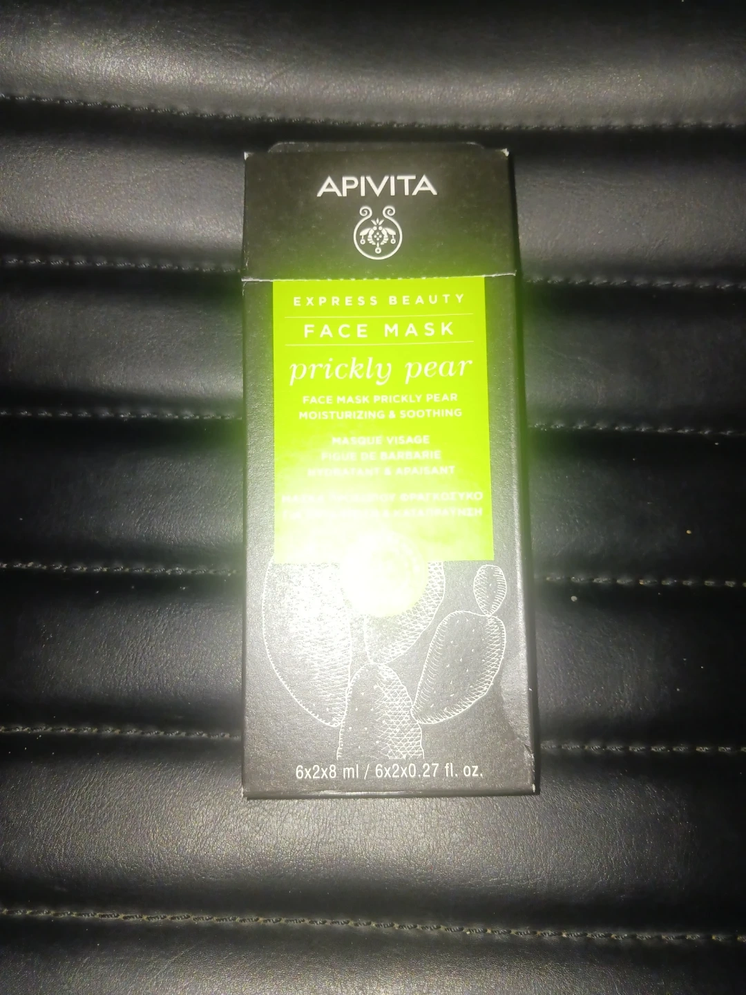 APIVITA Express Beauty Face Mask with Prickly Pear. Moisturizing and soothing formula. Contains 6 individual masks, each 2ml. 92% natural origin ingredients.