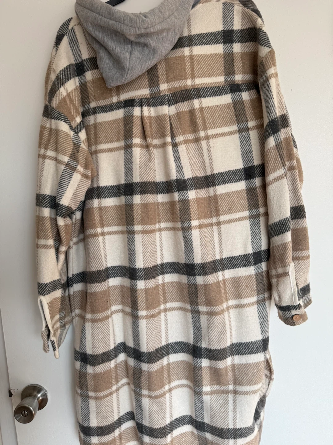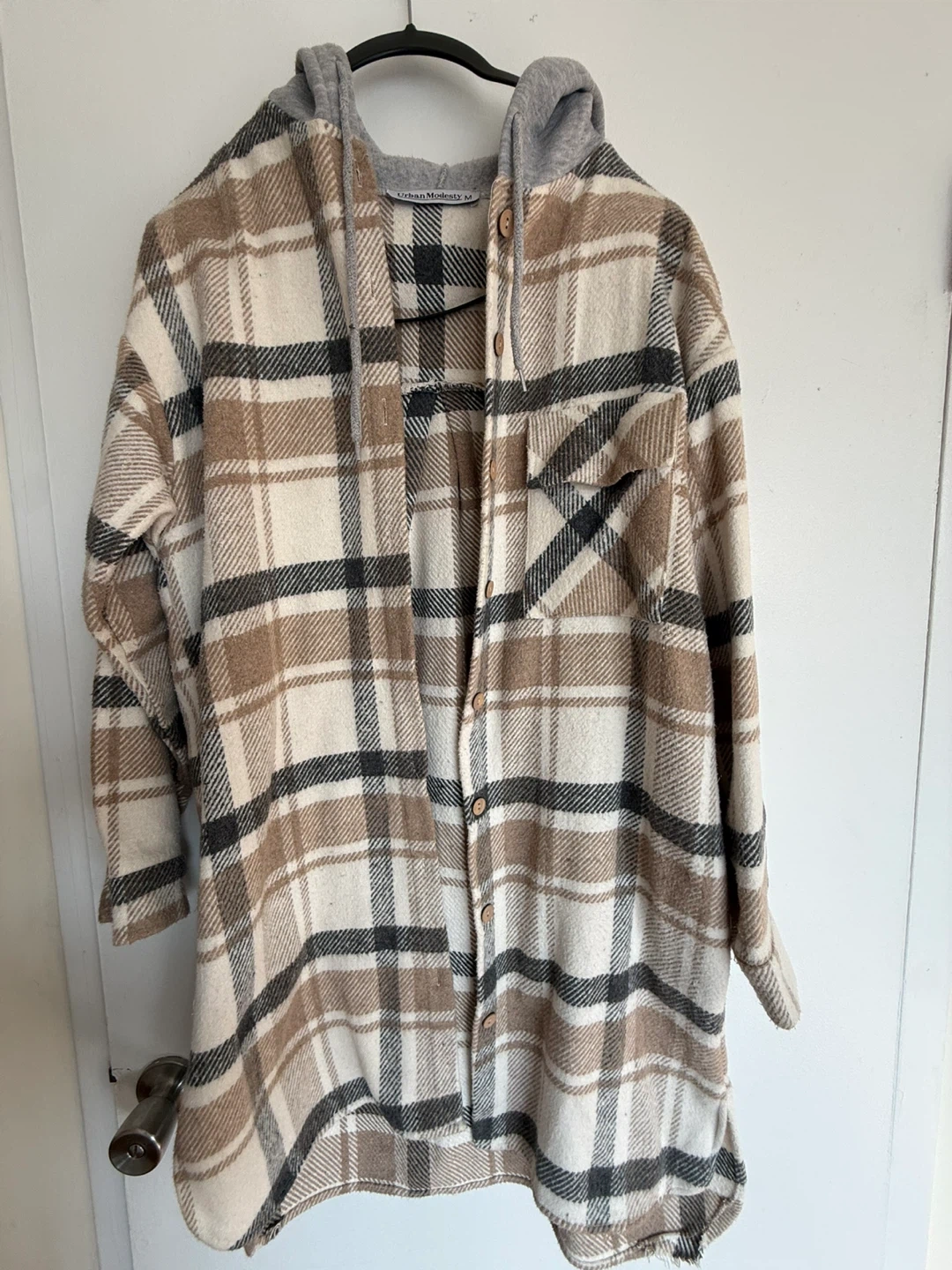 Here's a stylish plaid hooded shacket from Urban Modesty! The neutral tones make it a versatile piece for layering. It's in great condition and ready to add some cozy vibes to your wardrobe