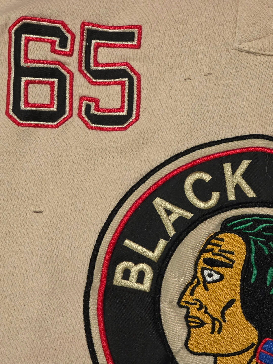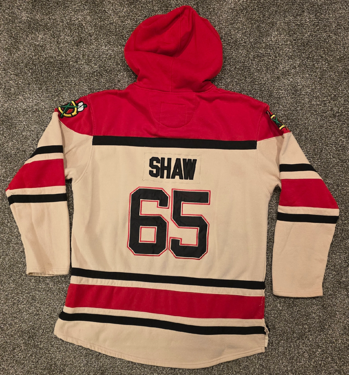 Selling an Old Time Hockey hoodie featuring the Chicago Blackhawks logo and number 65. It's an XL size. The hoodie has a lace-up neck and the name "Shaw" on the back. It's a unique piece for any Blackhawks fan! small slices in picture 3.