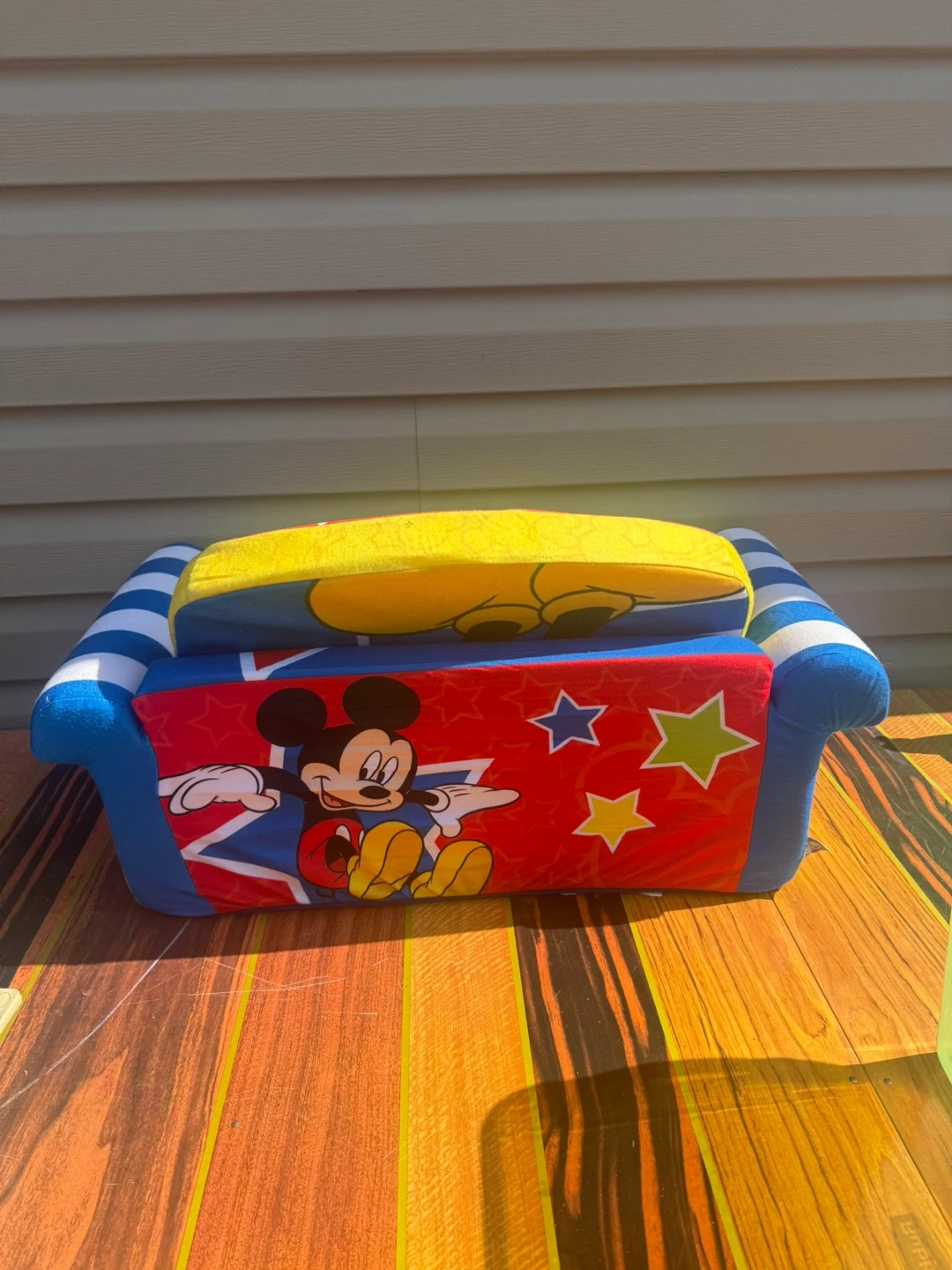This is a fun, foldable couch for kids featuring Mickey Mouse! It's perfect for a playroom or bedroom. The couch is in good condition.