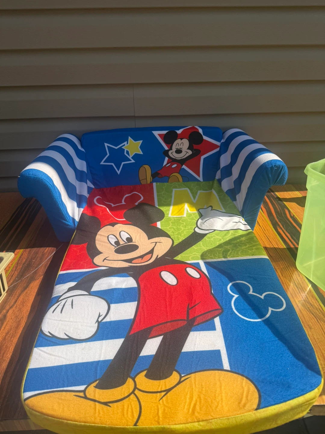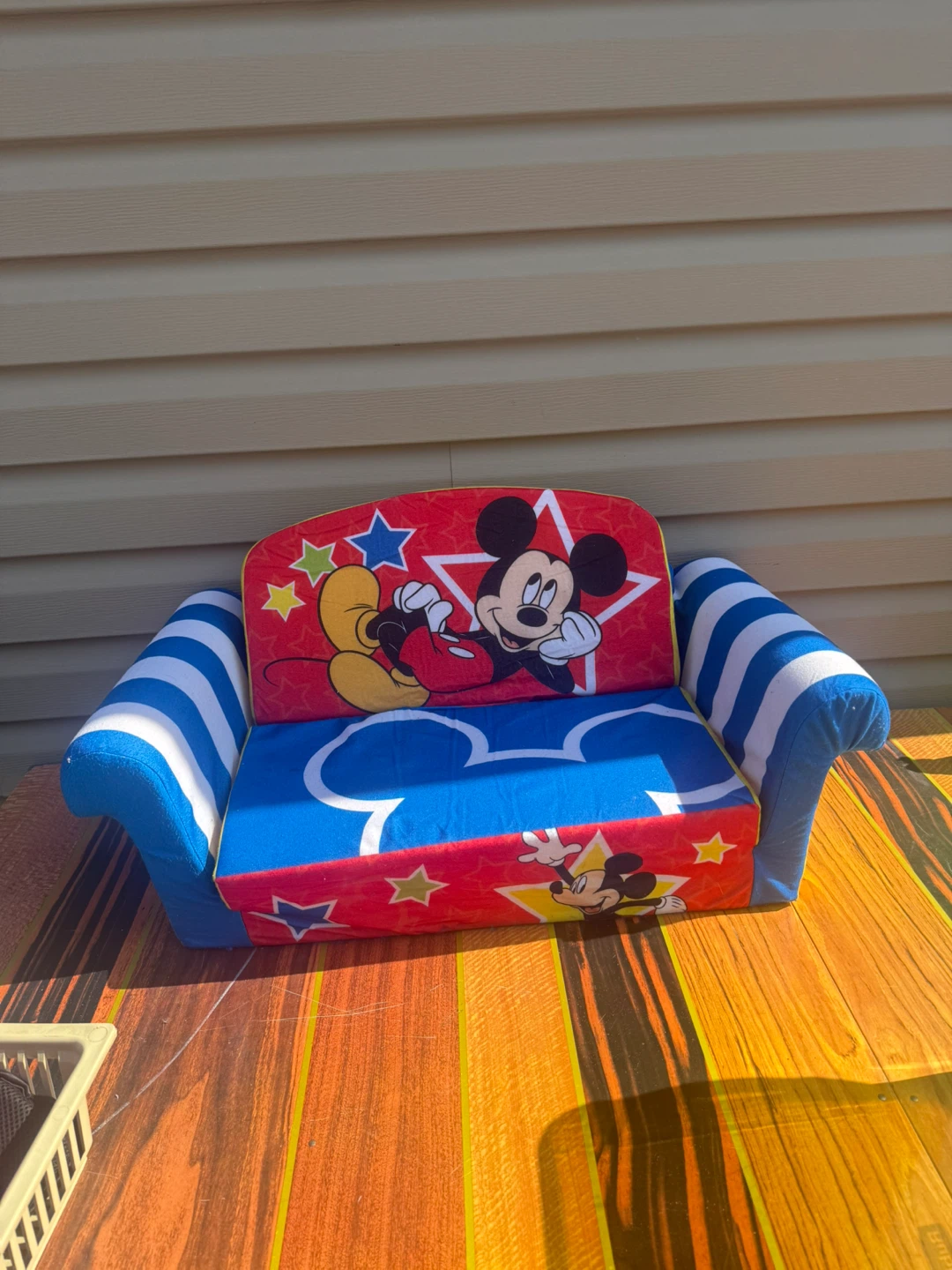 This is a fun, foldable couch for kids featuring Mickey Mouse! It's perfect for a playroom or bedroom. The couch is in good condition.