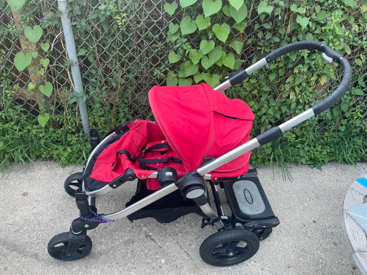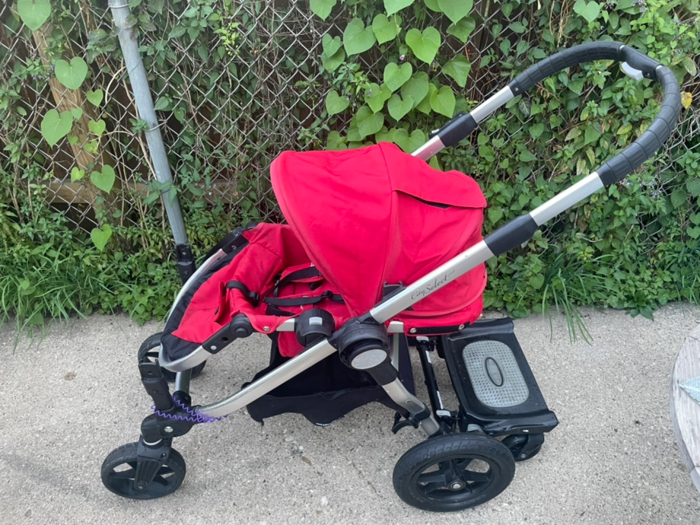Selling a Baby Jogger City Select stroller in red! It's in good condition and ready for a new home. Perfect for navigating city streets or enjoying a walk in the park. This stroller is known for its versatility and smooth ride, making it a great choice for parents on the go has glider attachment for additional kid. Used double stroller with glider no addition seat.