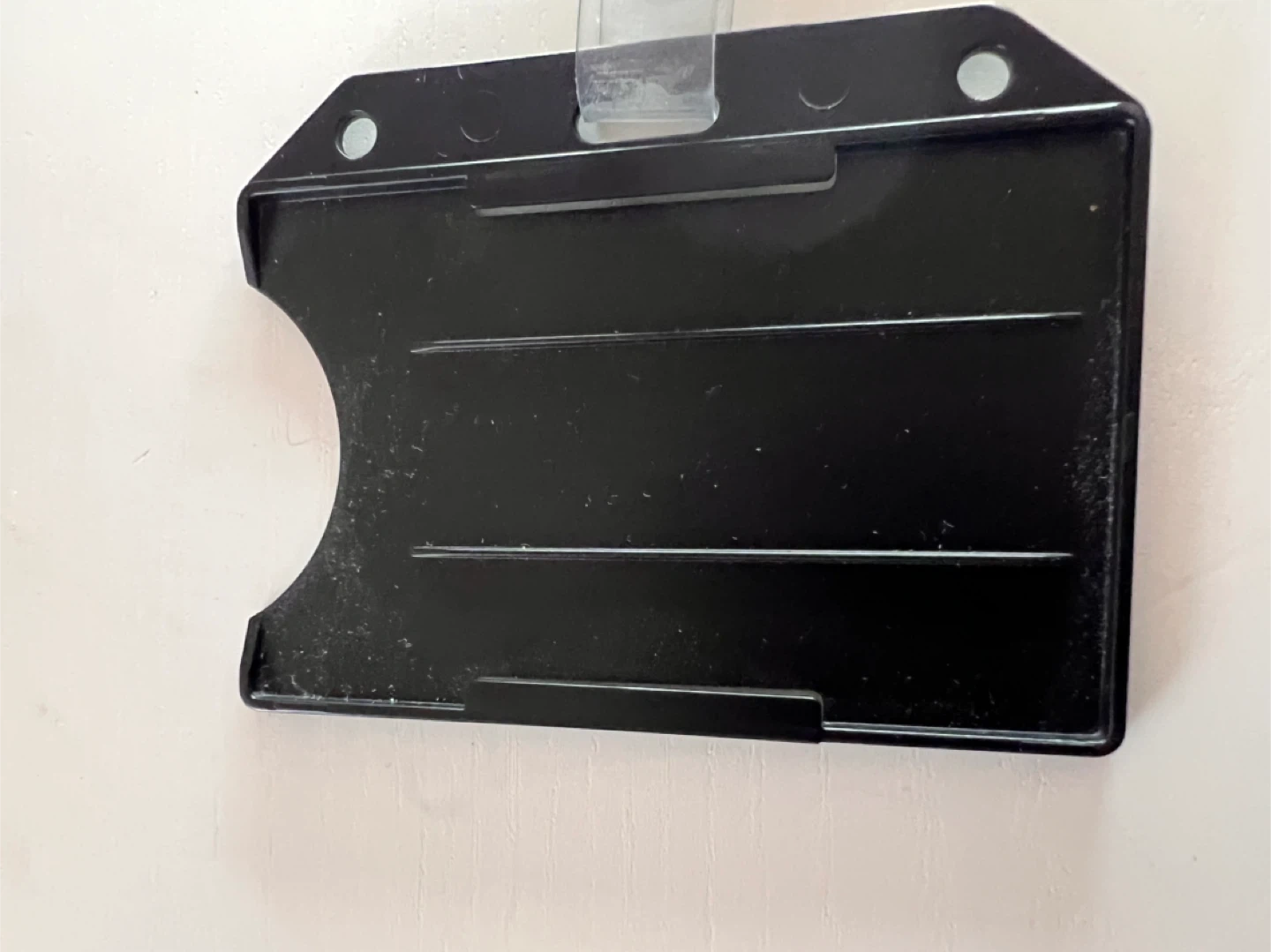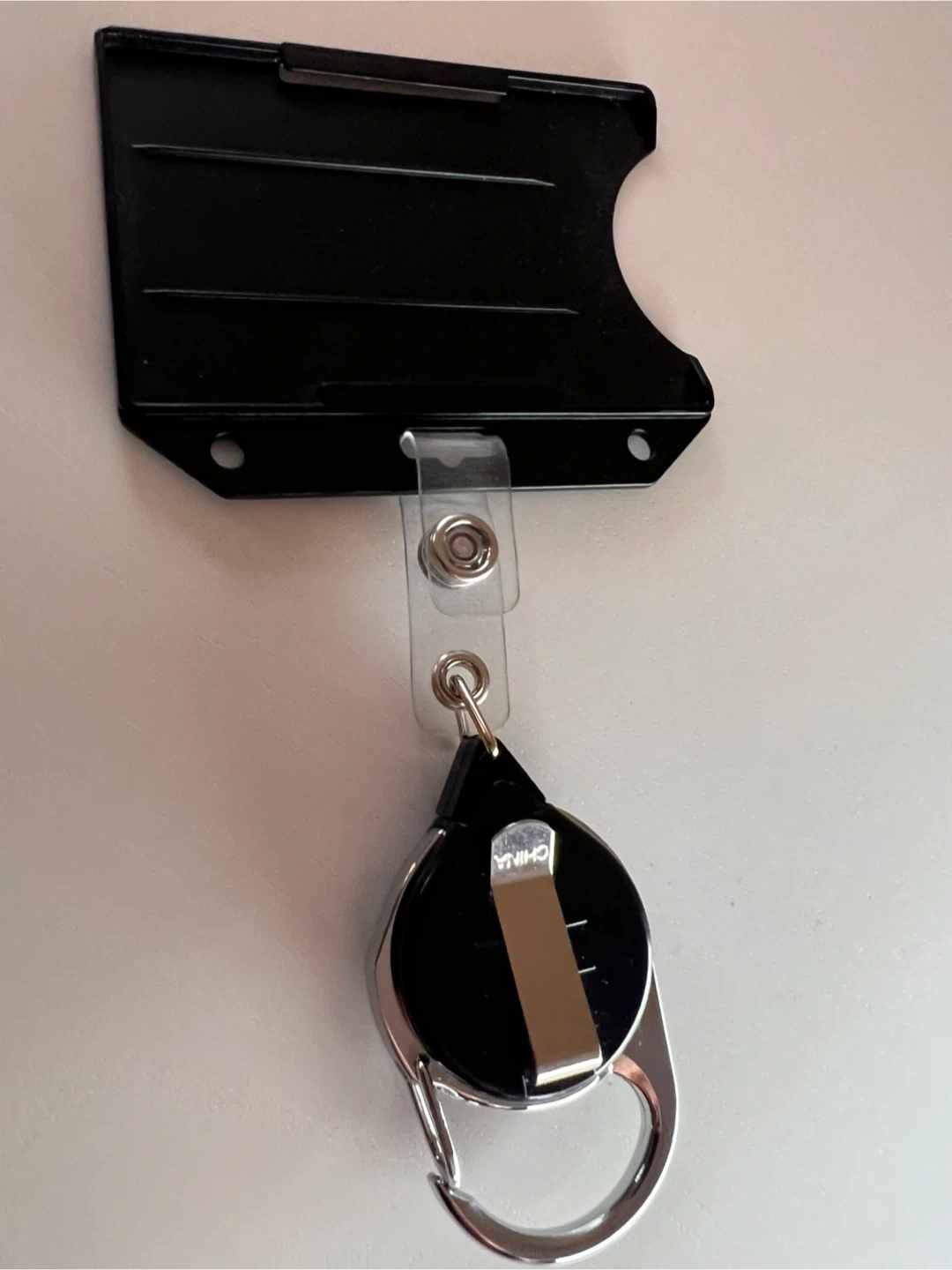 This is a black badge holder with a retractable reel. It's in good condition and ready to use. Perfect for holding your ID or access card!
