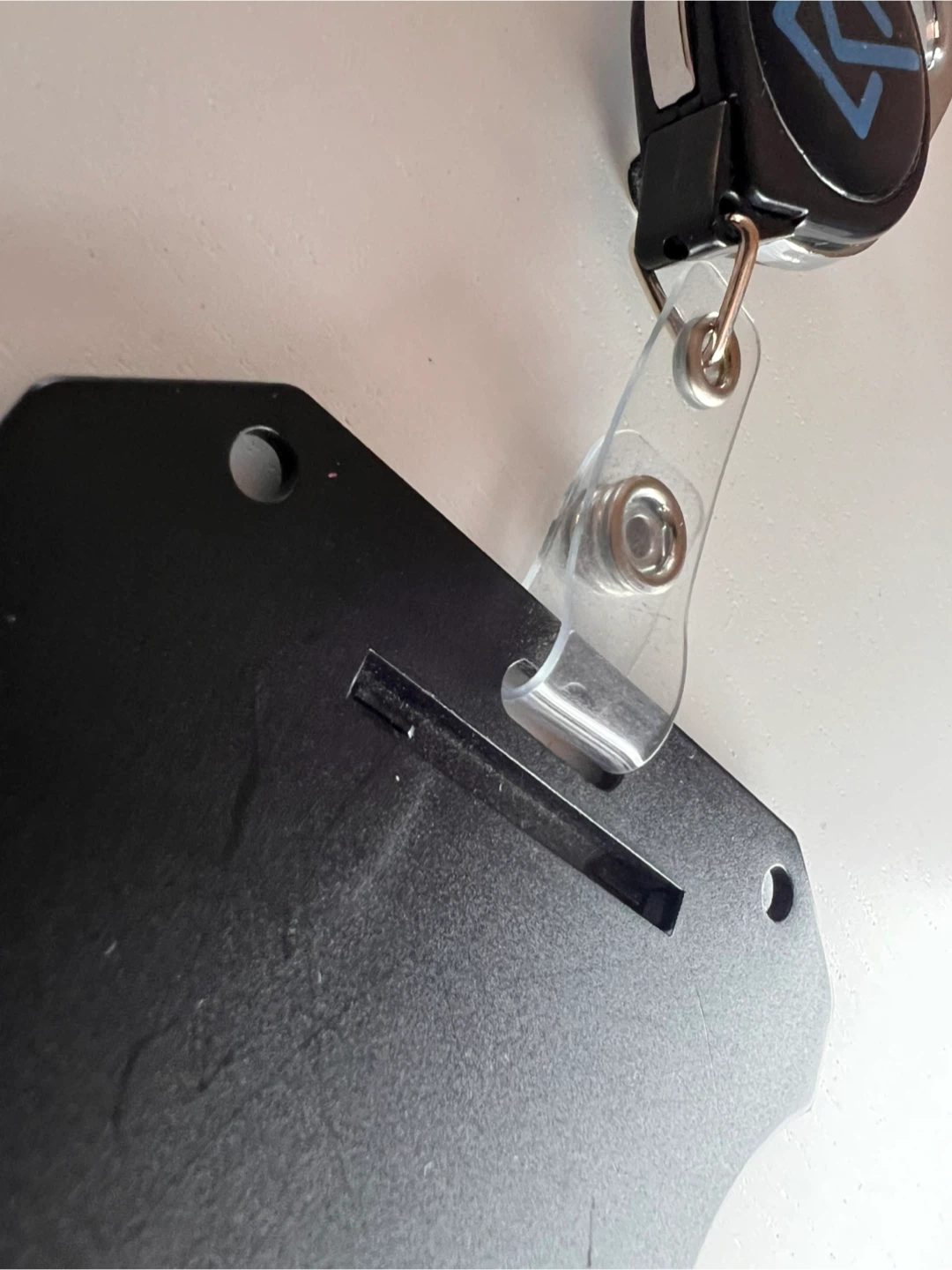 This is a black badge holder with a retractable reel. It's in good condition and ready to use. Perfect for holding your ID or access card!