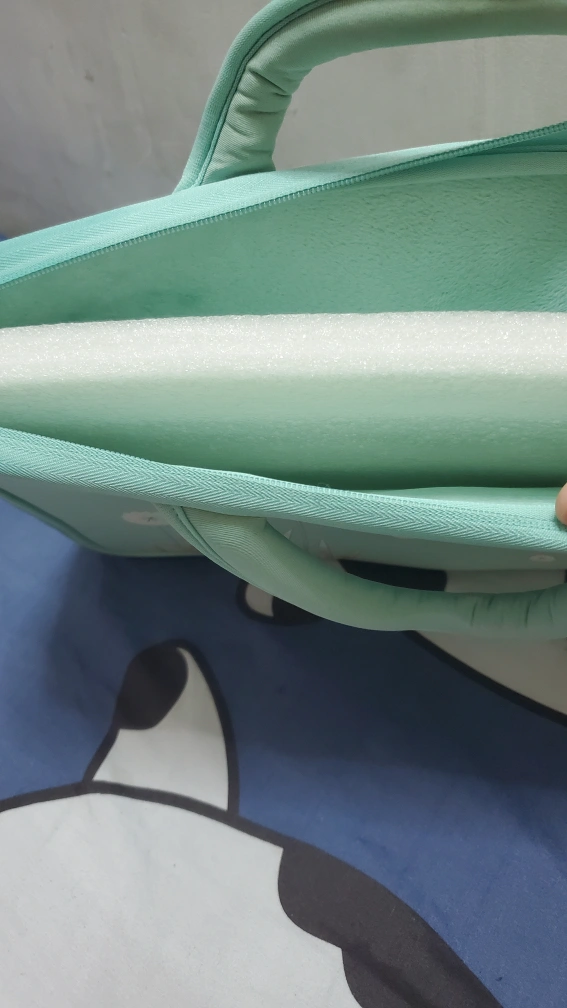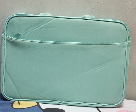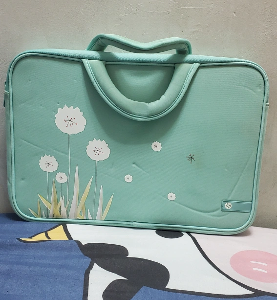 Mint green laptop case with a flower design. back have a zipper compartment,