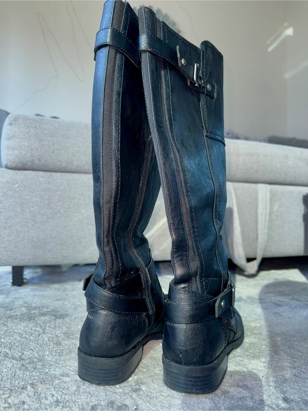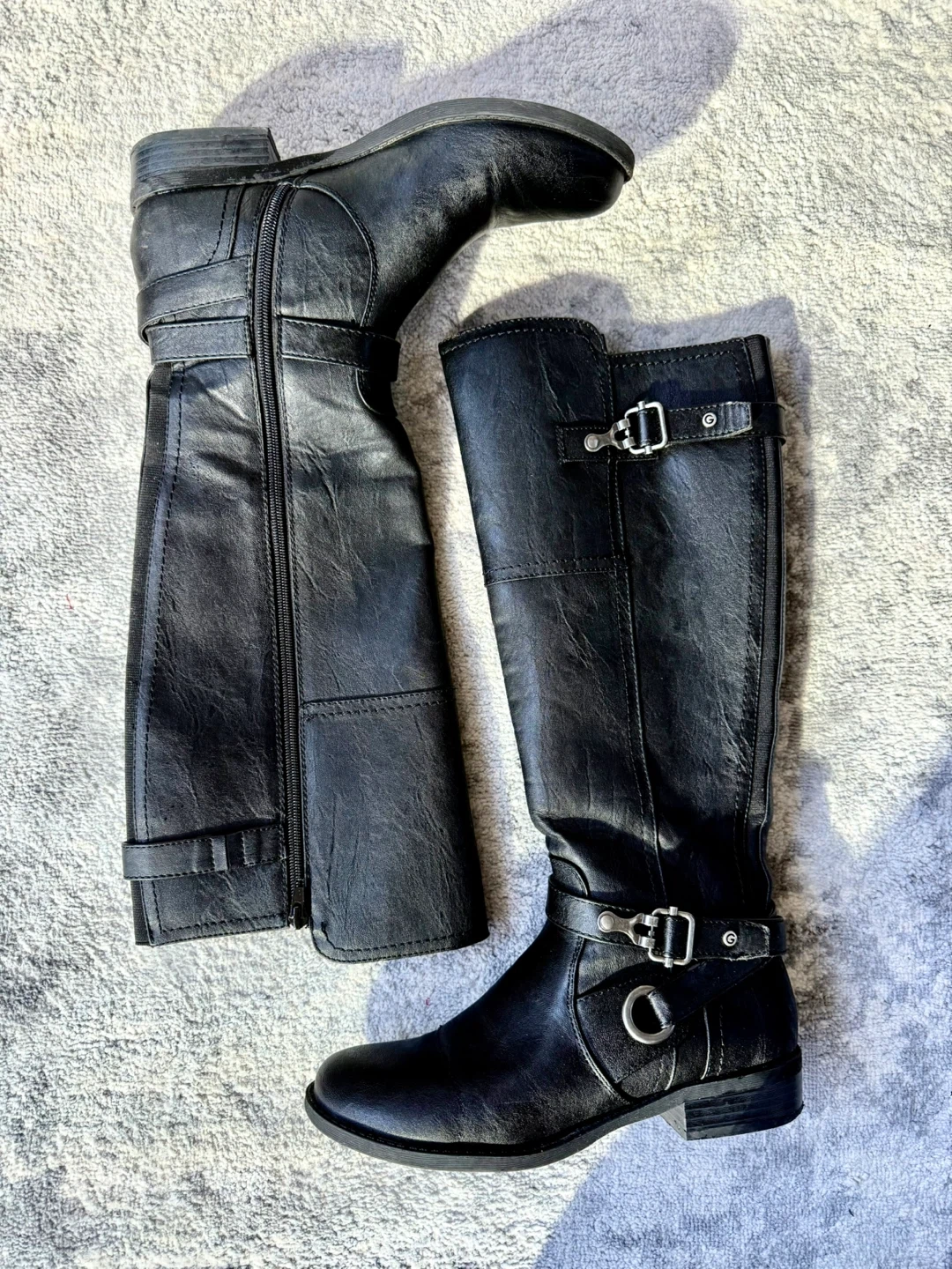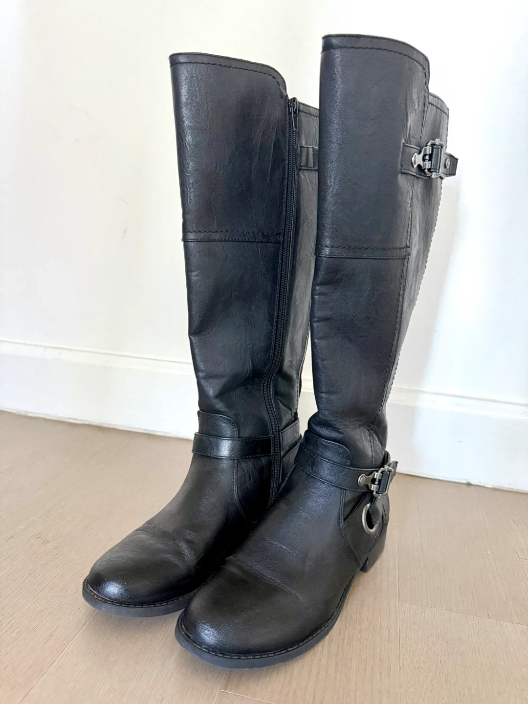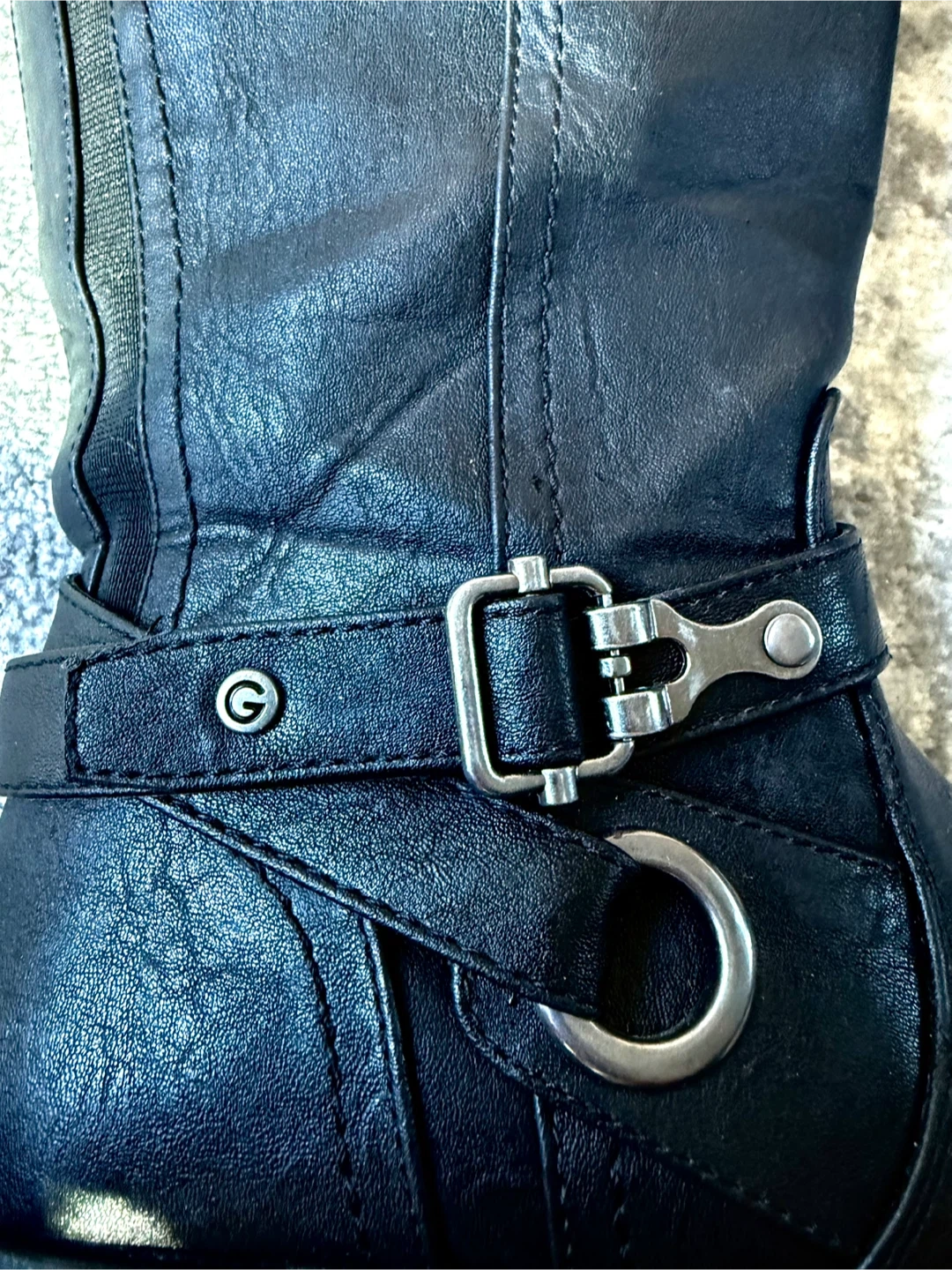 Vegan faux leather black knee-high boots from G by Guess, featuring a striking silver buckle and strappy harness design. Perfect for equestrian-inspired streetwear style.