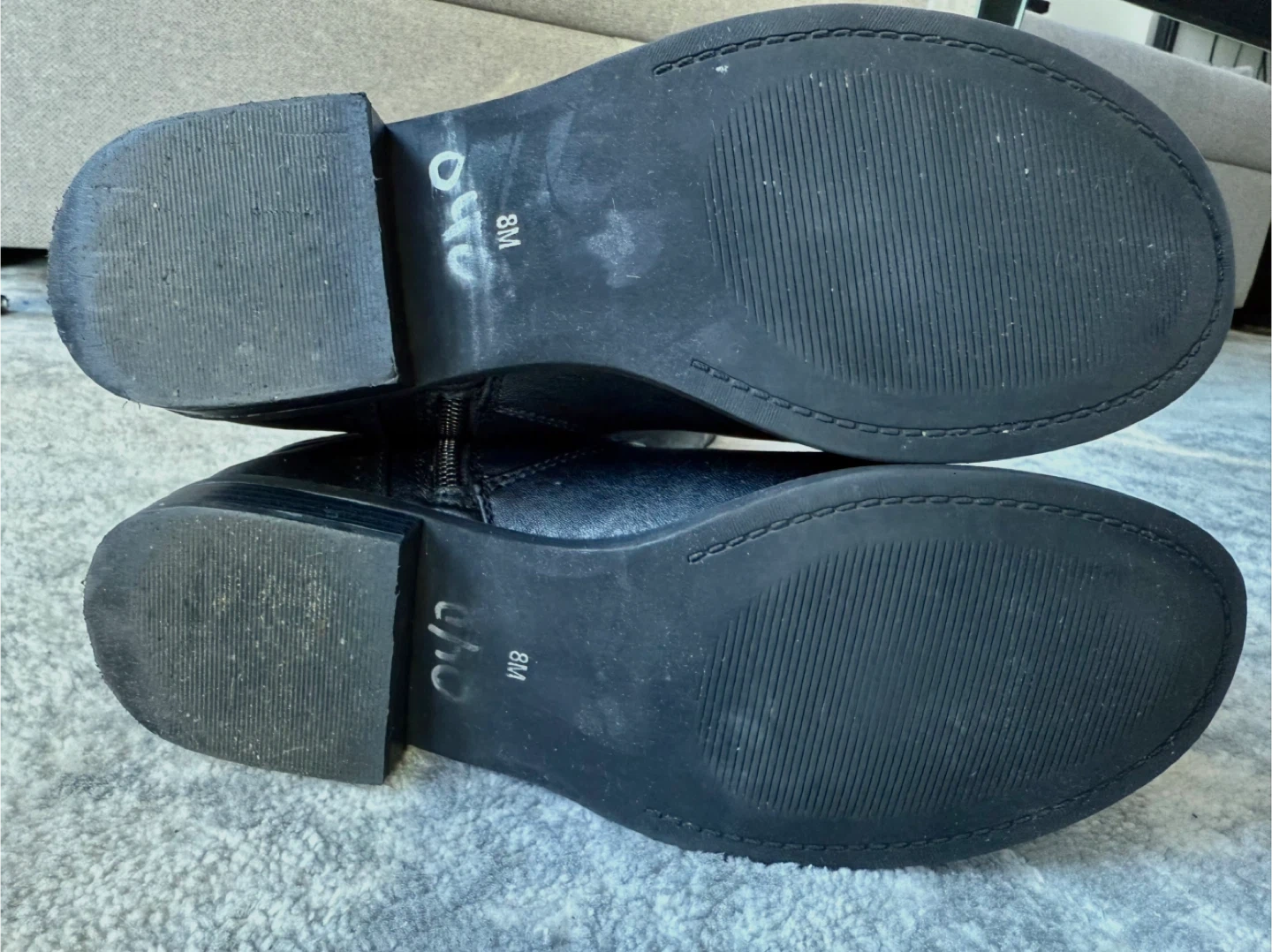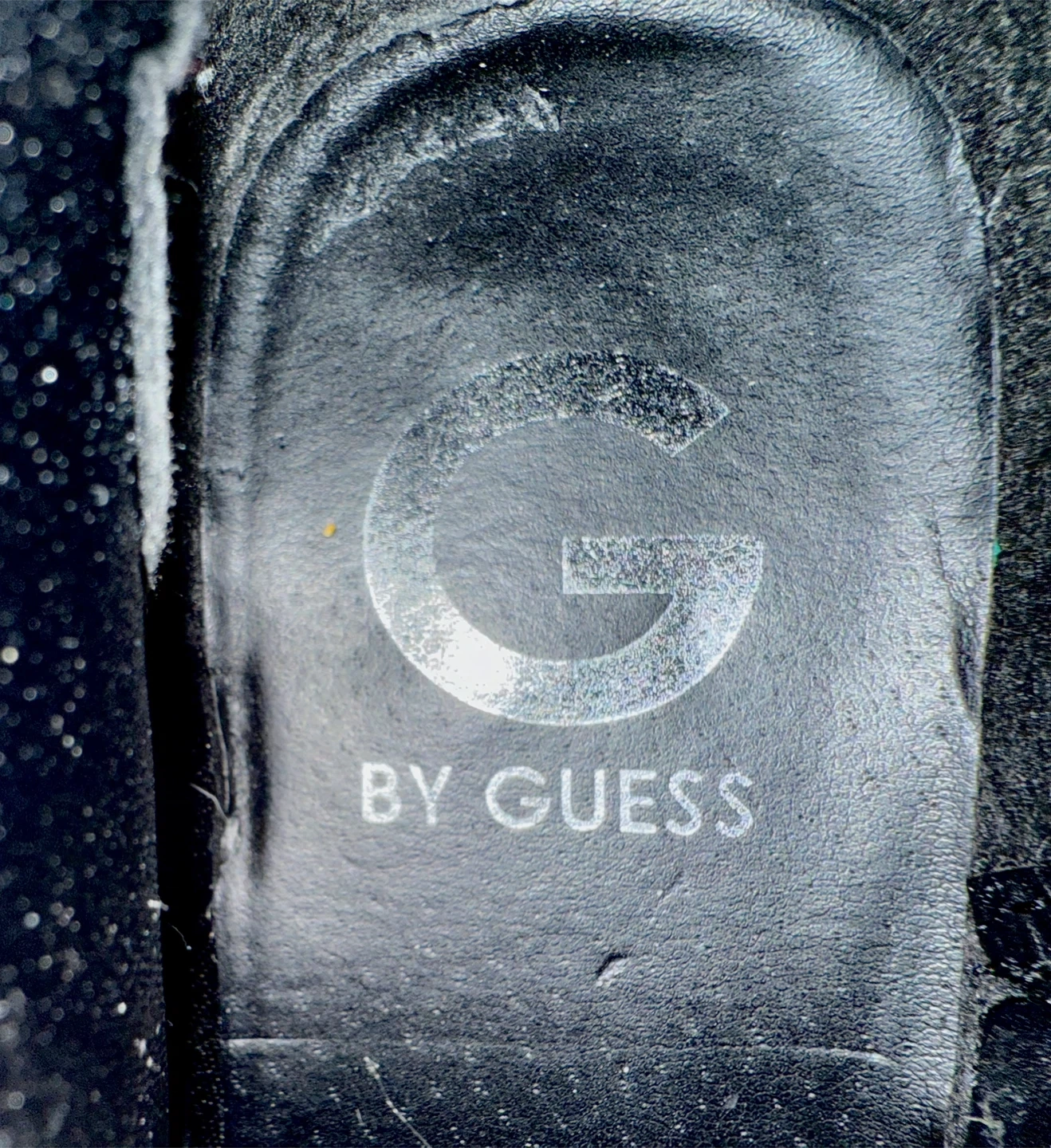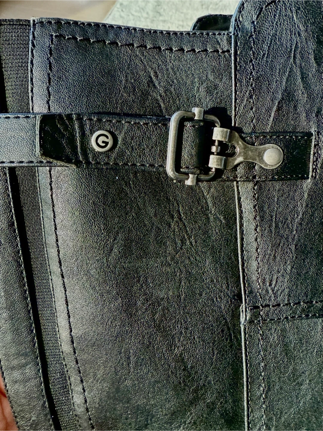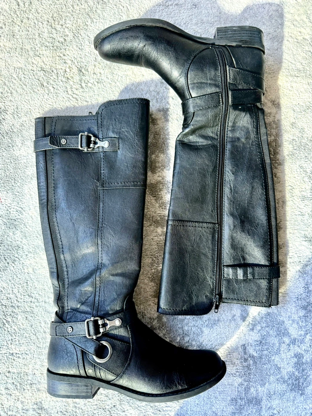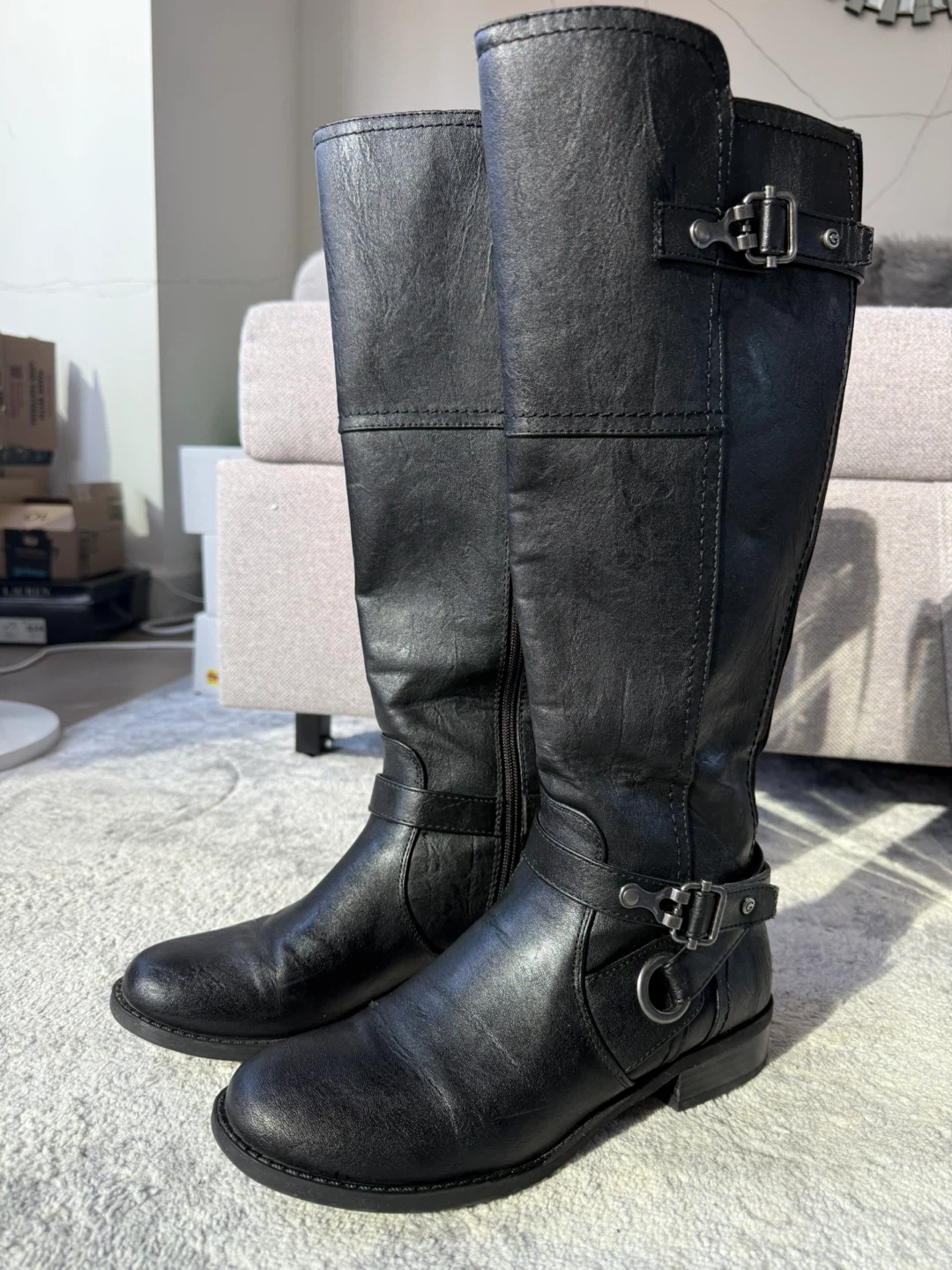 Vegan faux leather black knee-high boots from G by Guess, featuring a striking silver buckle and strappy harness design. Perfect for equestrian-inspired streetwear style.
