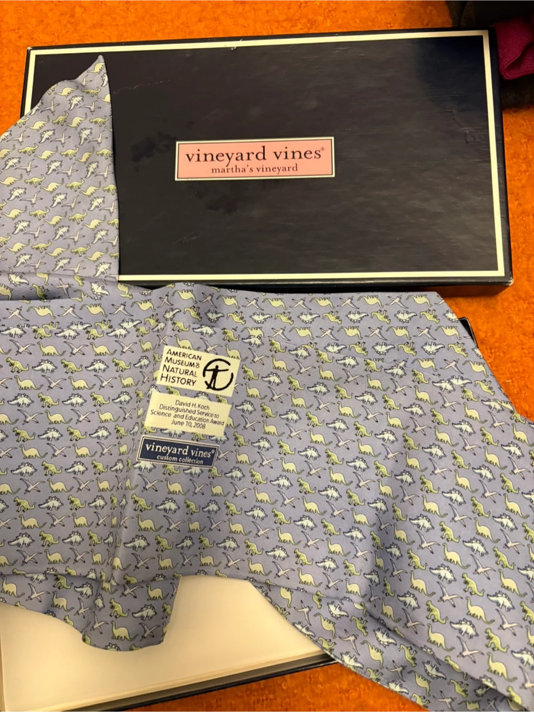 This is a Vineyard Vines scarf featuring a dinosaur print. It's made of silk and comes with its original box. The scarf is light blue with a pattern of small dinosaurs in green and yellow.