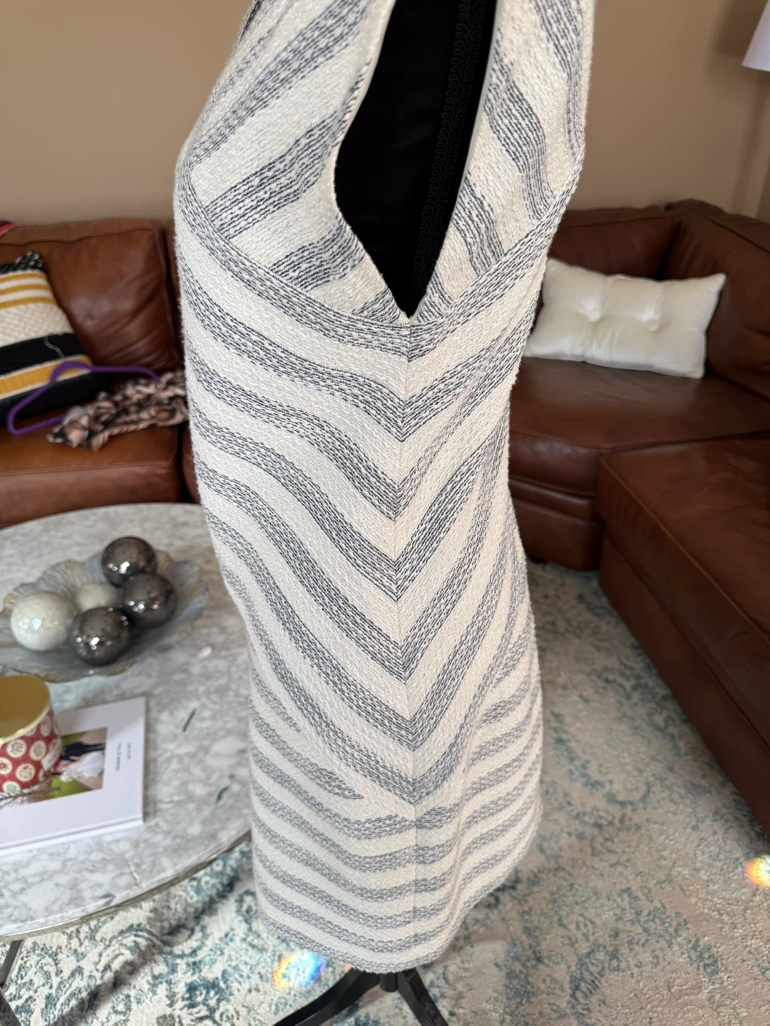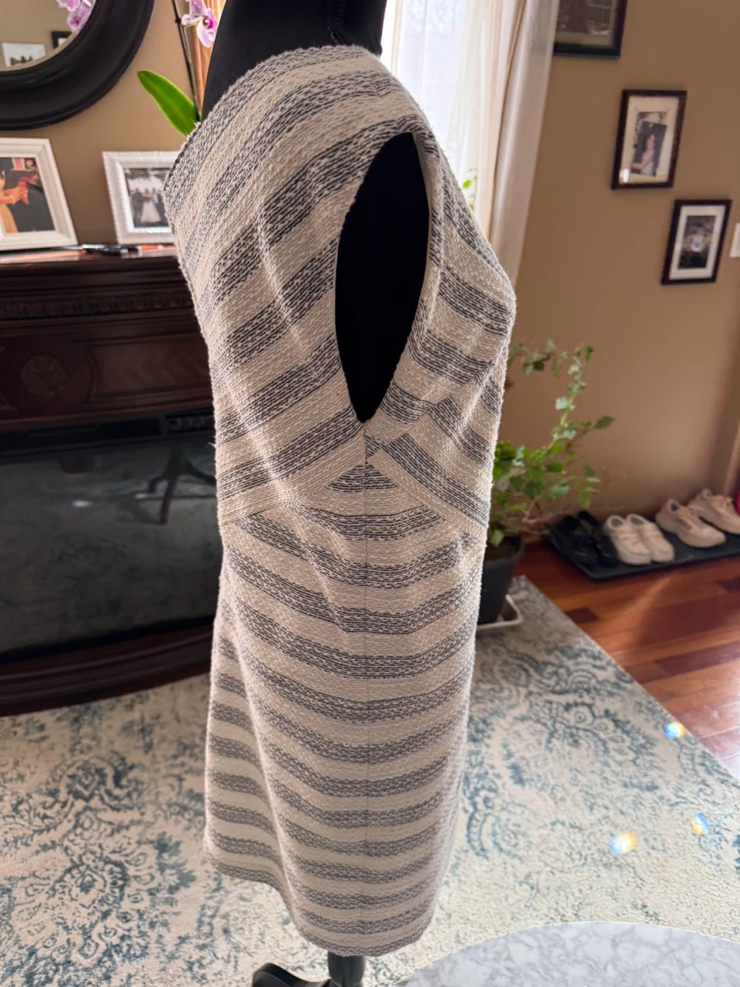 This sleeveless V-neck dress features a stylish white and gray striped pattern. It's a chic option for various occasions! The material is a textured blend.