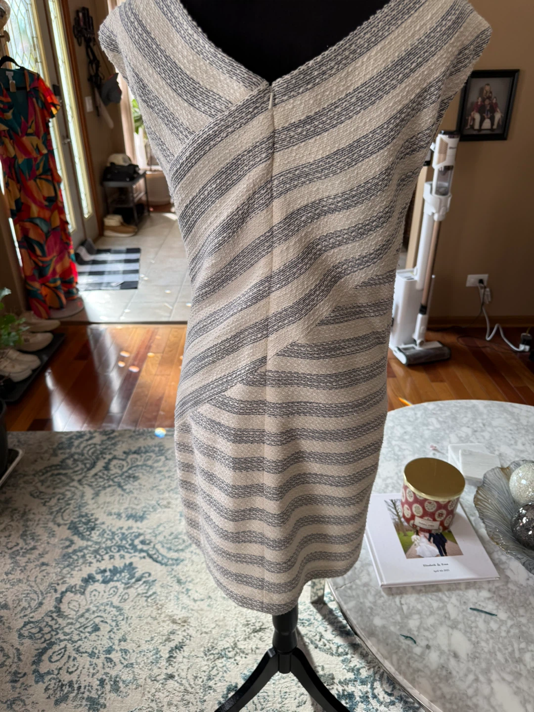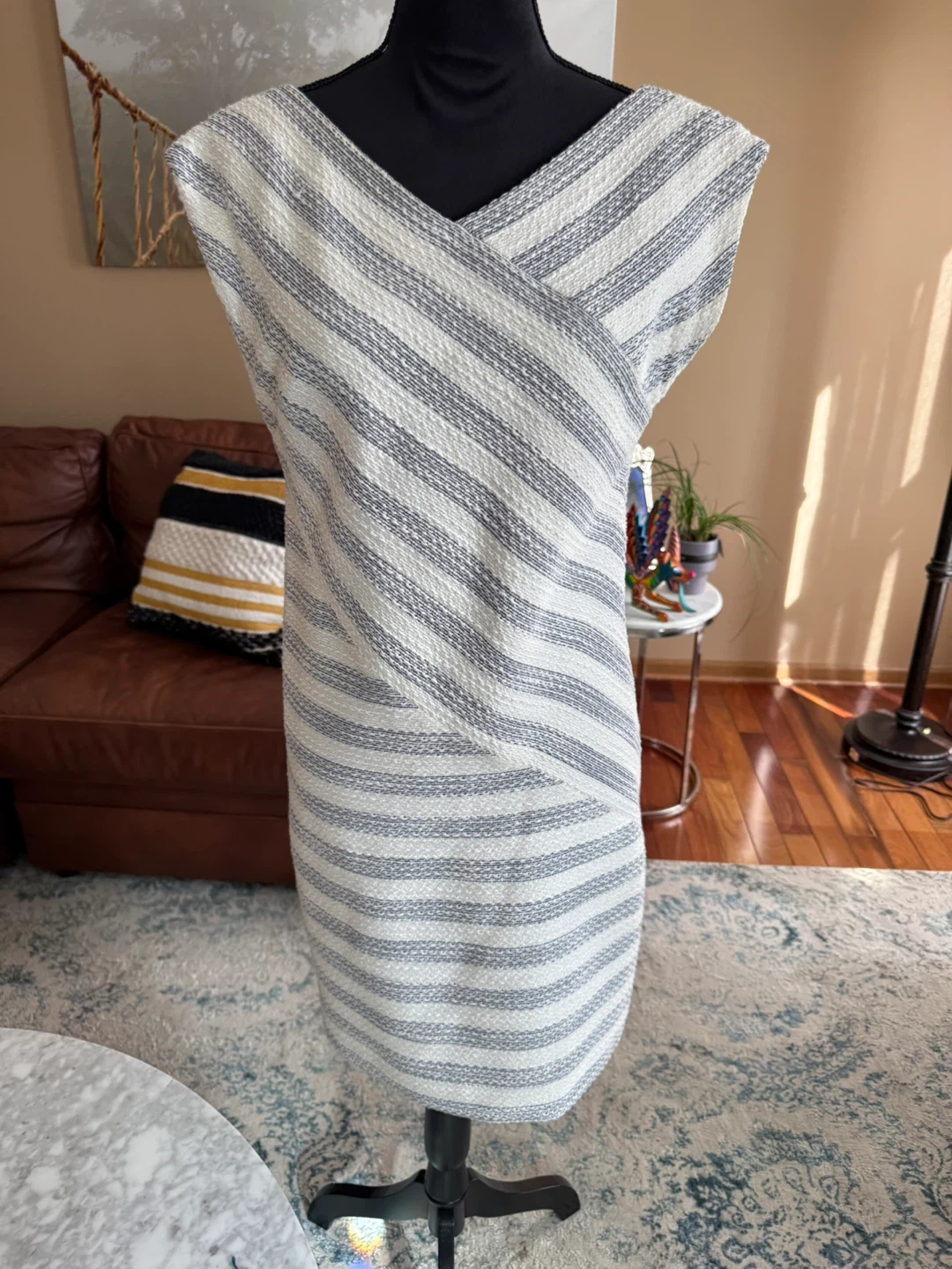The Muse White Gray Striped Sheath Dress is a stylish and versatile option for various occasions. This sleeveless dress features a flattering V-neckline and a knee-length hem, making it perfect for parties, cocktails, or business events. The classic striped pattern in white and gray adds a touch of sophistication, while the zipper closure ensures a secure fit. Lined for added comfort, this dress is a must-have for your summer and spring wardrobe, perfect for a timeless and elegant look.