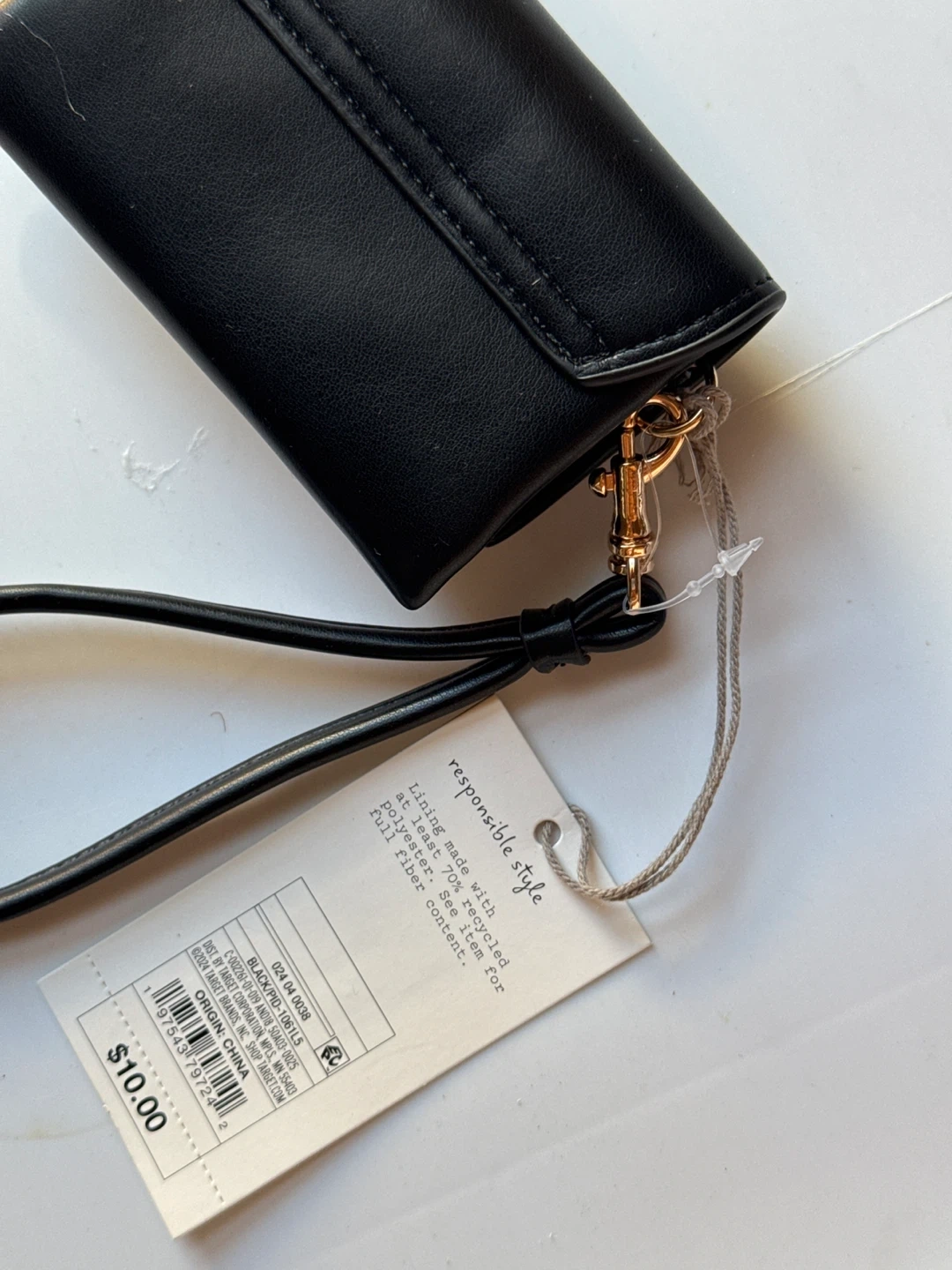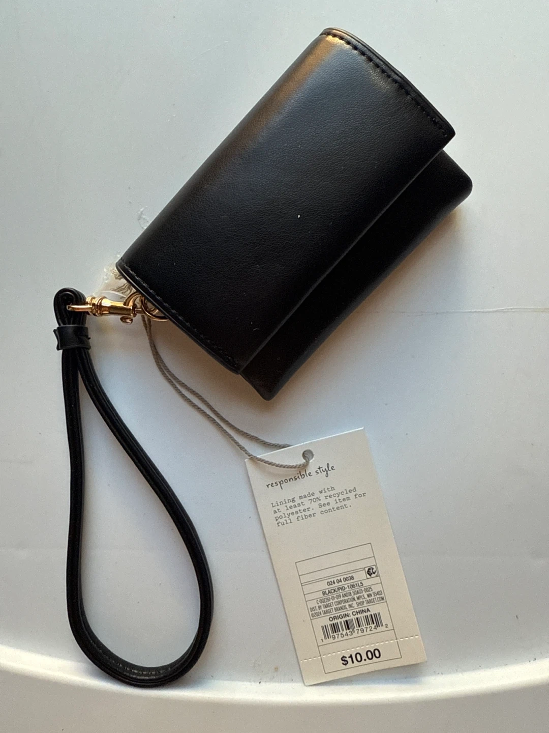 This black wristlet wallet is made with a lining composed of at least 70% recycled polyester. It features a secure zip pocket inside. It's a compact accessory for your essentials.