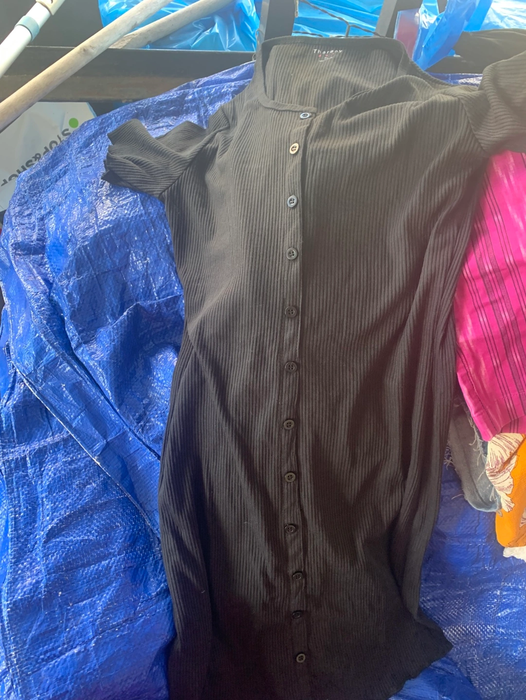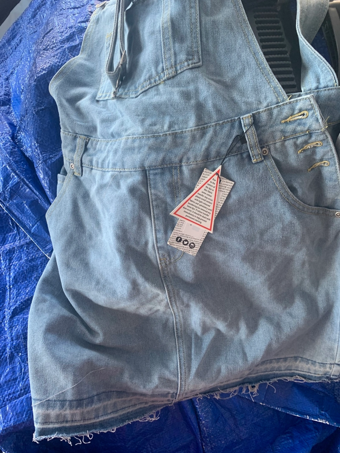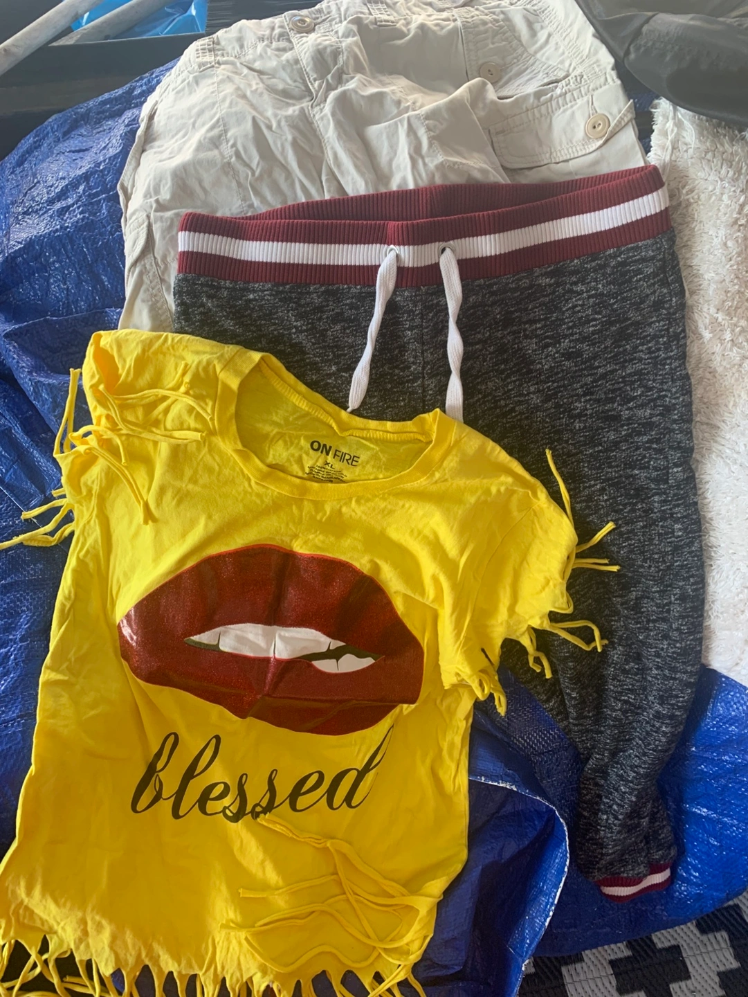 Bundle includes a black button up dress, yellow graphic tee, gray sweatpants, blue velour sweatpants, ripped denim shorts, and a denim overall skirt.