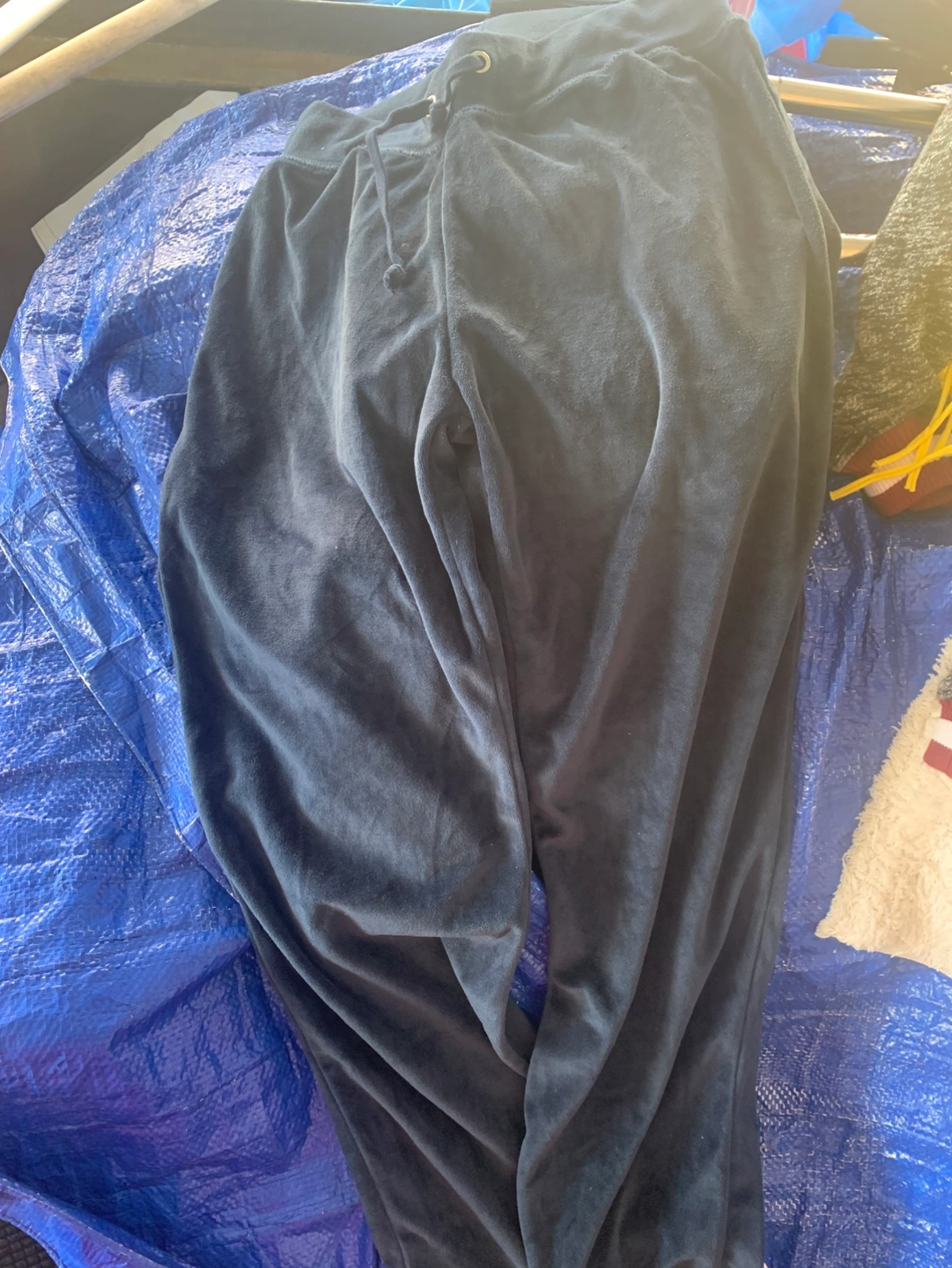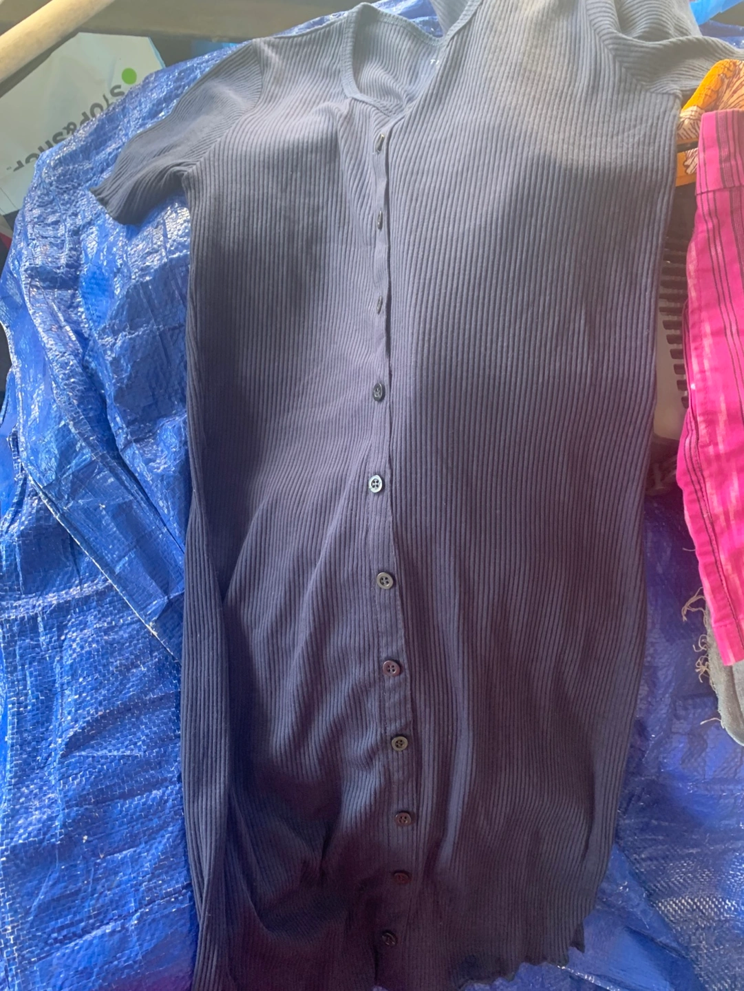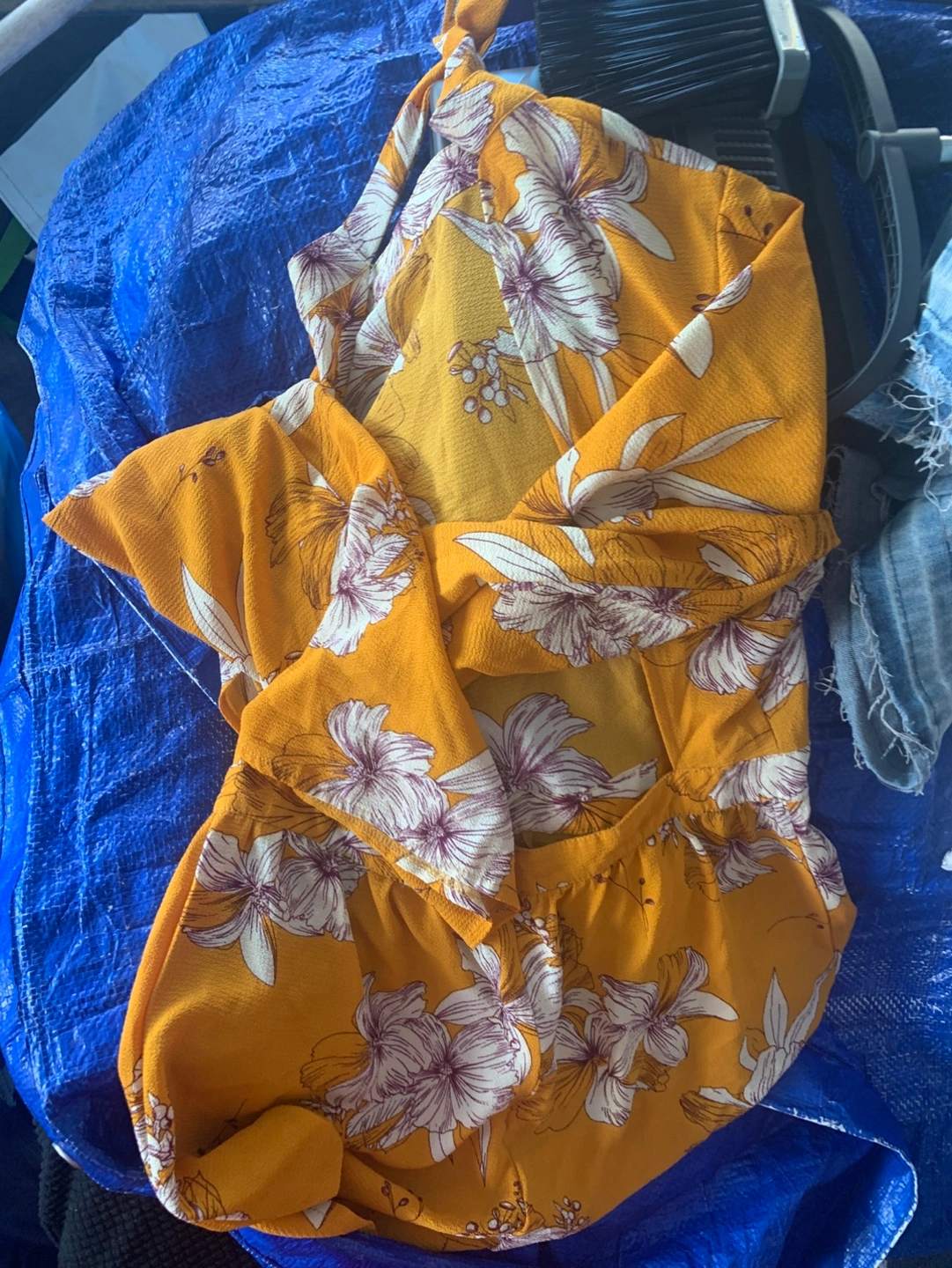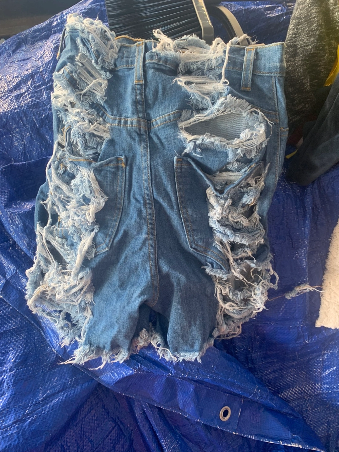 Bundle includes a black button up dress, yellow graphic tee, gray sweatpants, blue velour sweatpants, ripped denim shorts, and a denim overall skirt.