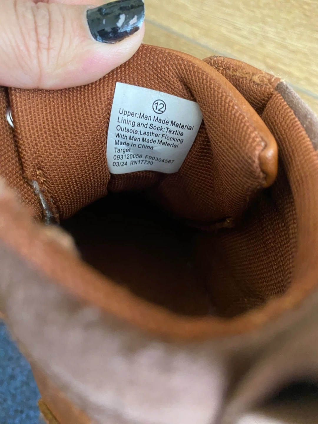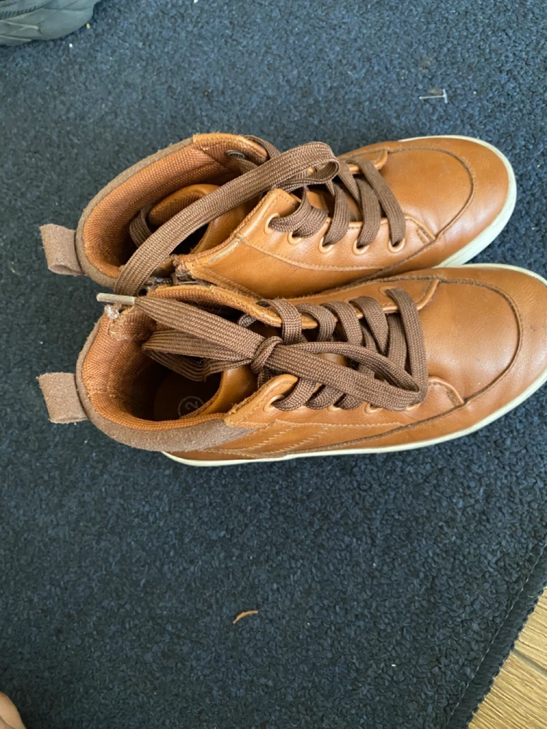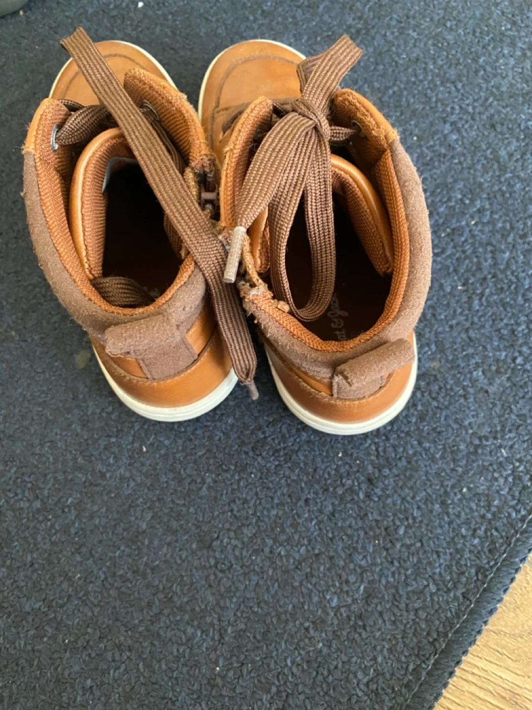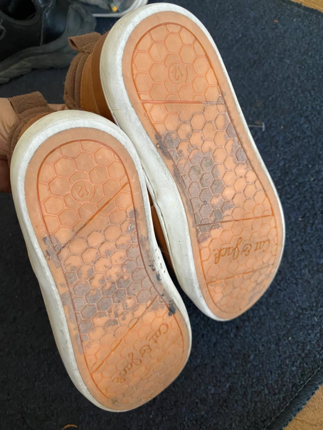 Selling a pair of Cat & Jack sneakers in size 12. They're brown with laces and have a leather-like material. The upper is man-made material, and the lining and sock are textile. The outsole is leather flocking with man-made materials