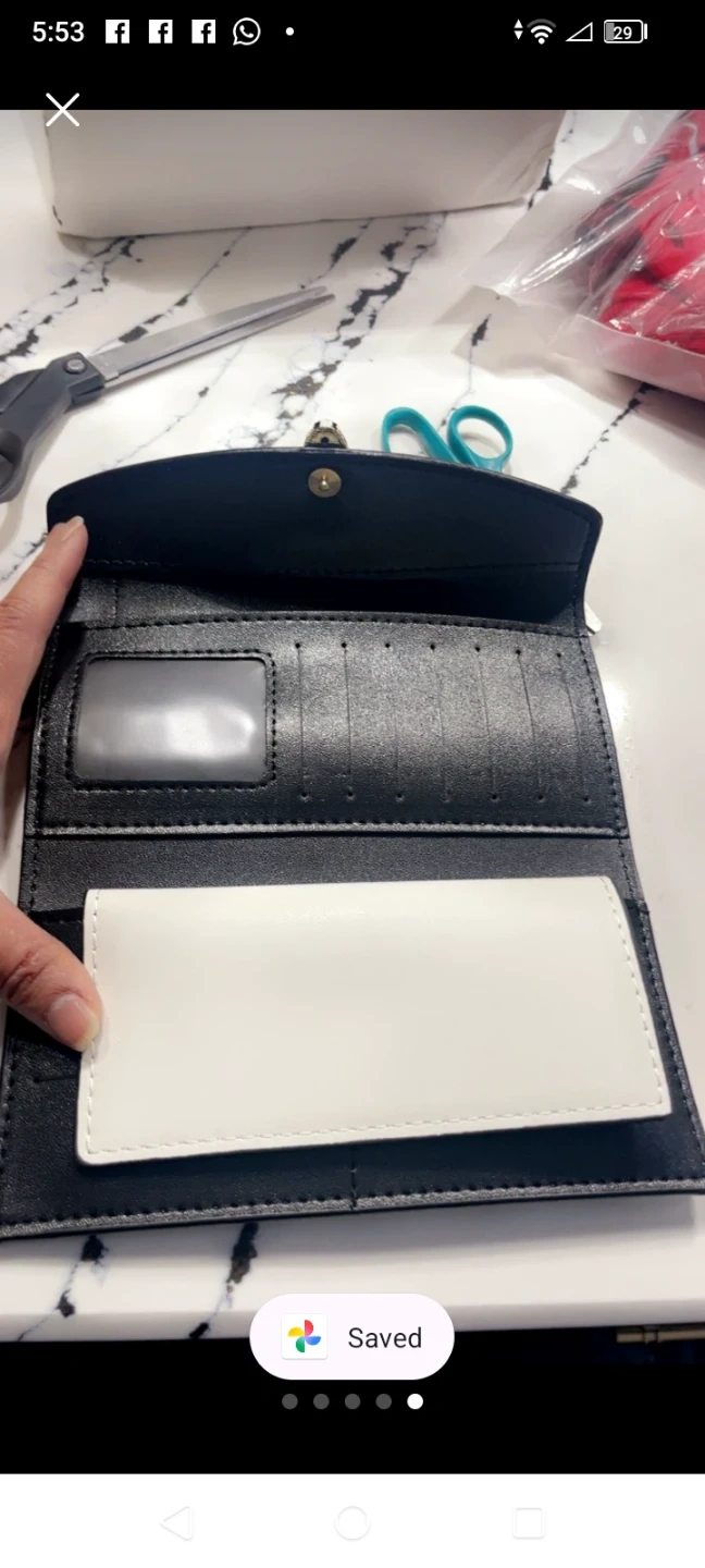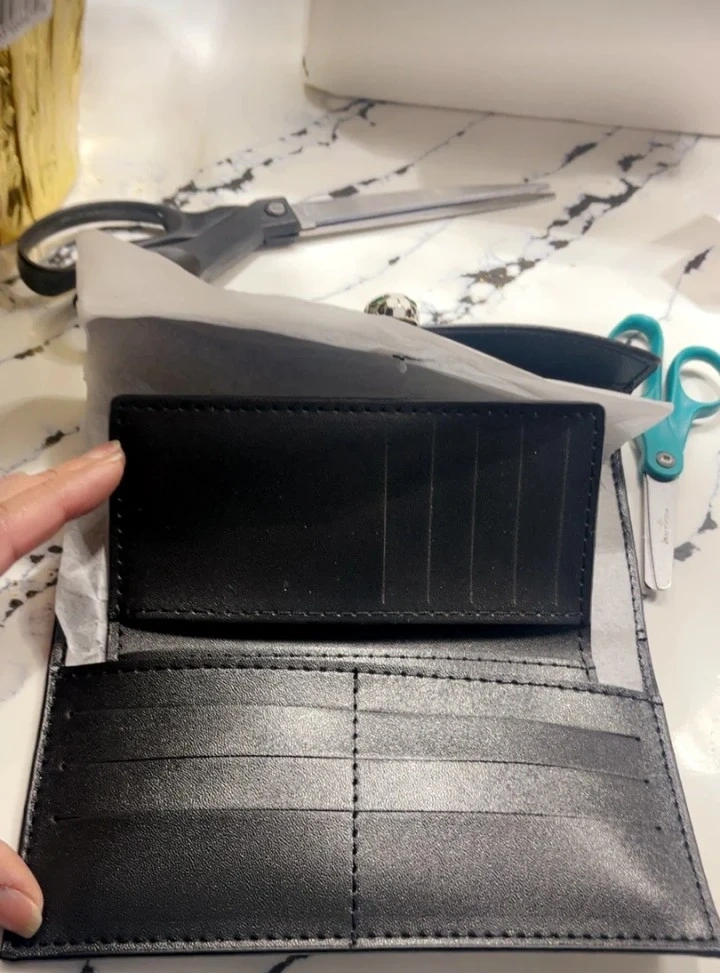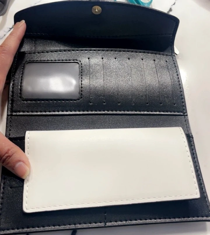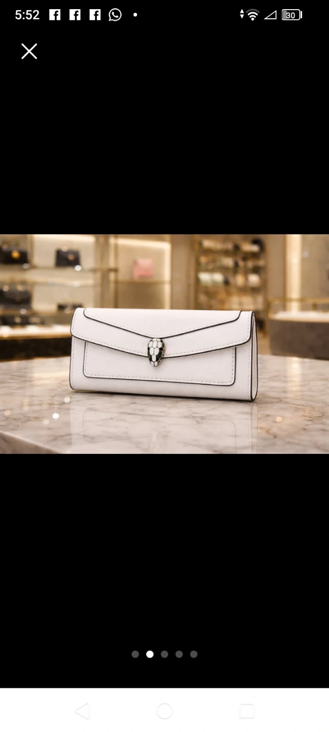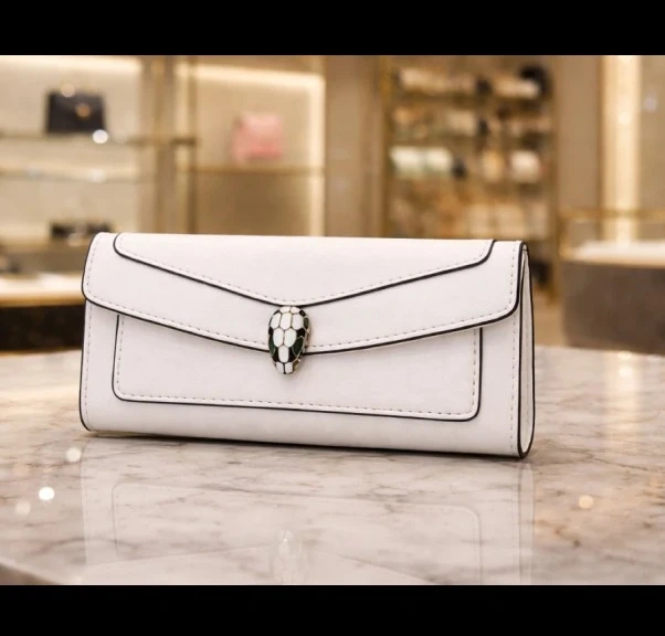 This white clutch wallet features a striking snake-head clasp. It opens to reveal a black interior with multiple card slots and a clear ID window. A removable white cardholder is also included.