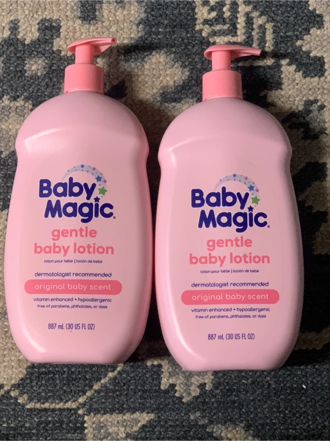Selling two bottles of Baby Magic Gentle Baby Lotion in the original baby scent! This lotion is dermatologist recommended and is vitamin enhanced, hypoallergenic, and free of parabens, phthalates, or dyes. Each bottle contains 887 mL (30 US FL OZ). Price for both. Cash & Pick up in Hell’s Kitchen / Manhattan