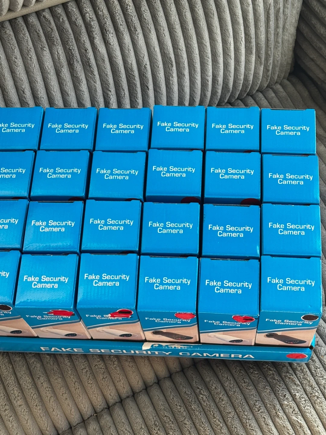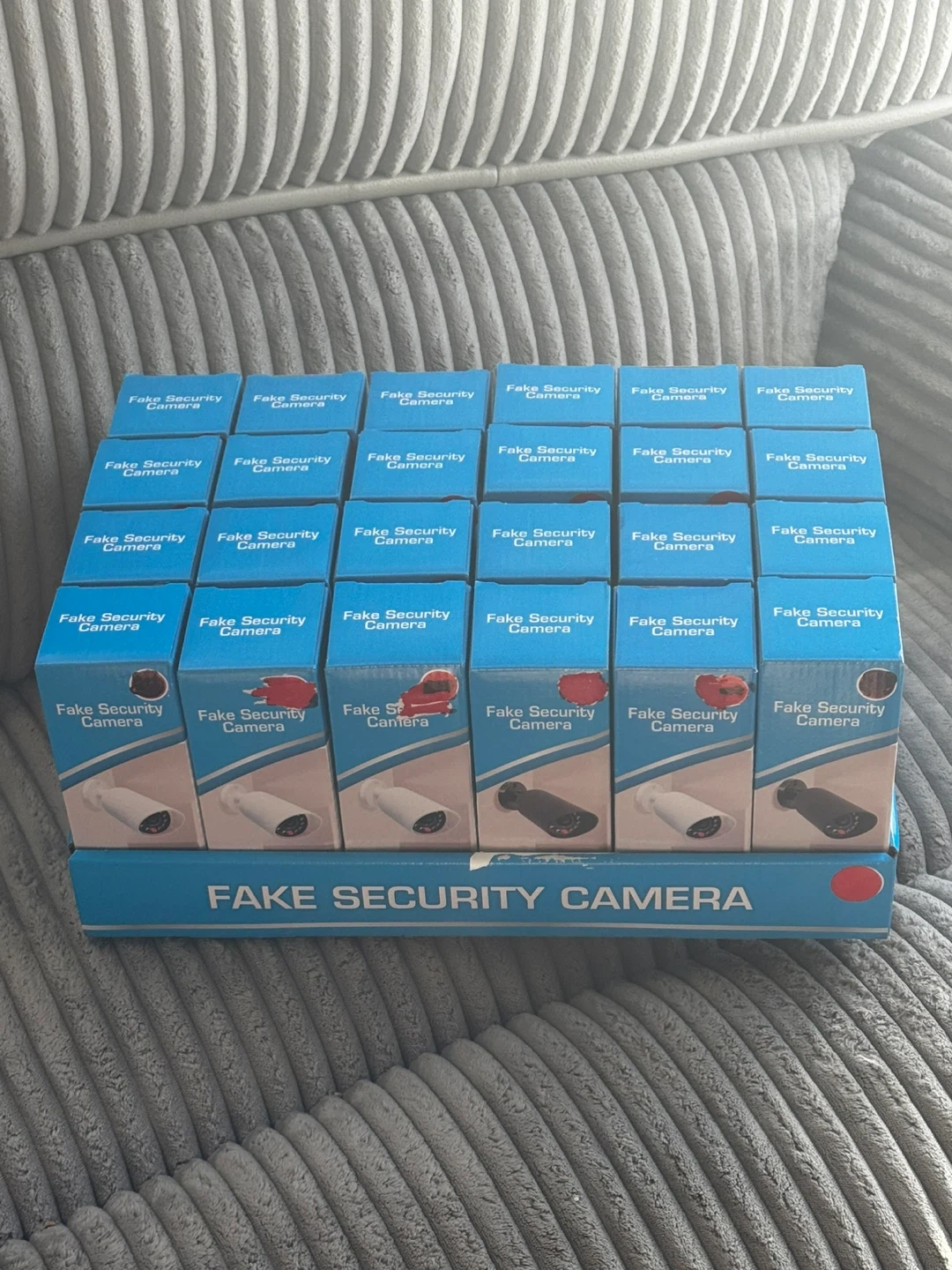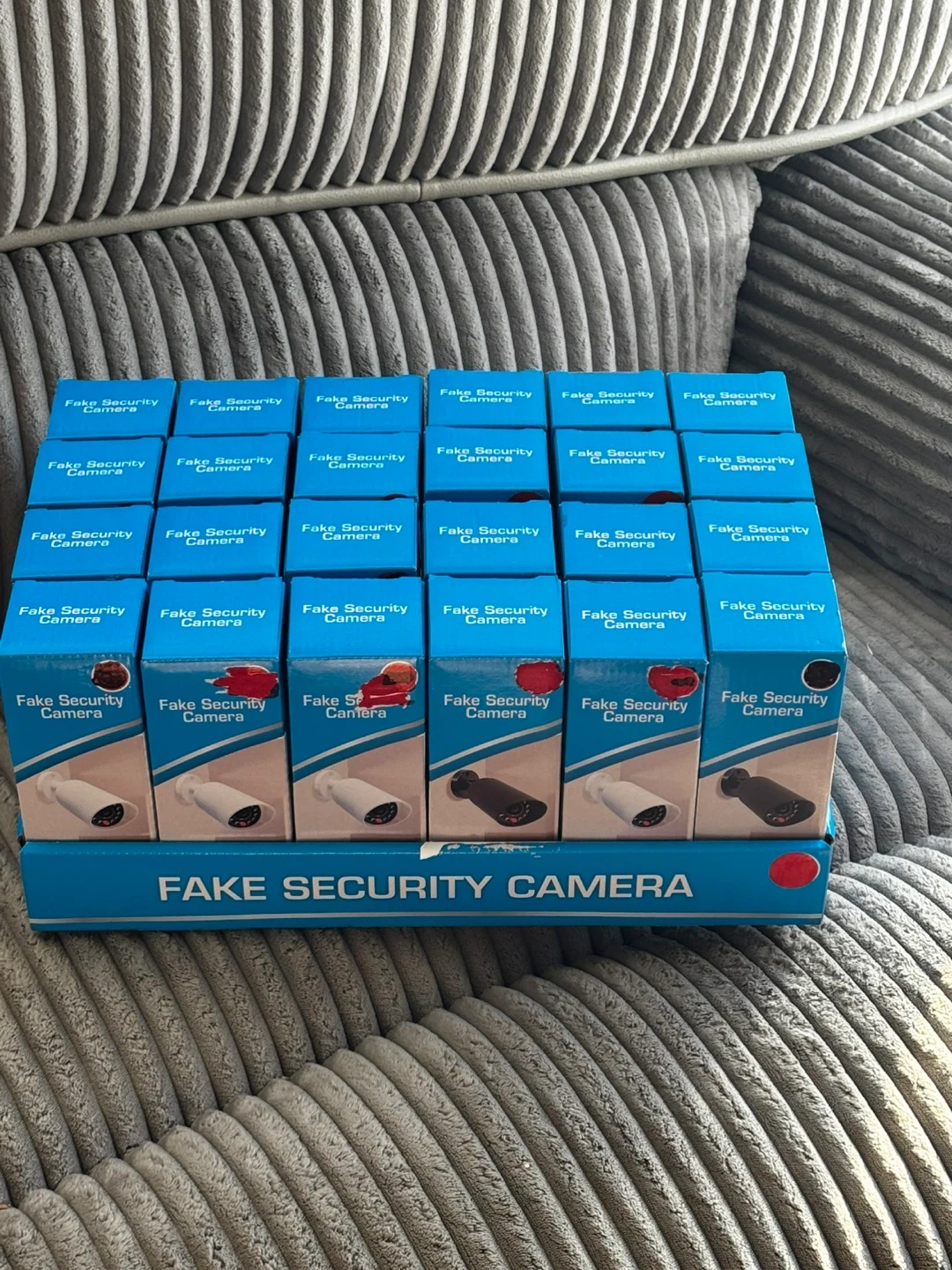 Selling a set of fake security cameras in both white and black. A brand new set of 5 dummy or fake cameras for only $5. Screw then in anywhere you like using two small screws and install 2 AA batteries both not included, to bring on the LED lights and make them look even more modern, real and authentic. No wiring required anywhere and and can be installed and removed anywhere. Give your home or business a real sense of security and stop anyone stealing from you ever again.
