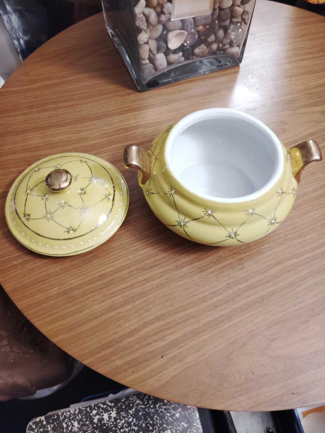 All proceeds go towards an effort into building a Stray Canine Sanctuary and Shelter in Puerto Rico. I'm selling a lovely yellow ceramic serving dish with a lid. It has gold-colored accents on the handles and lid knob. The dish features a delicate star pattern. It would be a beautiful addition to any table setting!