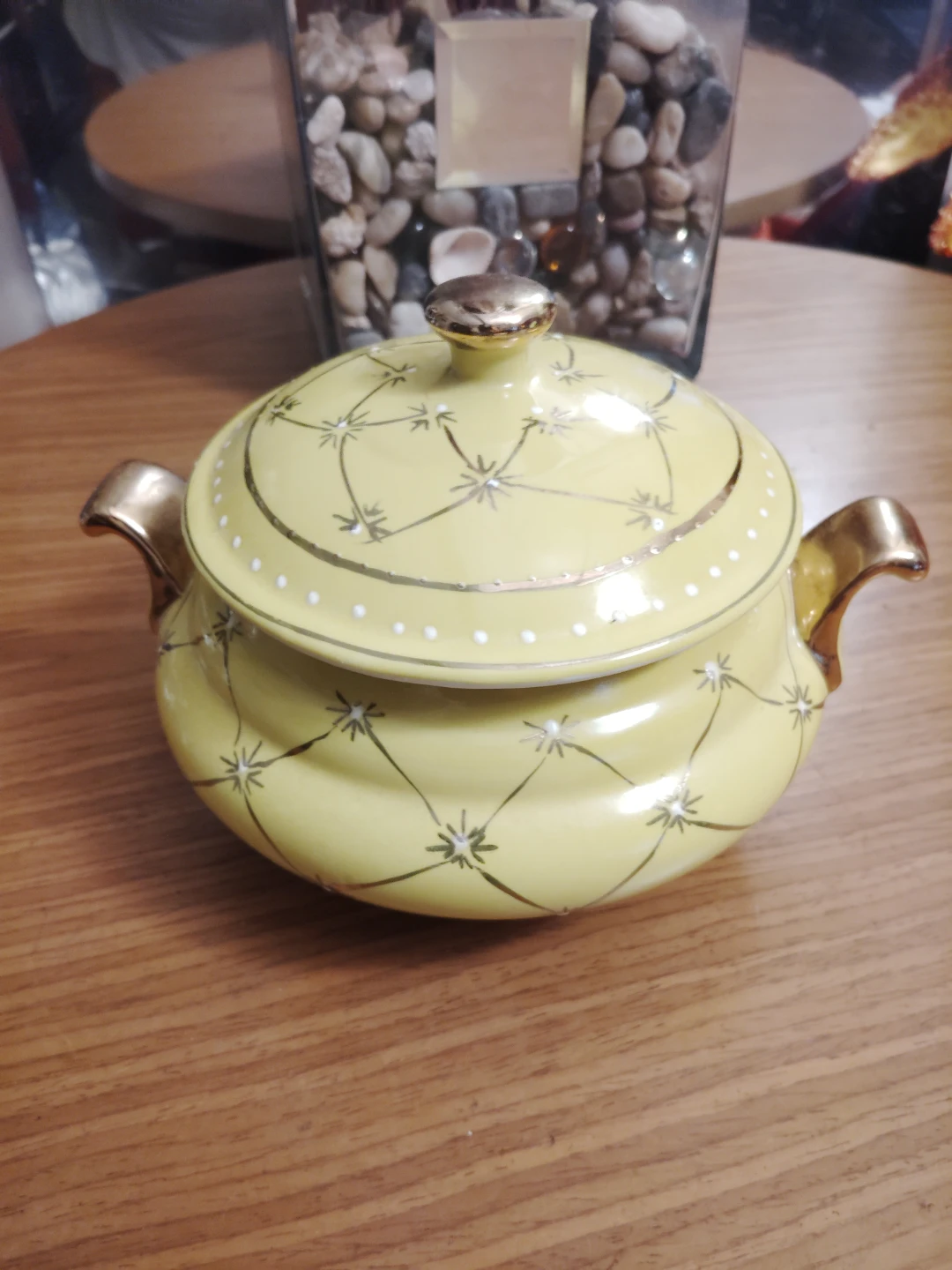 All proceeds go towards an effort into building a Stray Canine Sanctuary and Shelter in Puerto Rico. I'm selling a lovely yellow ceramic serving dish with a lid. It has gold-colored accents on the handles and lid knob. The dish features a delicate star pattern. It would be a beautiful addition to any table setting!