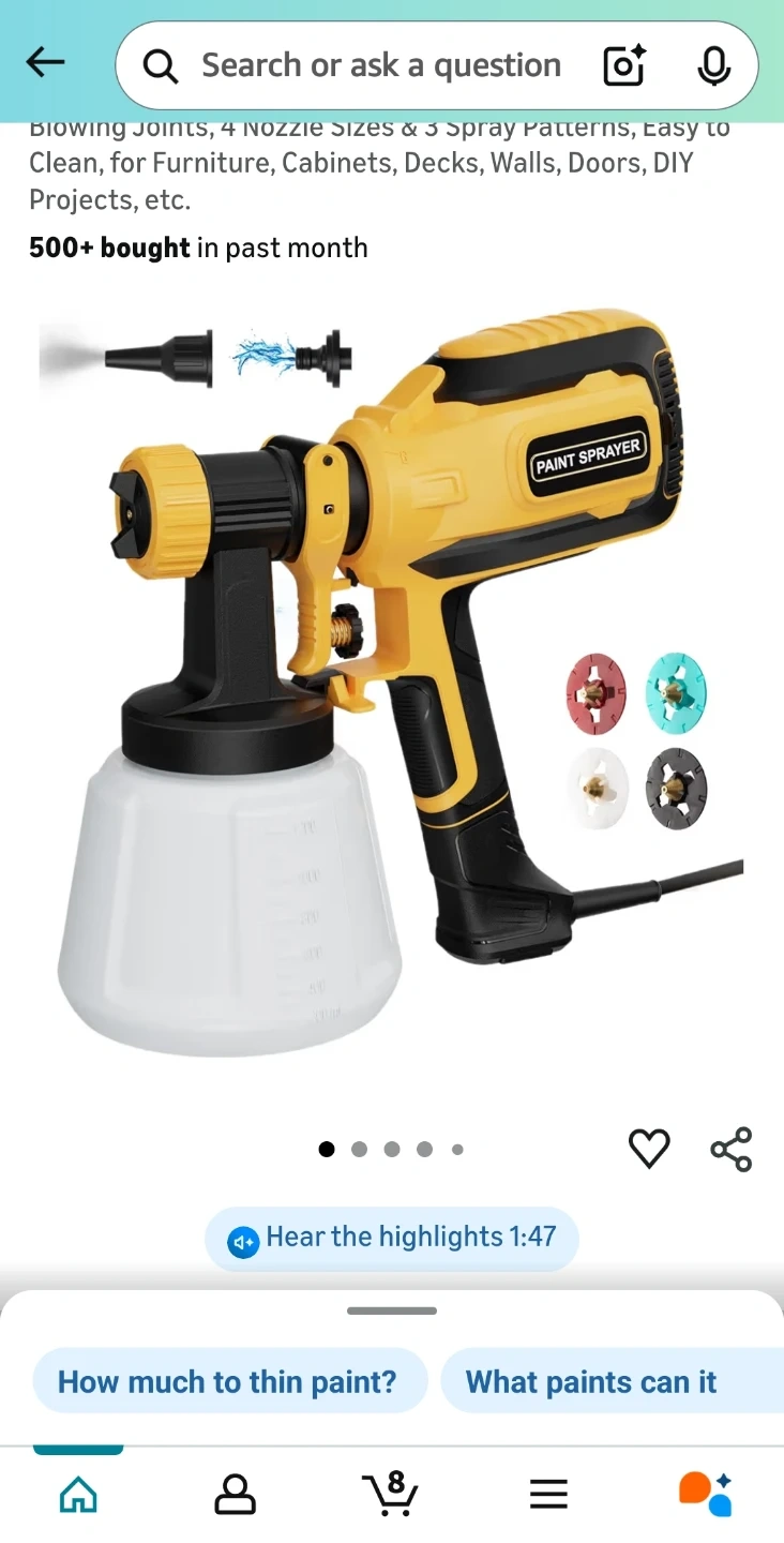 85I'm selling a paint sprayer that's perfect for furniture, cabinets, decks, walls, doors, and DIY projects! It comes with 4 different nozzle sizes for various spray patterns and is easy to install and remove. The smaller the nozzle size, the smoother the paint finish!